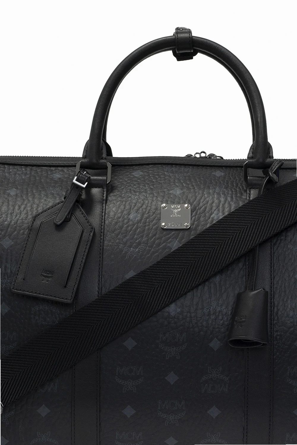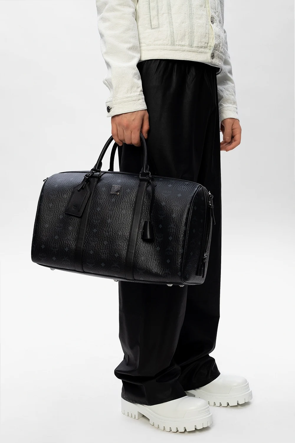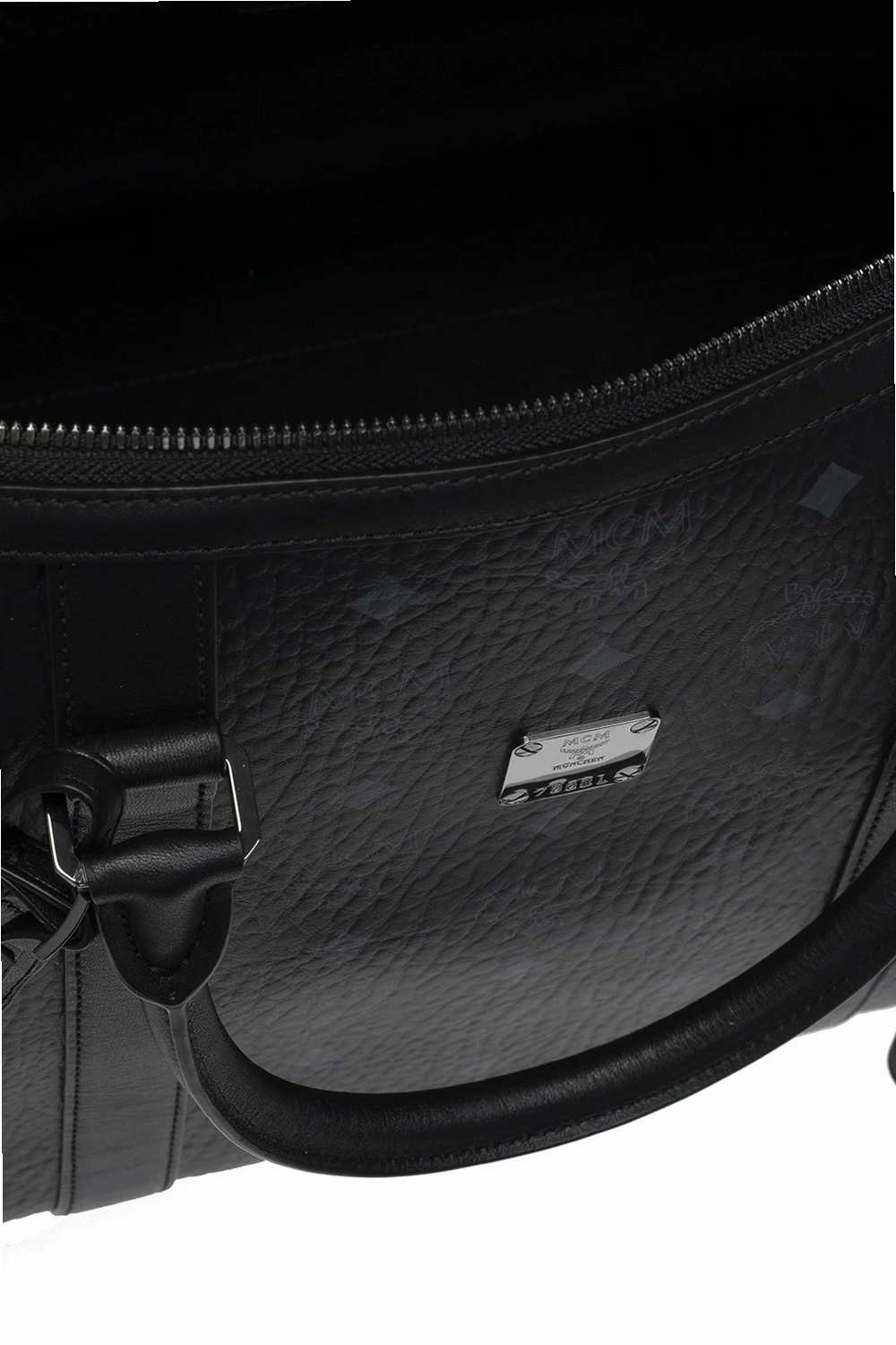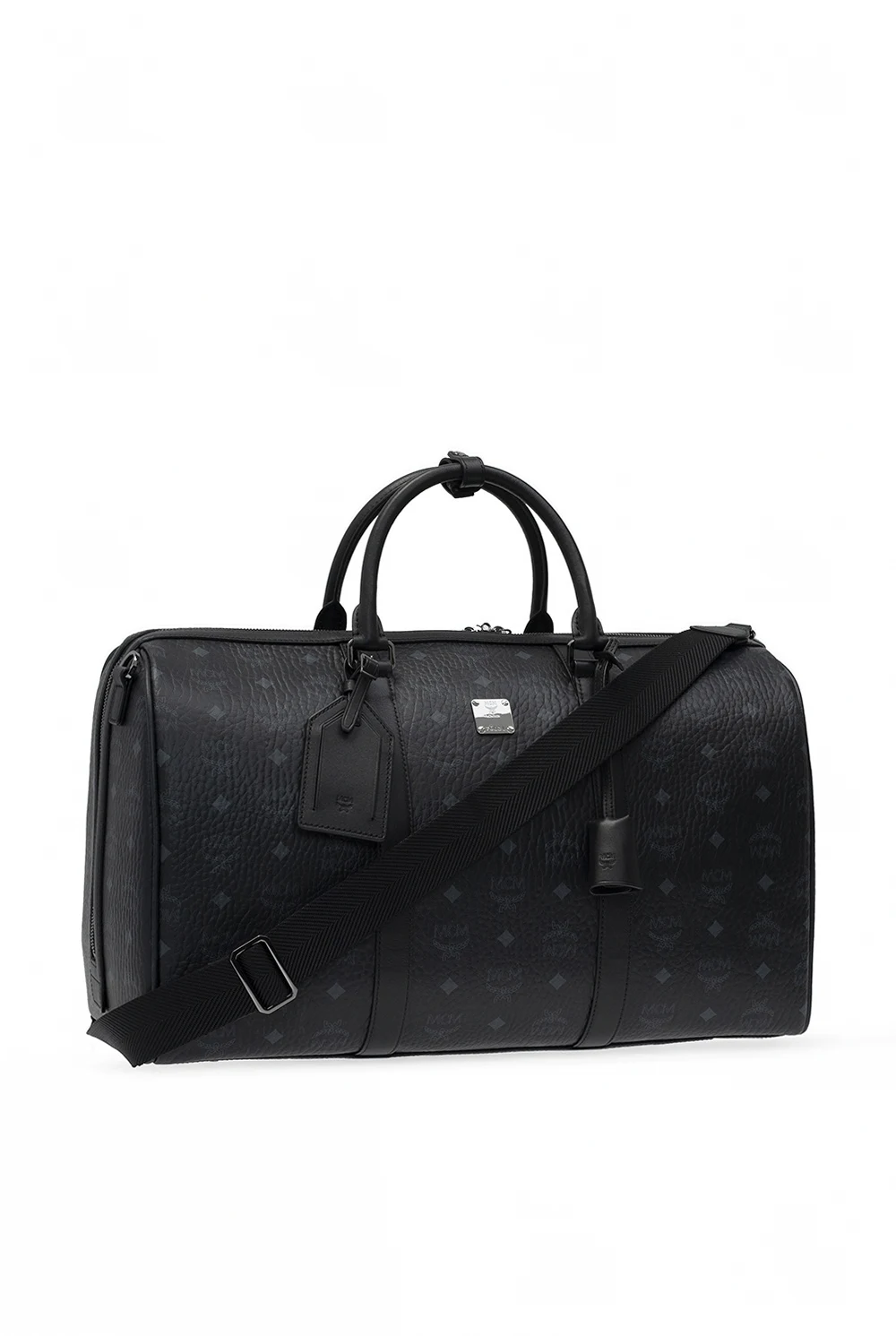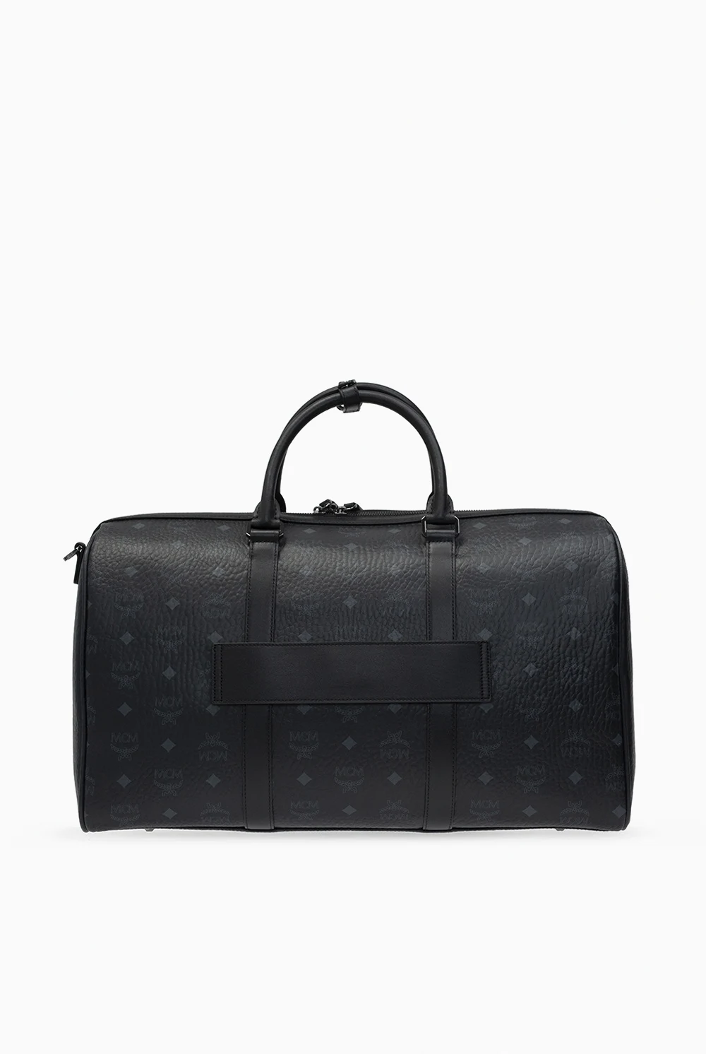 Czarna torba podręczna MCM. Zamykana na dwubiegunowy zamek. Ozdobiona wzorem oraz aplikacją z logo w kolorze szarym. Dwie półokrągłe rączki. Pas na ramię z możliwością regulowania długości. Wewnątrz komora, kieszeń zamykana na zamek oraz dwie wsuwane. Metalowe wykończenie w kolorze czarnym.