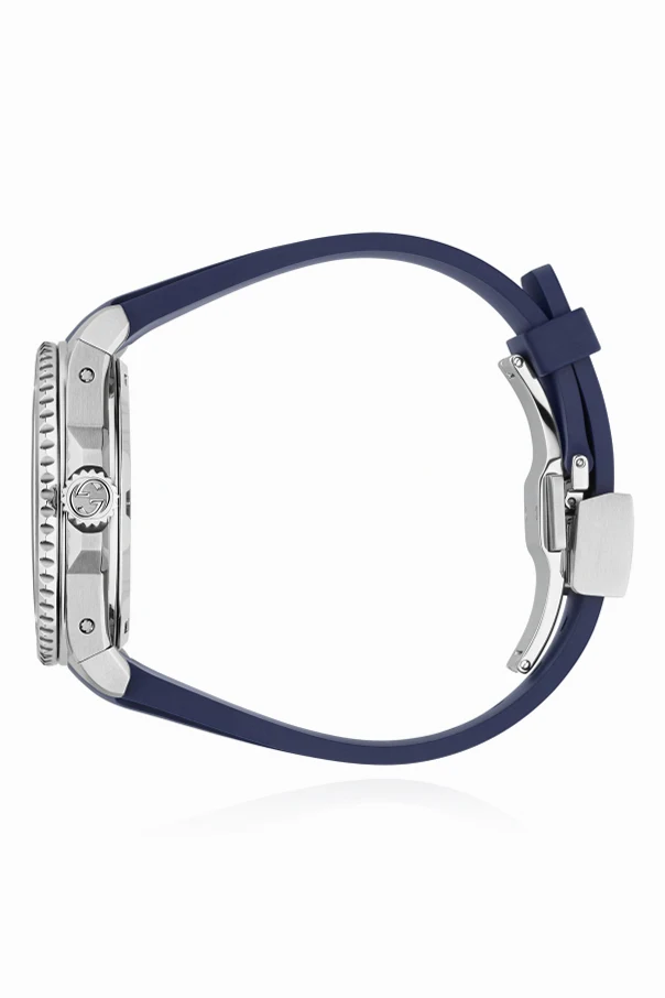 Granatowy pasek z kauczuku, ozdobiony wytłoczonym napisem "GUCCI", zapewnia komfort noszenia, natomiast stalowe zapięcie z wygrawerowanym logo dodaje mu prestiżu. Koperta o średnicy 40 mm, wykonana ze stali nierdzewnej, jest nie tylko elegancka, ale i odporna na korozję.