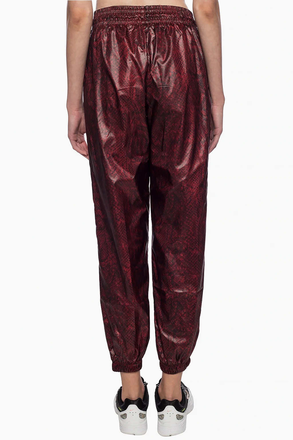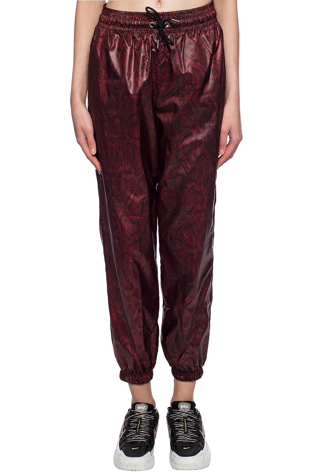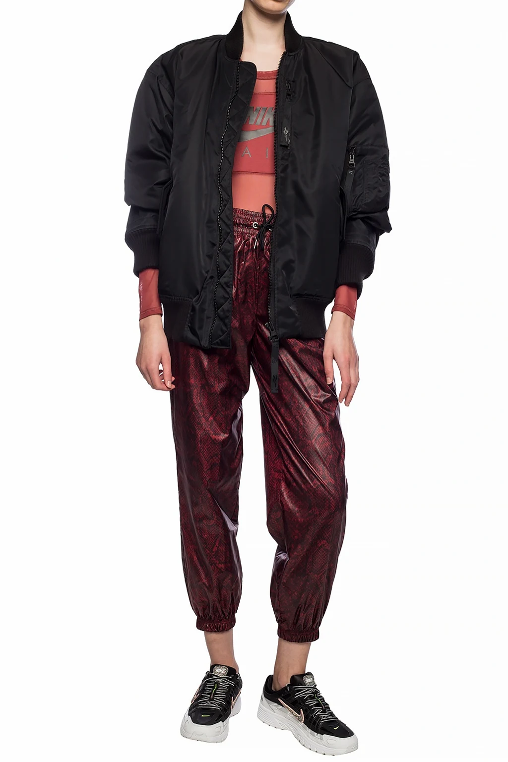 Bordowo-czarne, ortalionowe spodnie dresowe Nike. W pasie ściągane trokami. Ozdobione wzorem z motywem węża. Z przodu nadrukowane logo w kolorze czarnym. Po bokach dwie wsuwane kieszenie. Nogawki zakończone ściągaczami. Od wewnątrz wykończone siatką.