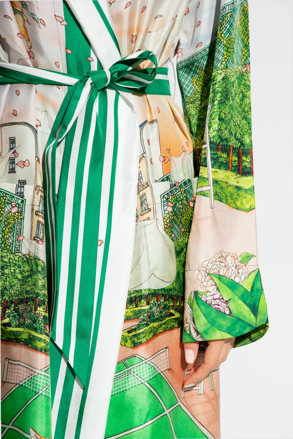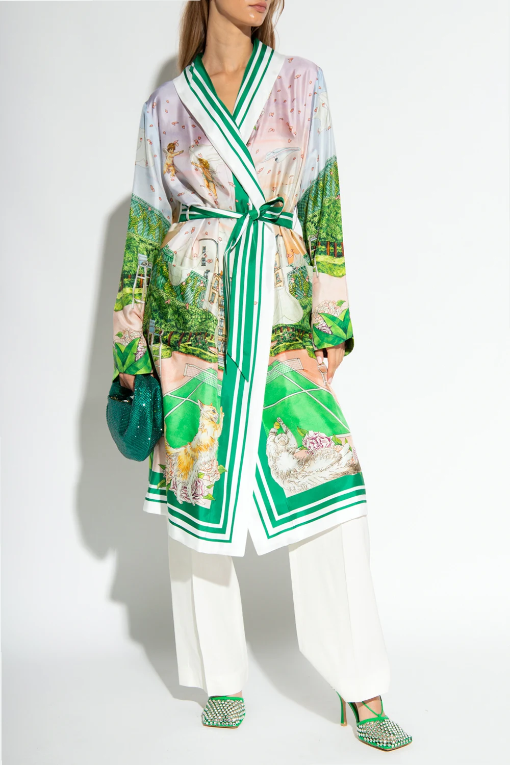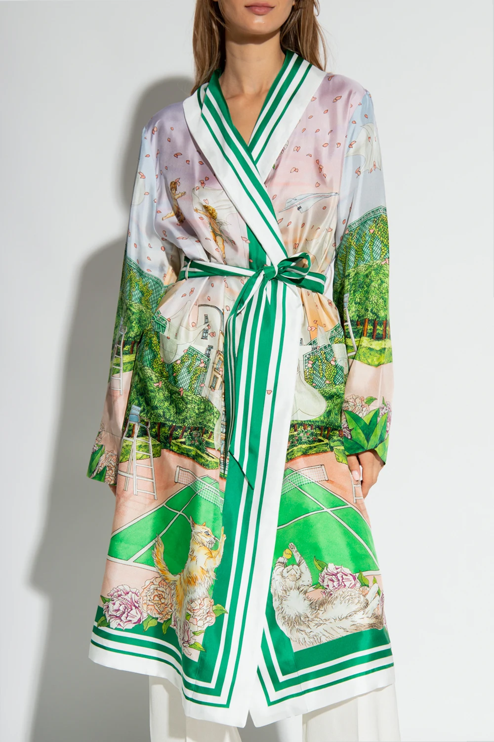 Kolorowy szlafrok Casablanca. Wykonany z jedwabiu. Wiązany trokami. Ozdobiony wzorem ‘Tennis Club Prive’. Dwie wsuwane kieszenie. Długie rękawy.