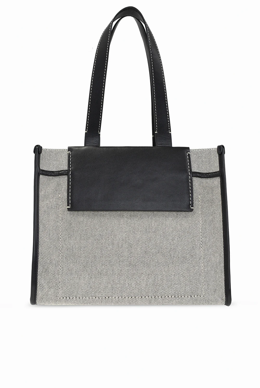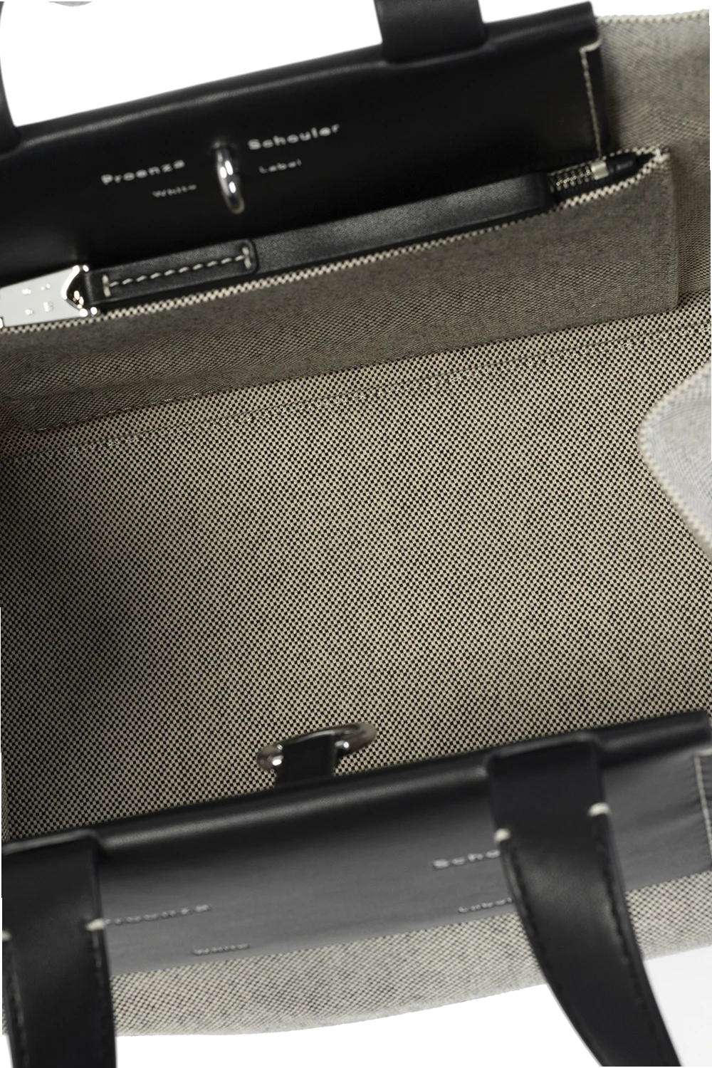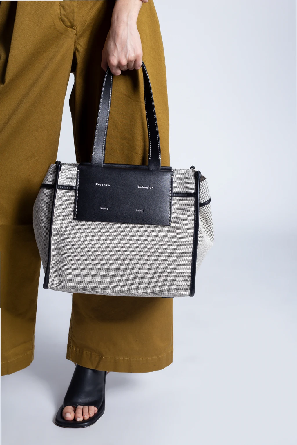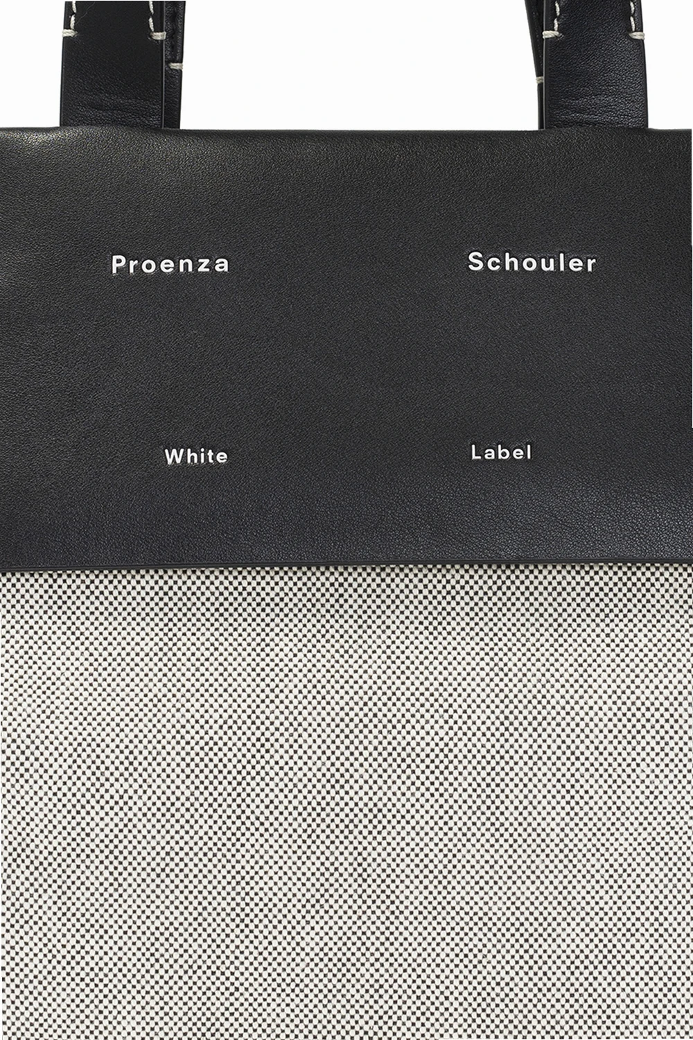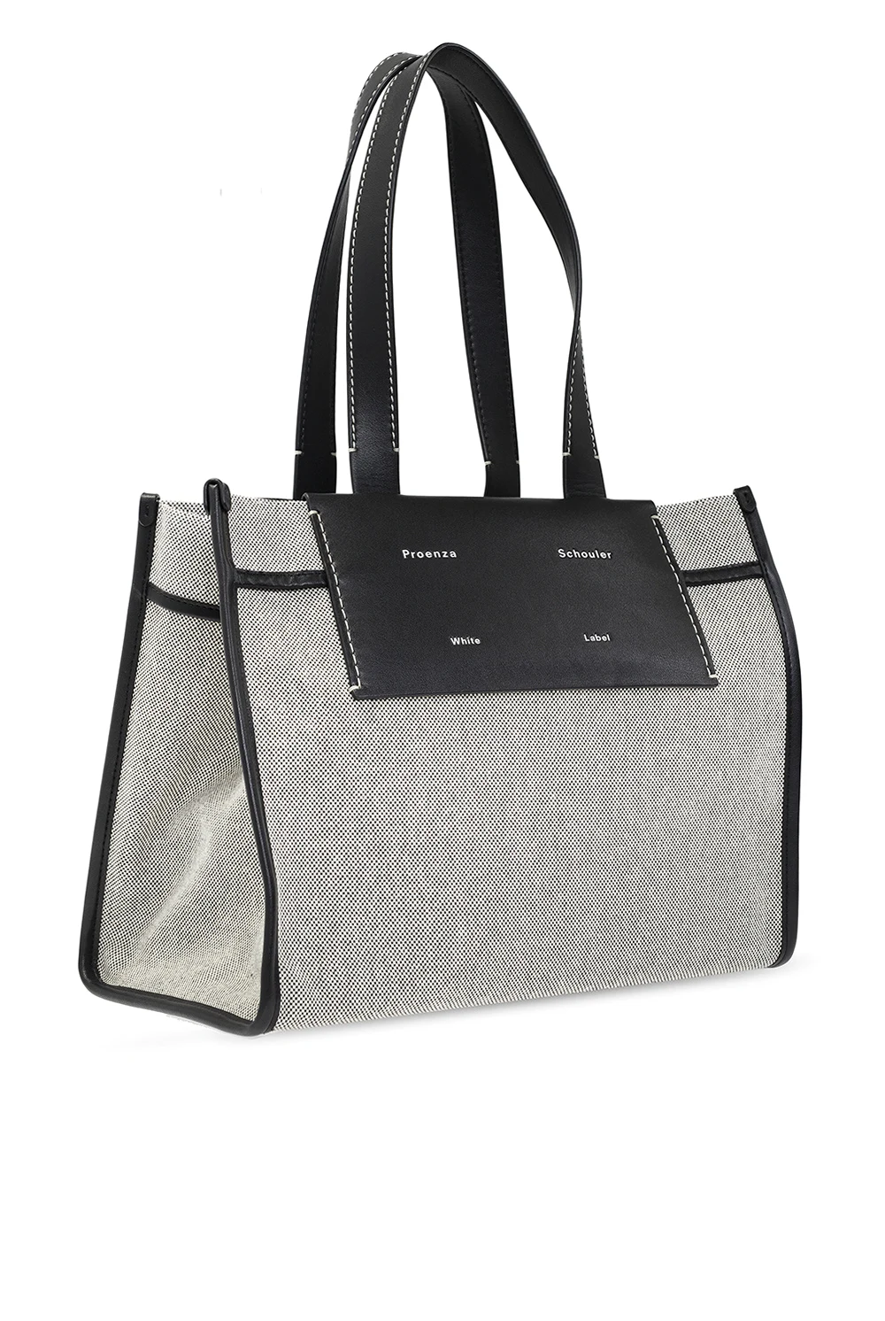 Kremowo-czarna torba typu ‘shopper’, model ‘Morris Large’ Proenza Schouler White Label. Wykończona skórą. Zamykana na karabińczyk. Z przodu wytłoczone logo w kolorze białym. Dwie półokrągłe rączki. Wewnątrz komora, wsuwana kieszeń oraz kieszeń zamykana na zamek. Metalowe elementy w kolorze srebrnym.