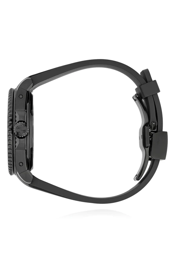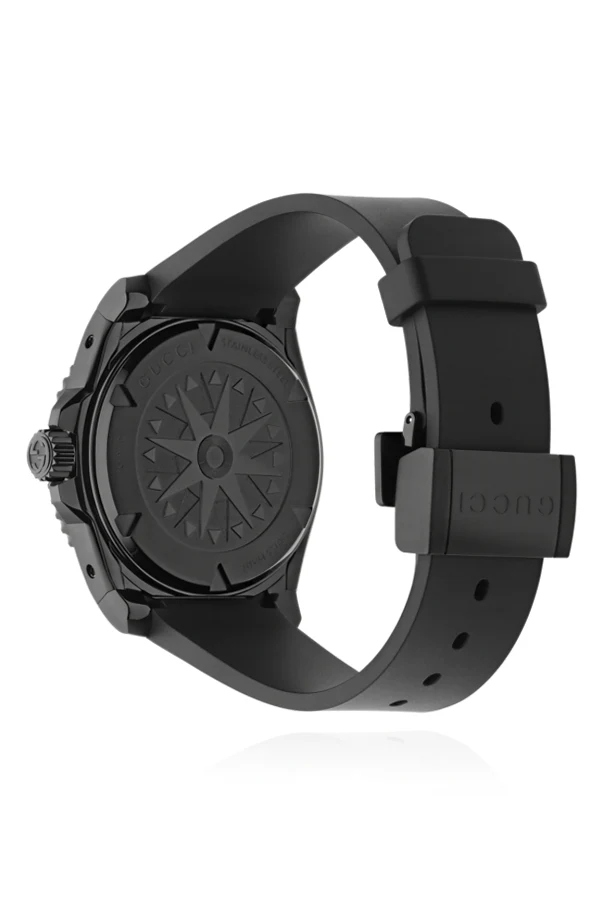 Przedstawiamy Zegarek na gumowym pasku marki Gucci, który zachwyca swoją sportową elegancją i nowoczesnym designem. Jego czarna koperta oraz pasek tworzą harmonijną kompozycję z tarczą, gdzie wyraziste białe wskaźniki i subtelne czerwone akcenty nadają niepowtarzalnego charakteru.