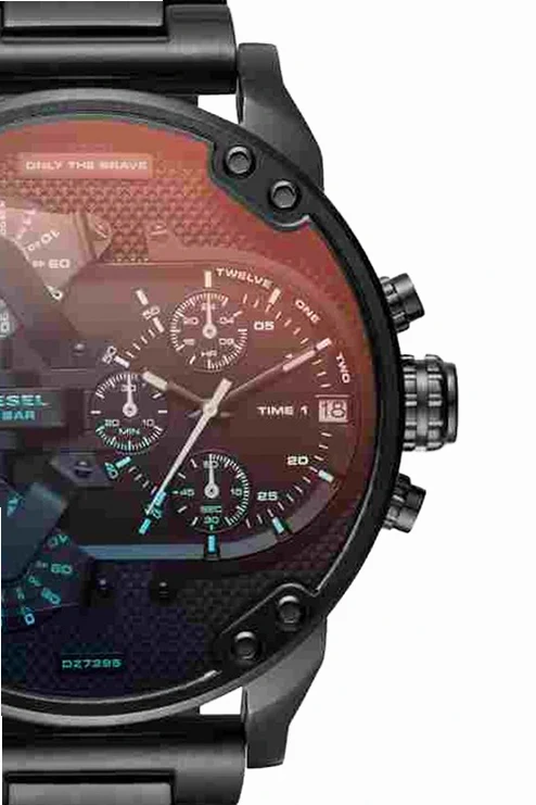 Wielopoziomowa, rozbudowana tarcza z kilkoma mniejszymi cyferblatami pozwala śledzić czas w różnych strefach oraz obsługiwać zaawansowane funkcje chronografu. Ekskluzywny charakter podkreślają precyzyjne detale: logo „DIESEL”, numer seryjny modelu oraz kultowy napis marki w lewym górnym rogu tarczy.