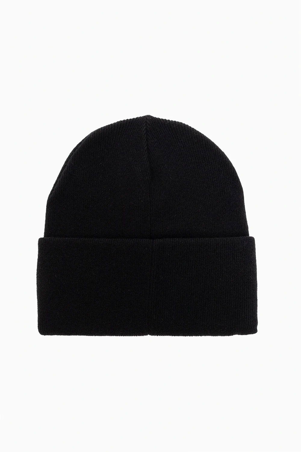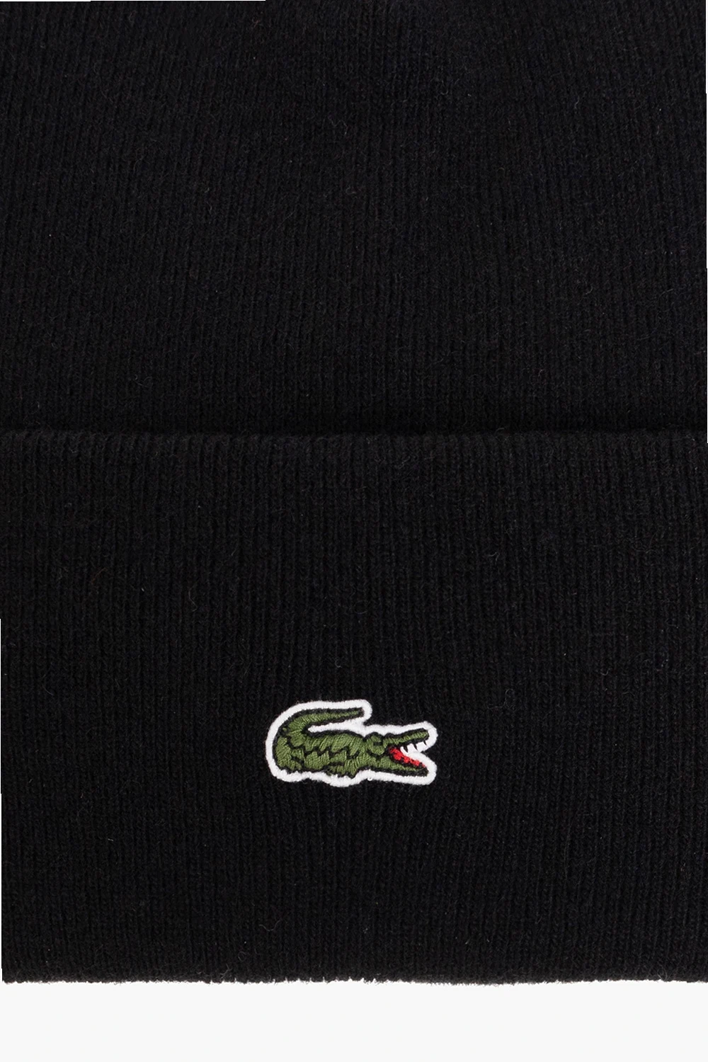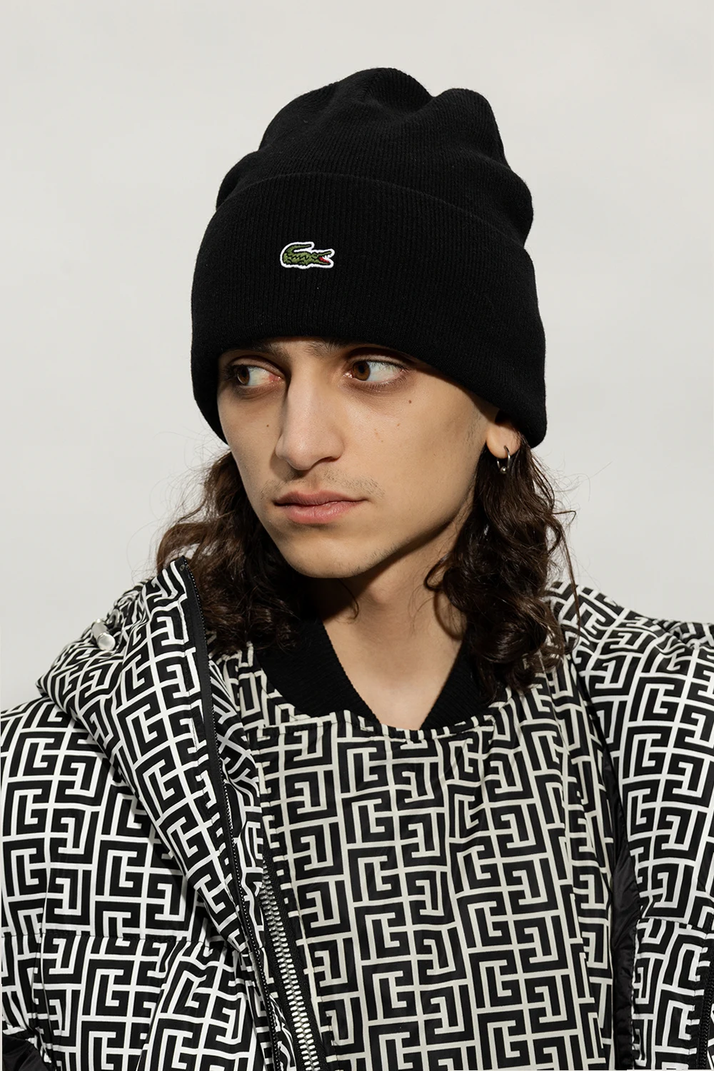 Czarna czapka Lacoste. Wykonana z mieszanki wełny. Z przodu ozdobiona naszywką w kształcie logo.