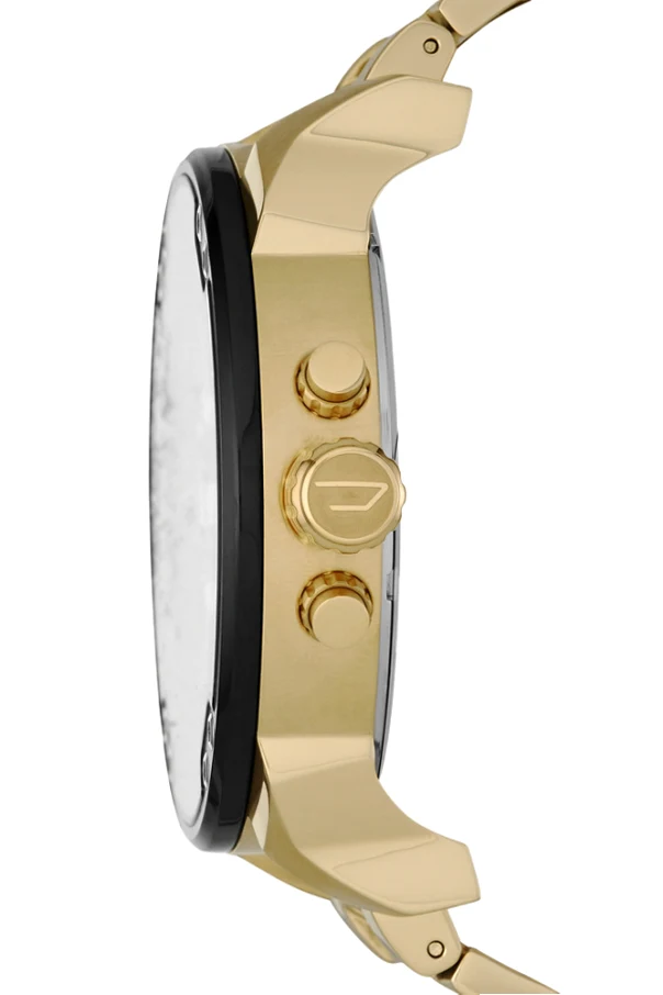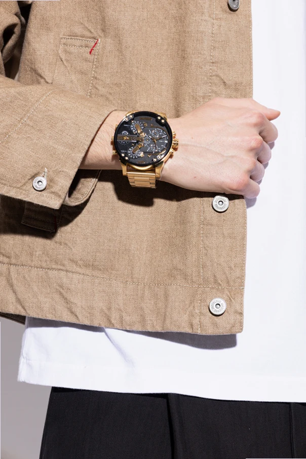 Stalowy zegarek Spiked projektu Diesel to wyjątkowy manifest siły i wyrafinowania. Jego okrągła, masywna koperta oraz wyraziste przyciski i koronka przyciągają wzrok, podkreślając industrialny charakter czasomierza. Na czarnej, wielopoziomowej tarczy znajdują się liczne sub-tarcze oraz precyzyjne wskaźniki, co w połączeniu z wyodrębnionymi strefami czasowymi tworzy harmonijną kompozycję zaawansowania i elegancji. Całość, wykonana ze stali nierdzewnej , została utrzymana w złotym kolorze o szczotkowanym wykończeniu, a masywna bransoleta zachwyca szerokimi ogniwami i ozdobnym logo projektanta.
