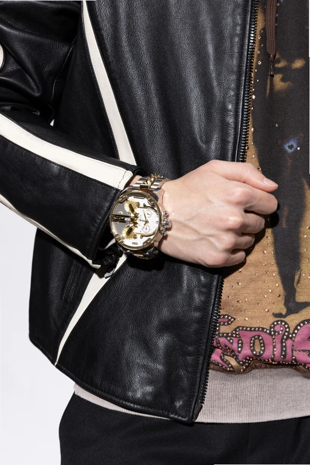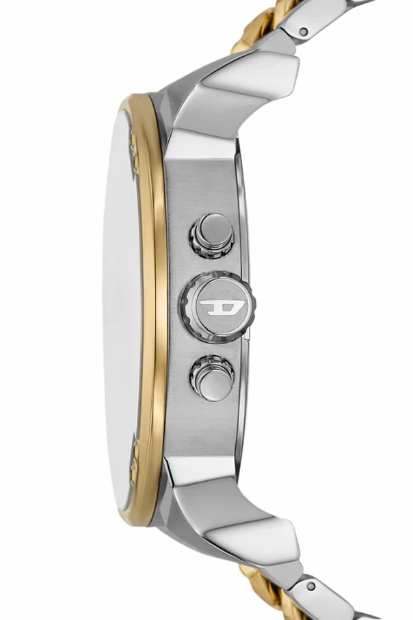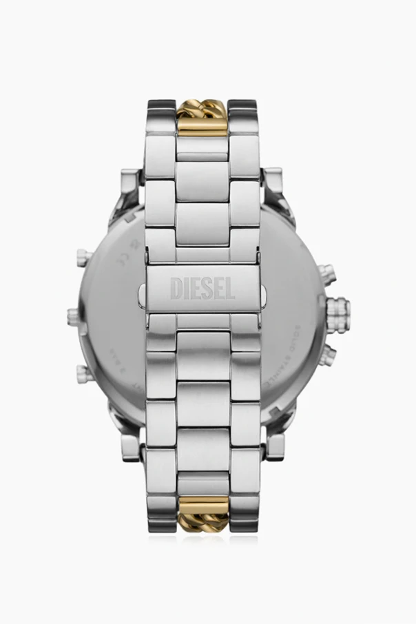 Zegarek wykonano z najwyższej jakości stali nierdzewnej w odcieniu srebrnym , harmonijnie połączonej z subtelnymi detalami w kolorze złotym. Wyraźne śrubki na froncie koperty, logo DIESEL na tarczy i bransolecie oraz oryginalny motyw złotych ogniw czynią ten model niepowtarzalnym. Zakręcane przyciski funkcyjne i ozdobna koronka wieńczą całość, gwarantując niezawodność oraz doskonałe wykończenie.