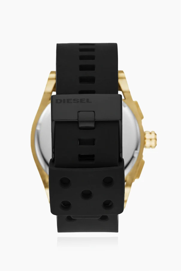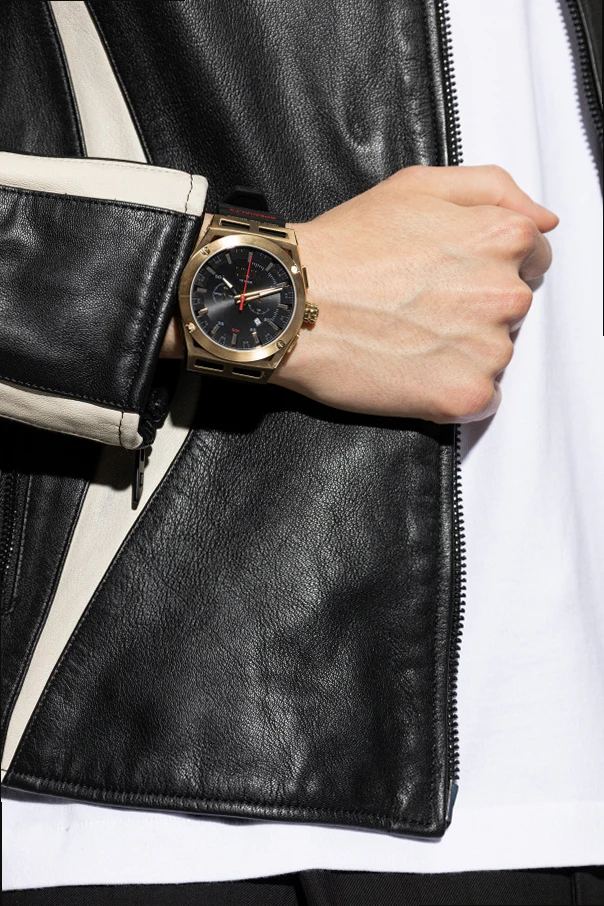 Głęboka, czarna tarcza olśniewa kontrastowymi, złotymi indeksami oraz wskazówkami. Zintegrowane subtarcze i charakterystyczne czerwone akcenty, takie jak wskazówka sekundowa i oznaczenie „SIX”, wyznaczają unikatowy charakter czasomierza. W górnej części cyferblatu dumnie prezentuje się logo projektanta Diesel.