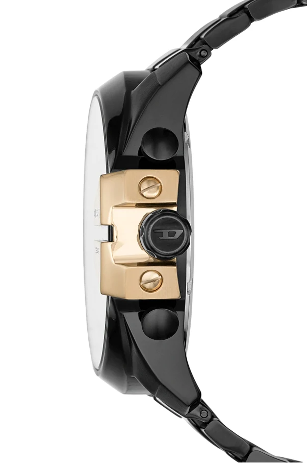 Złote detale—wskazówki, indeksy oraz charakterystyczna nakładka z logo projektanta Diesel—wydobywają szlachetność całego projektu. Trzy mniejsze tarcze chronografu oraz wyraźny datownik nadają czasomierzowi unikatowego wyrazu, a duża cyfra „12” górująca na cyferblacie buduje wrażenie wyrazistości i siły. Wodoodporność na poziomie 10 BAR oraz oznaczenie na koronce świadczą o najwyższej funkcjonalności tego modelu.