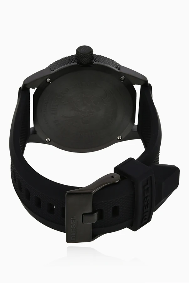 Tarcza wyróżnia się intrygującą, trójwymiarową teksturą po lewej stronie i okazałym, wypukłym numerem „9”, podczas gdy pozostałe elementy zachowują wyważoną matowość oraz minimalistyczne indeksy. Dyskretnie widoczne logo marki DIESEL obecne jest zarówno na tarczy, jak i na zapięciu paska, dopełniając całości ekskluzywnego projektu.