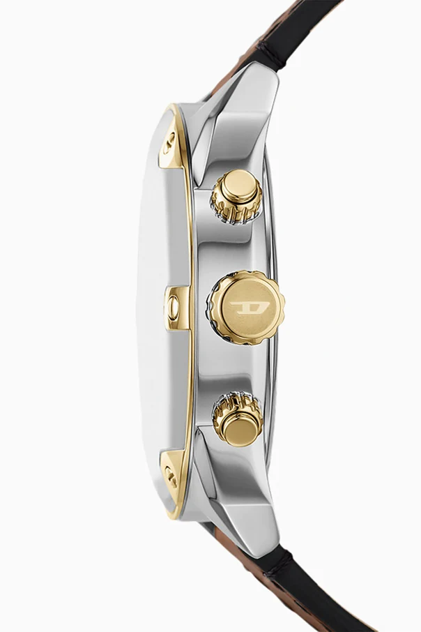 Srebrzysta tarcza, zaakcentowana złotymi indeksami i wskazówkami, prezentuje trzy sub-tarcze chronografu i subtelne okienko datownika. Przy godzinie trzeciej dyskretnie widnieje logo projektanta Diesel oraz oznaczenie odporności na wodę do 5 BAR.
