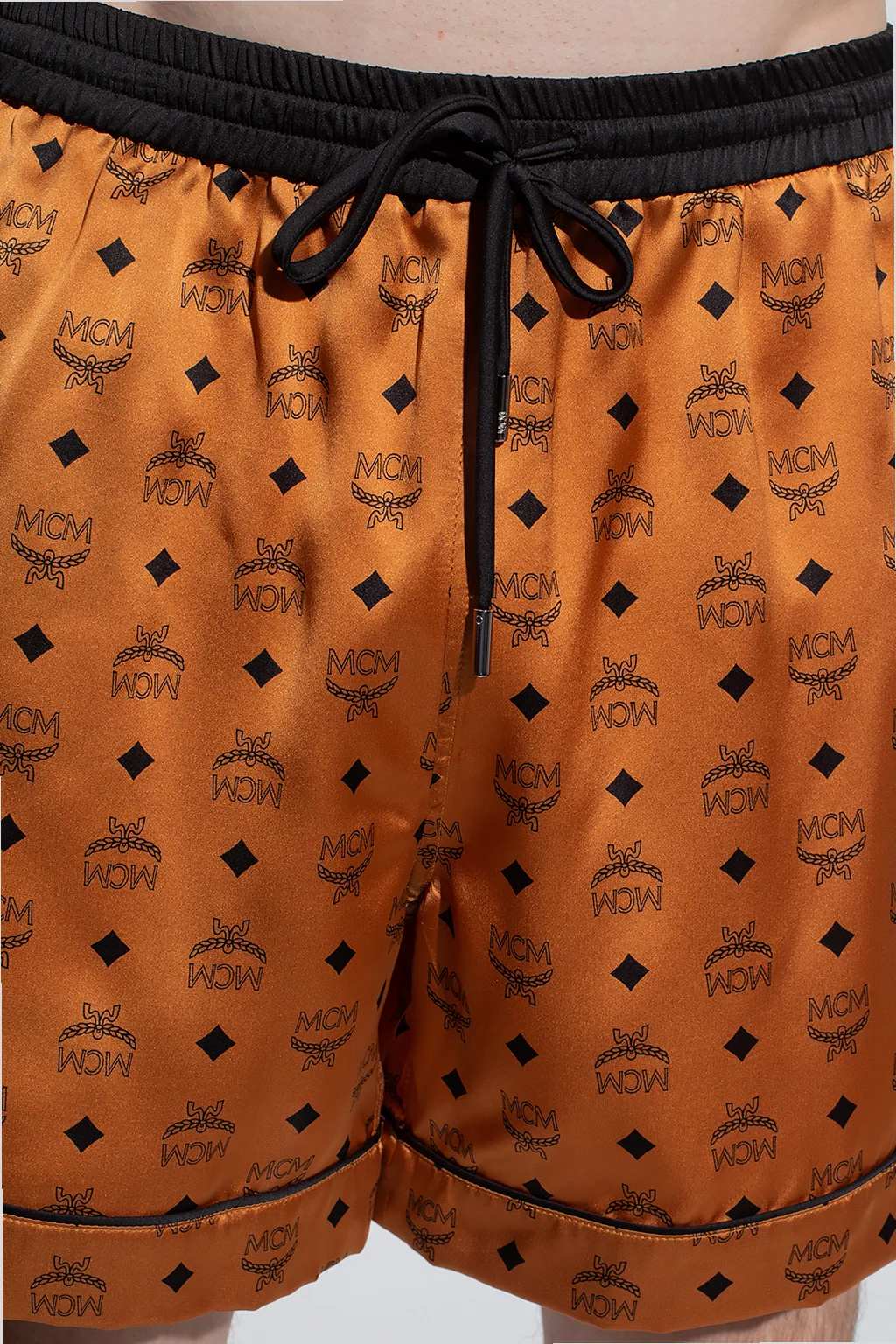 Brązowy dół od piżamy MCM. Wykonany z jedwabiu. W pasie wszyta czarna guma ściągana trokami. Ozdobiony wzorem z monogramem 'Visetos' w kolorze czarnym. Krótkie nogawki.