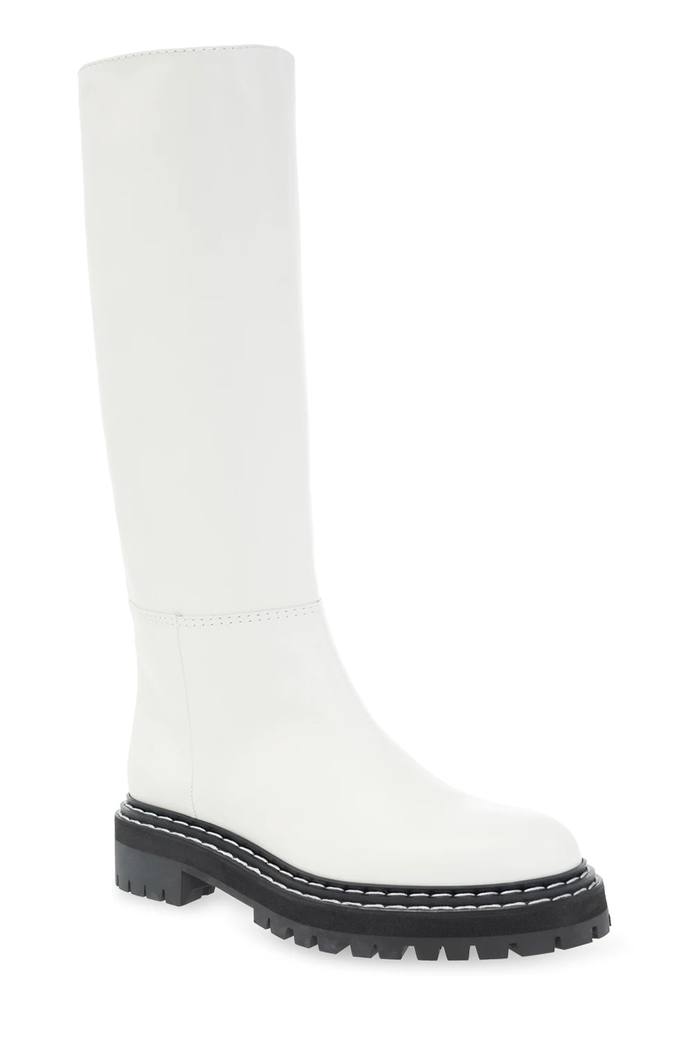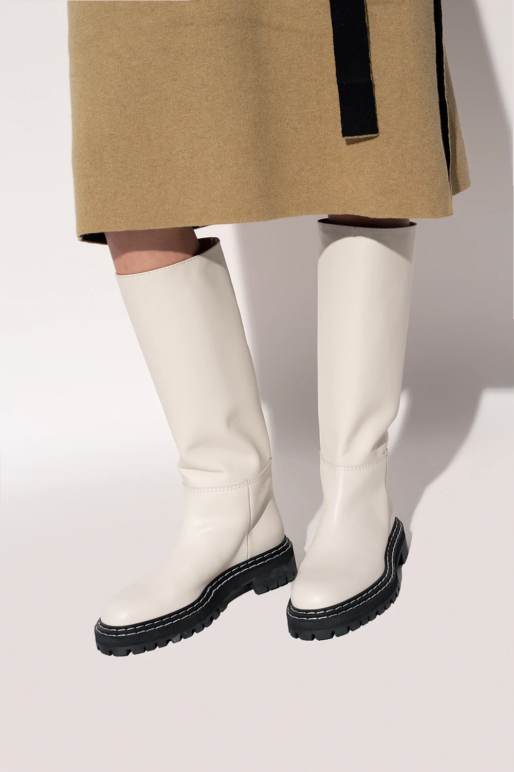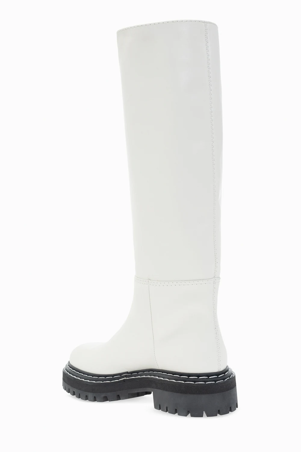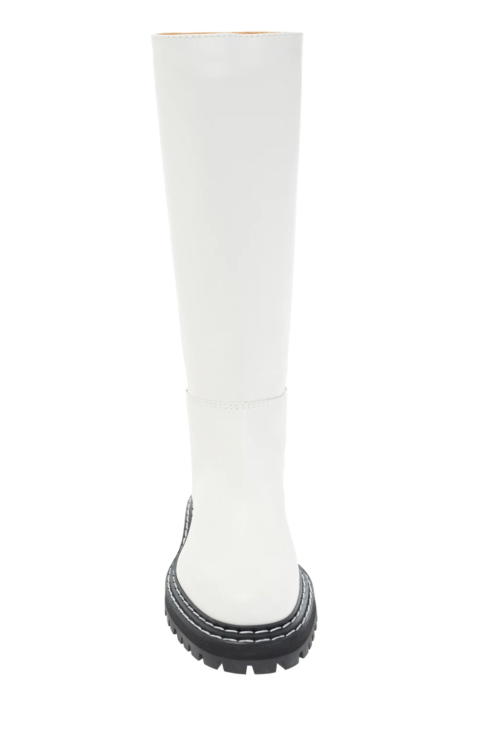 Białe, skórzane kozaki, model ‘Peru Fiba’ Proenza Schouler. Ozdobione przeszyciami. Czarna, gumowa podeszwa.