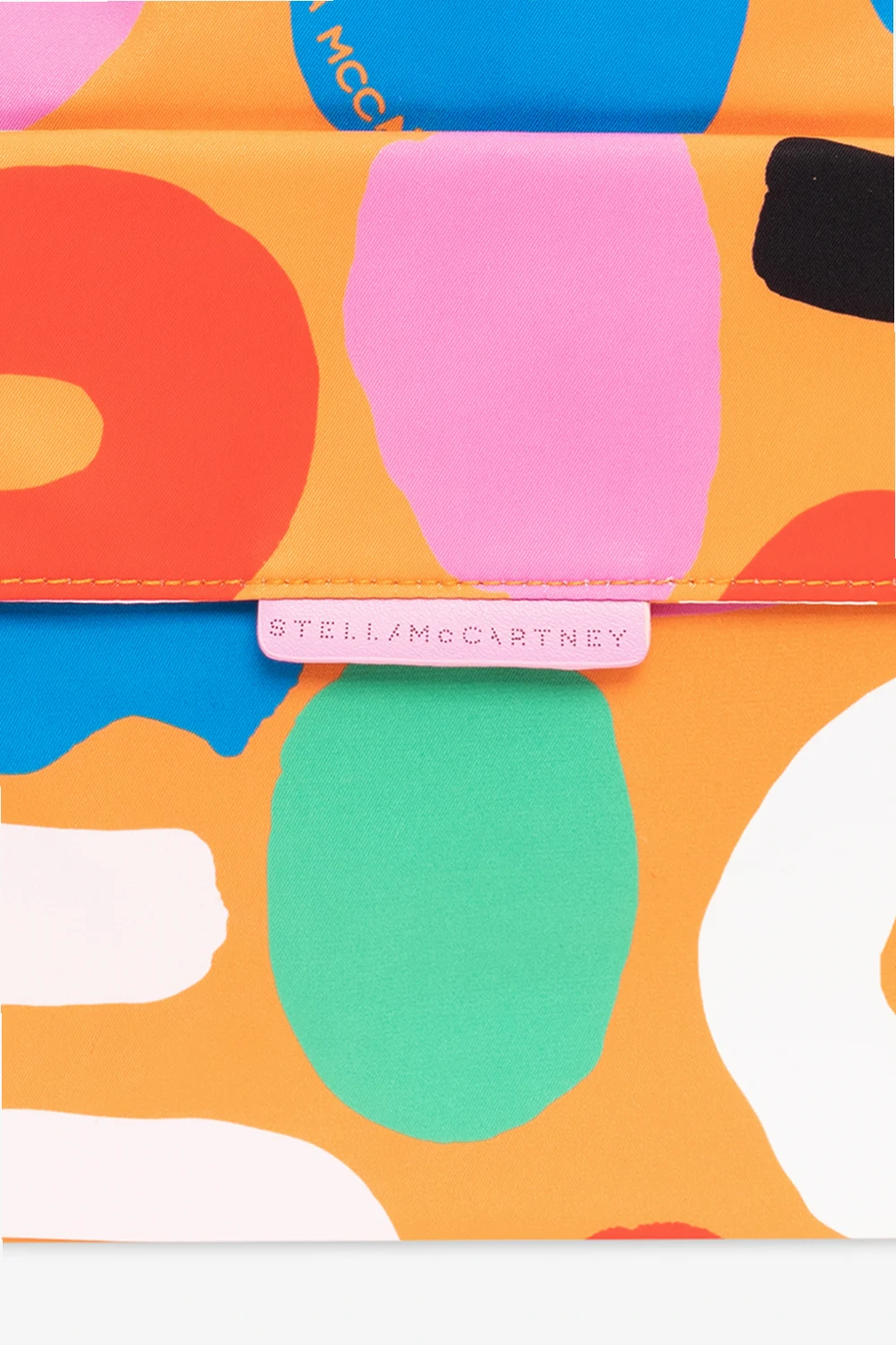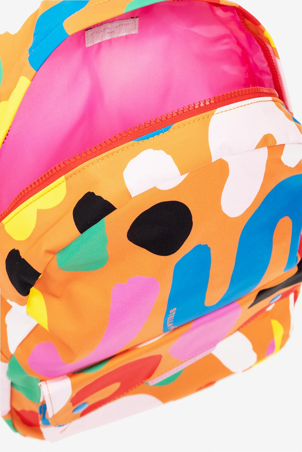 Pomarańczowy plecak Stella McCartney Kids. Wykonany z materiału z recyklingu. Zapinany na dwubiegunowy zamek. Ozdobiony kolorowym, nadrukowanym wzorem. Z przodu kieszeń z patką zamykaną na zatrzaski. Półokrągła rączka. Szelki z możliwością regulacji długości. Wewnątrz komora. Metalowe elementy w kolorze czerwonym i niebieskim.