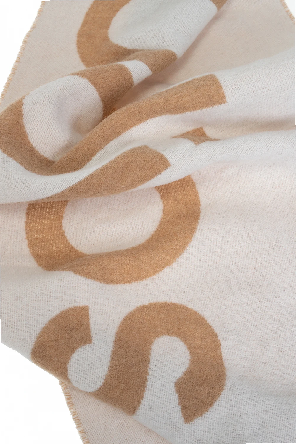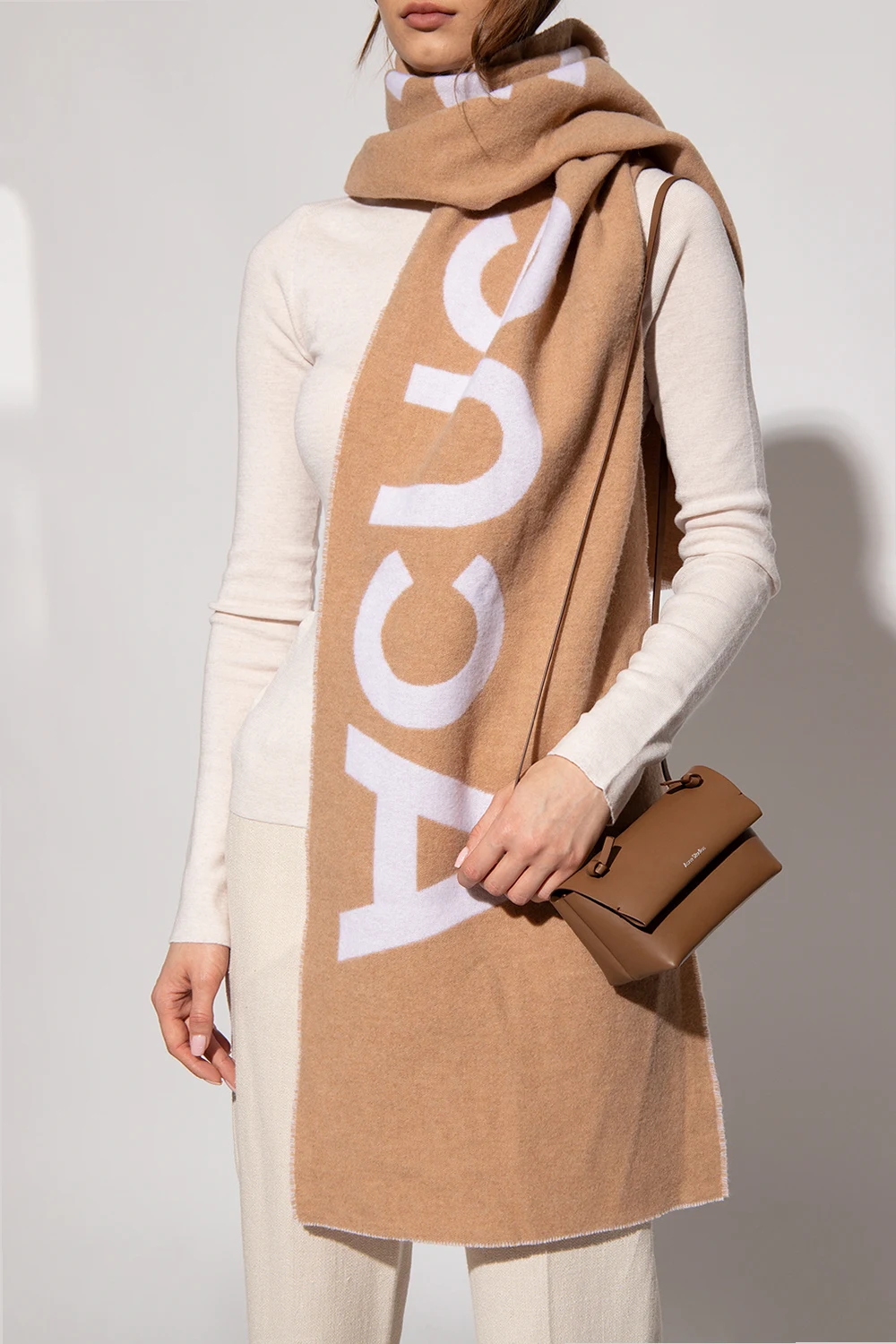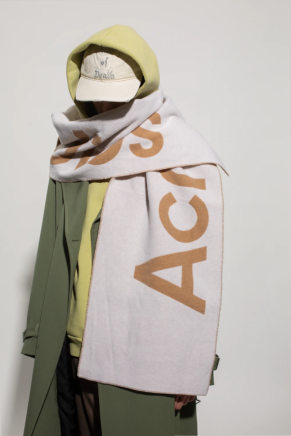 Kremowo-beżowy szal Acne Studios. Wykonany z wełny. Ozdobiony wzorem z logo. Surowe wykończenie.