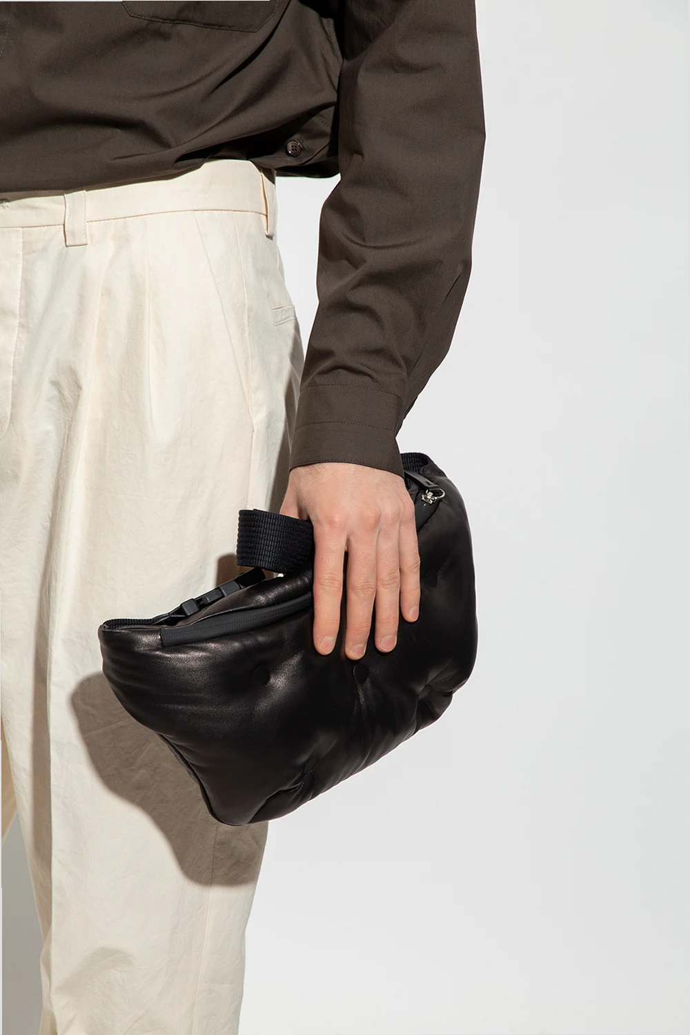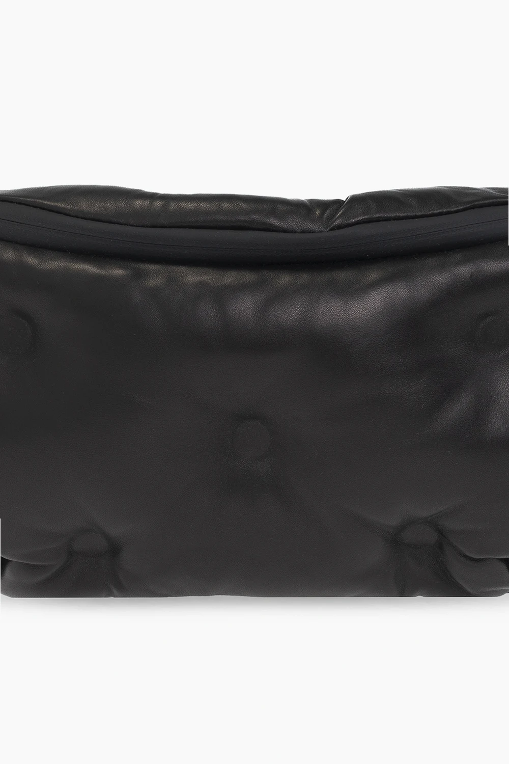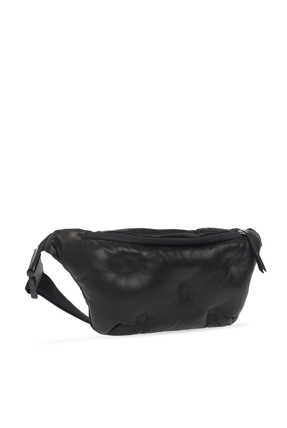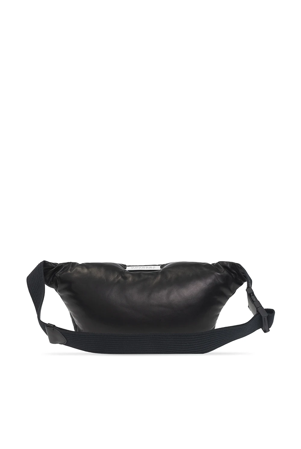 Czarna skórzana torba na pas, model ‘Glam Slam’ Maison Margiela. Zamykana na zamek. Ozdobiona charakterystyczną dla naszywką z logo w kolorze białym. Pas z możliwością regulacji długości. Wewnątrz komora z kieszenią zamykaną na zamek.
