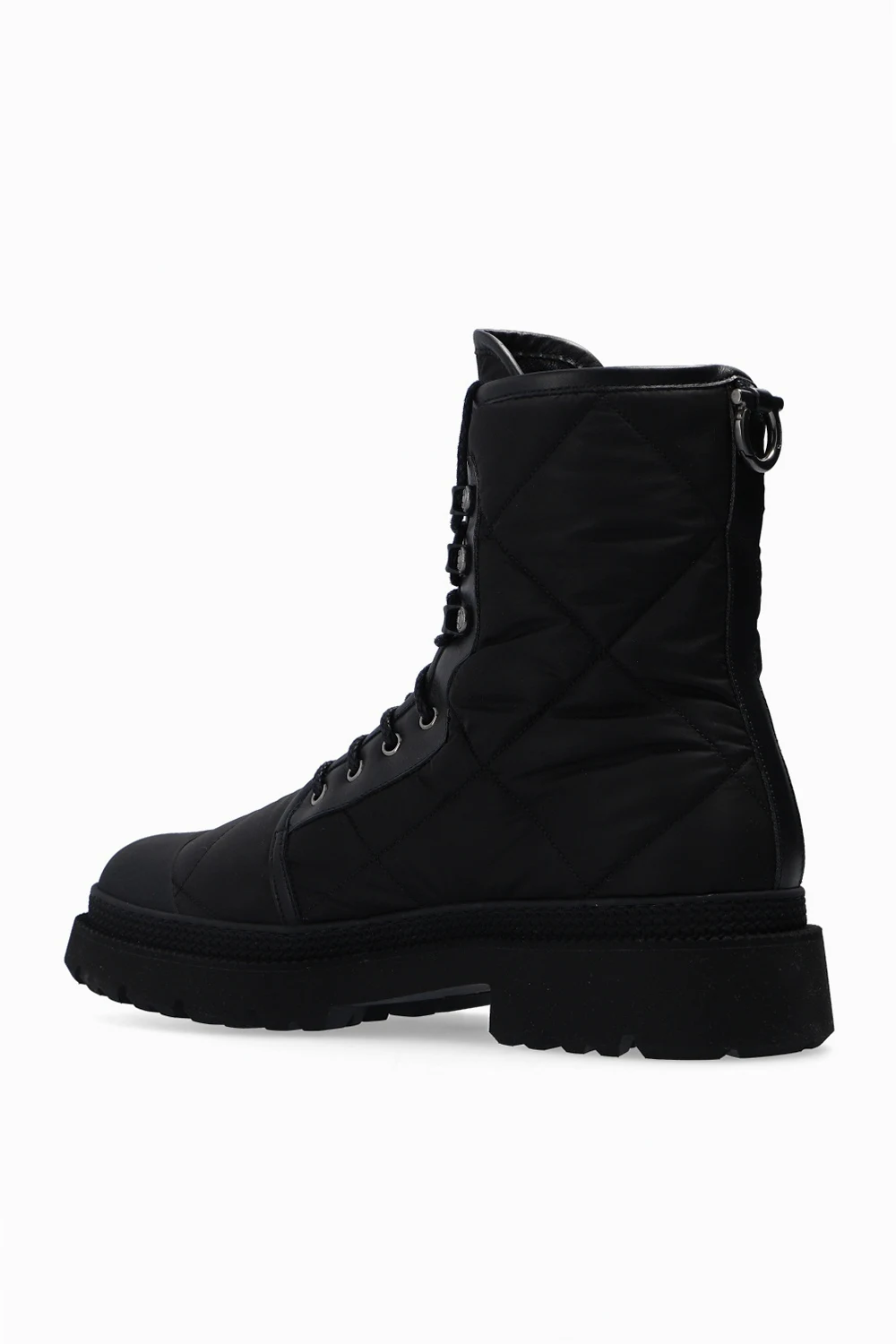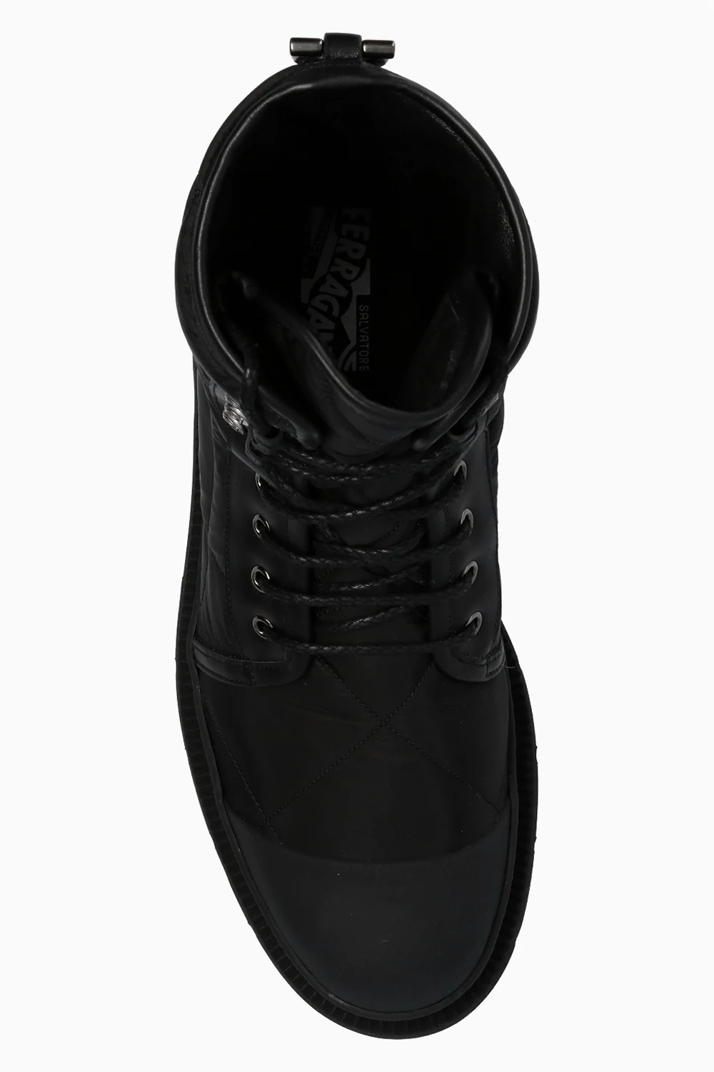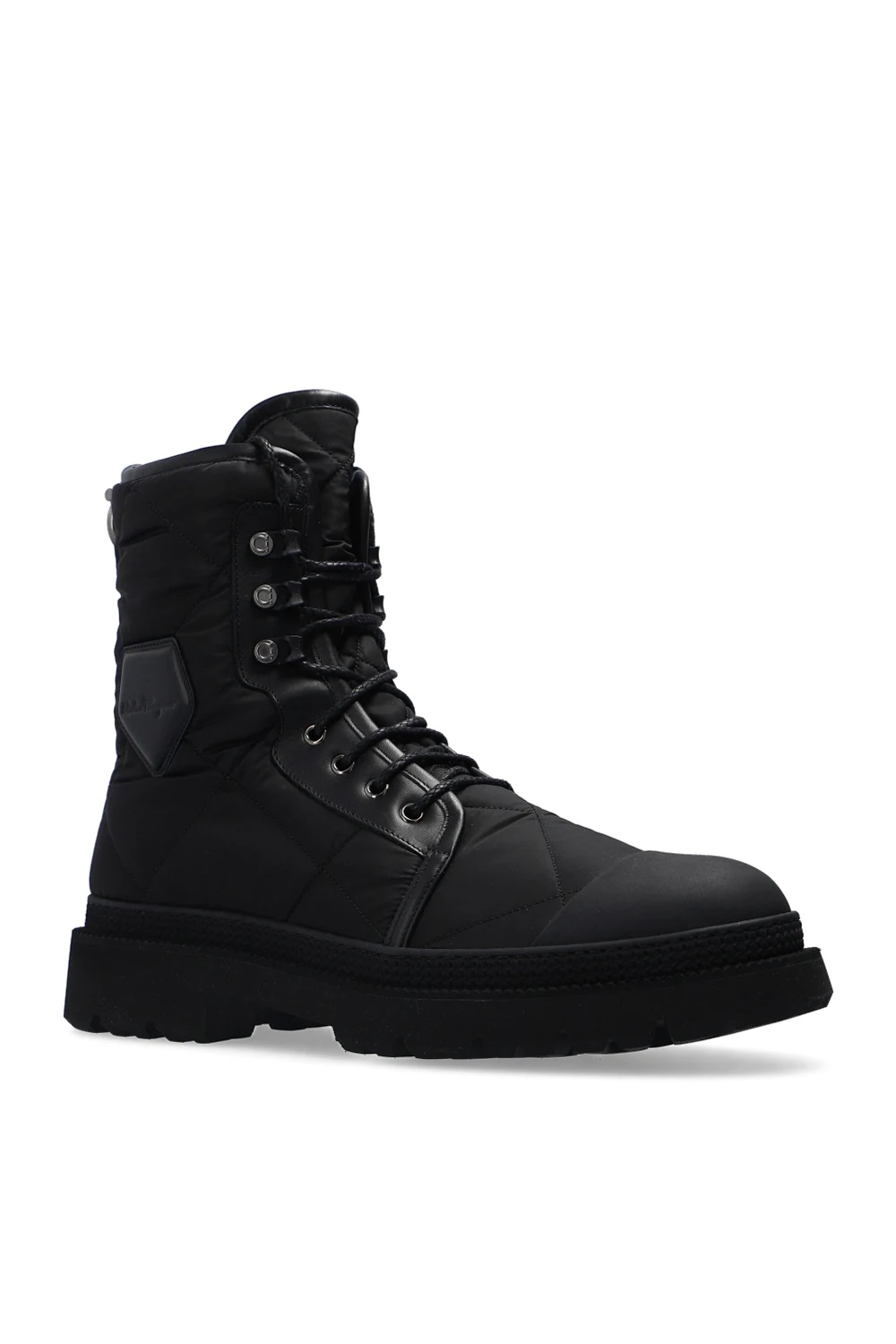 Czarne, pikowane, sznurowane botki, model ‘Rally’ Salvatore Ferragamo. Wykończone skórą cielęcą. Ozdobione naszywką z wytłoczonym logo. Czarna, gumowa podeszwa.