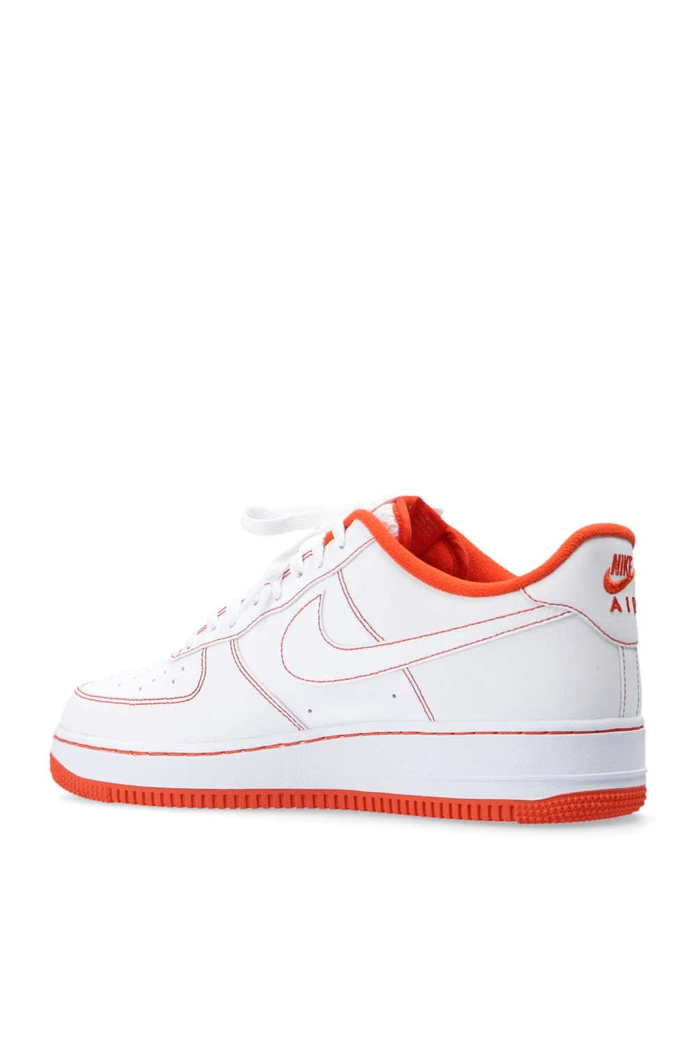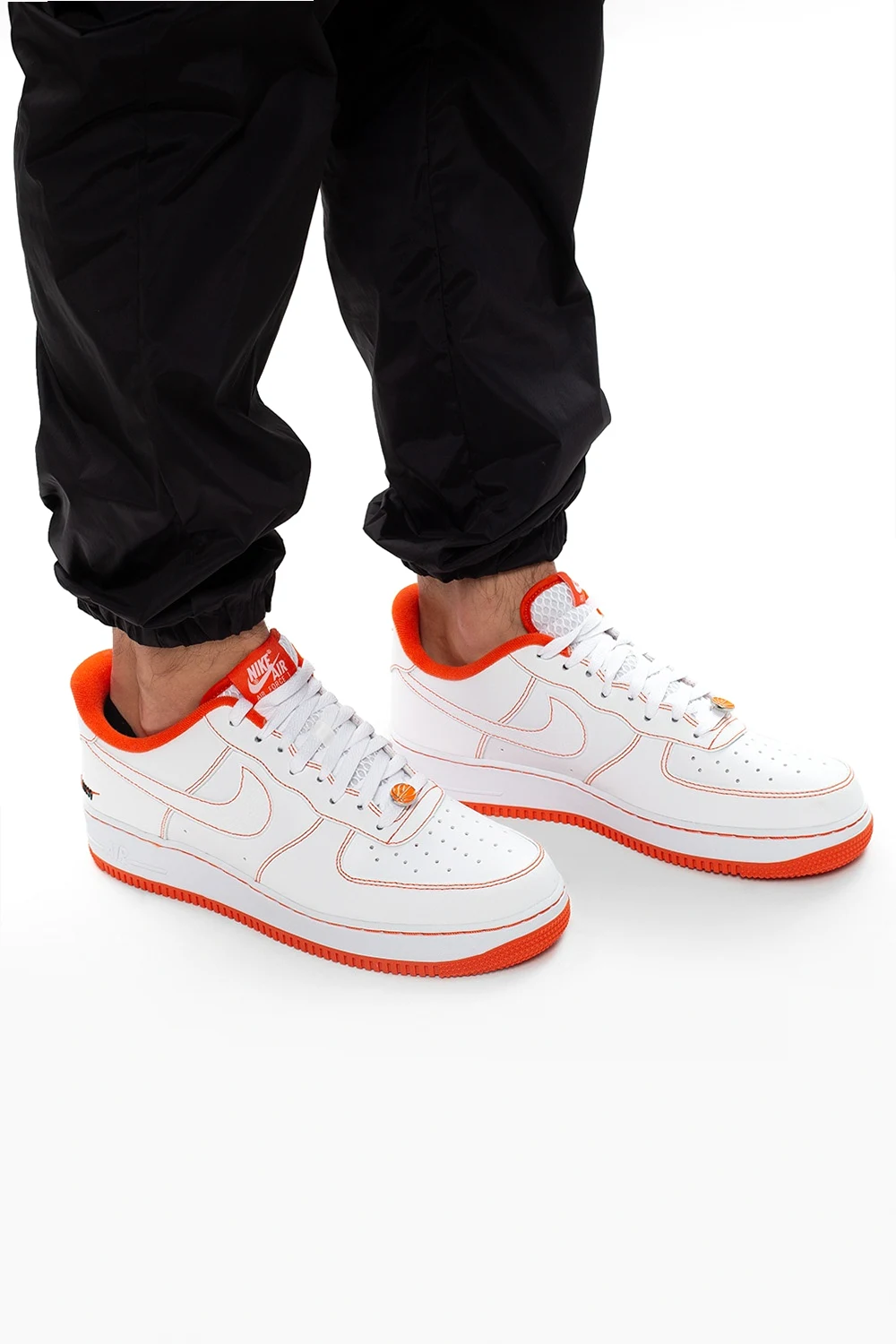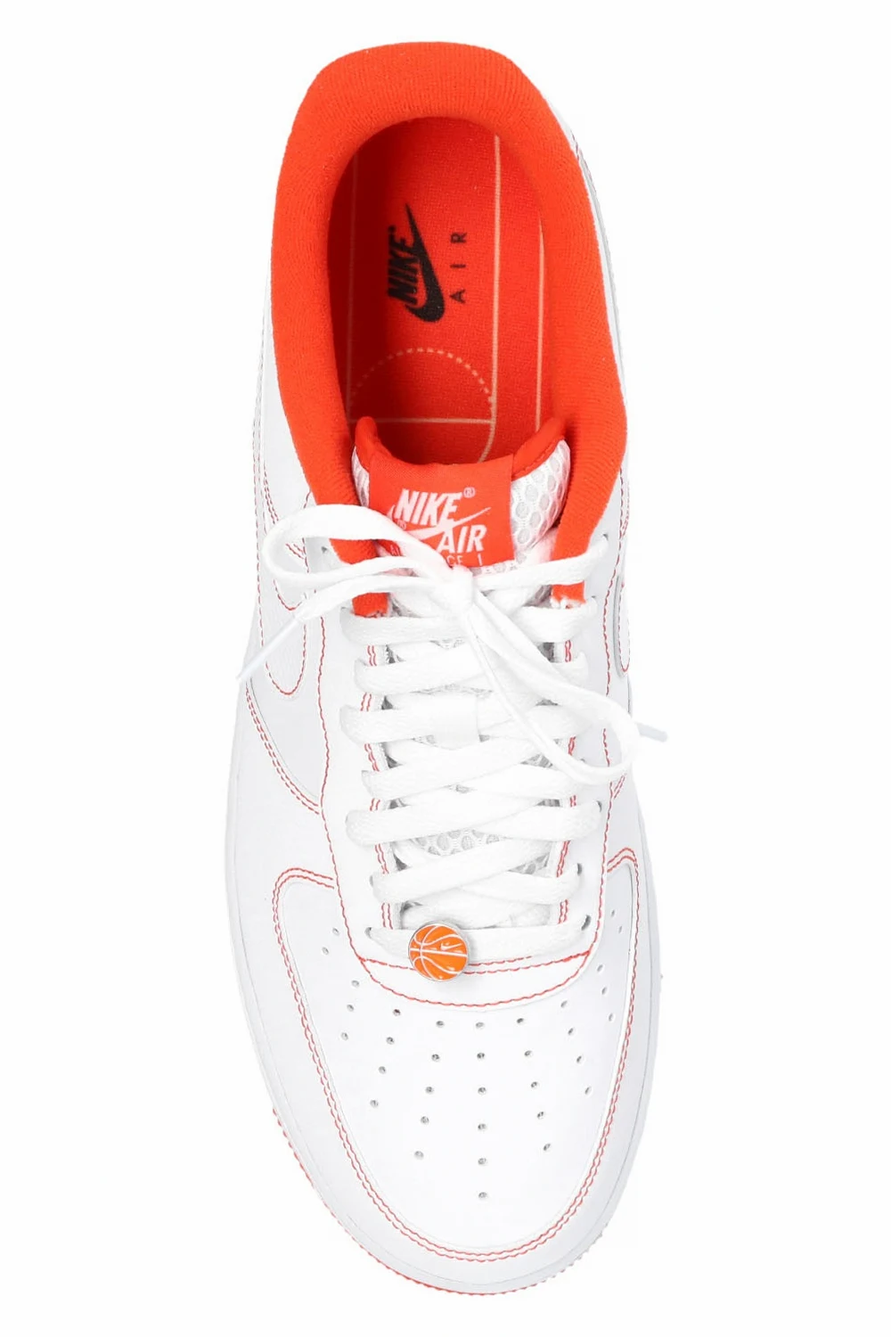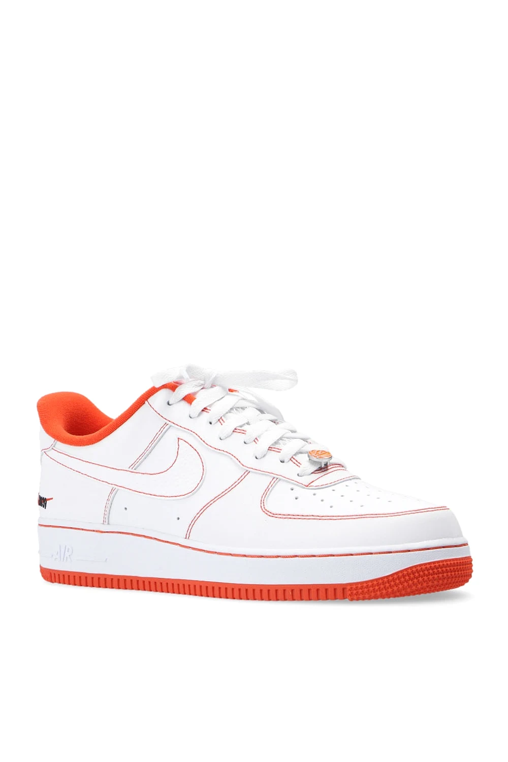 Białe, skórzane, sznurowane buty ‘Air force 1’ Nike. Ozdobione wyszytym wzorem z logo w kolorze pomarańczowym, naszywką z logo w kolorze białym, pomarańczową, dekoracyjną nicią, metalowym dekoracyjnym elementem z motywem piłki do koszykówki oraz perforacjami zapewniającymi przepływ powietrza i wentylację.