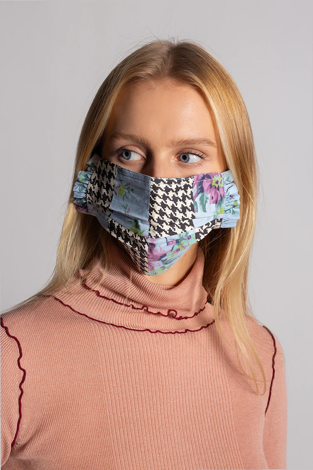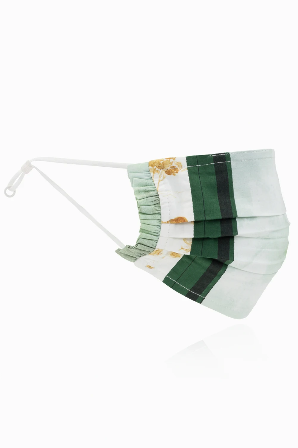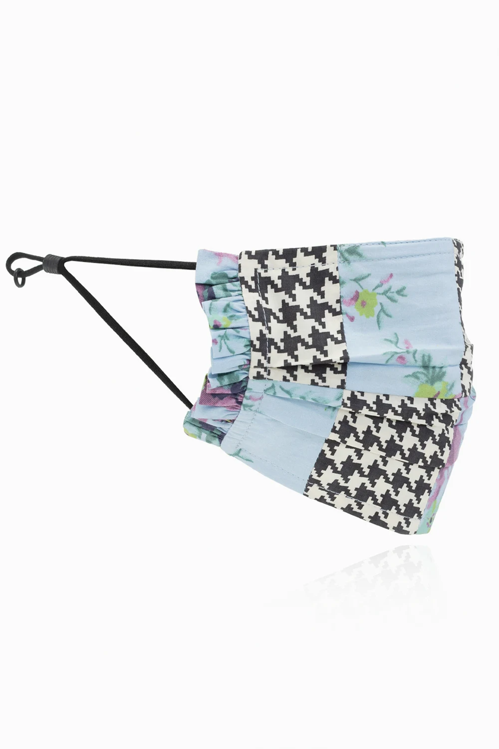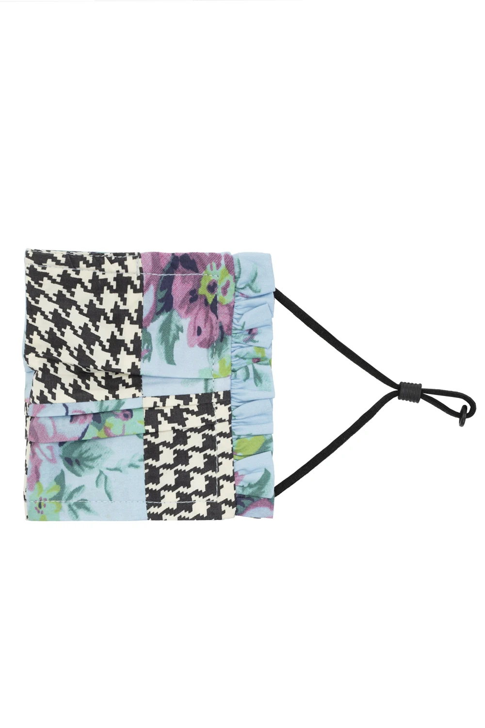 Trójpak kolorowych masek Ganni. Wykonane z organicznej bawełny. Po bokach wykończone falbanami. Gumki z możliwością regulacji. Dołączone etui z logo.