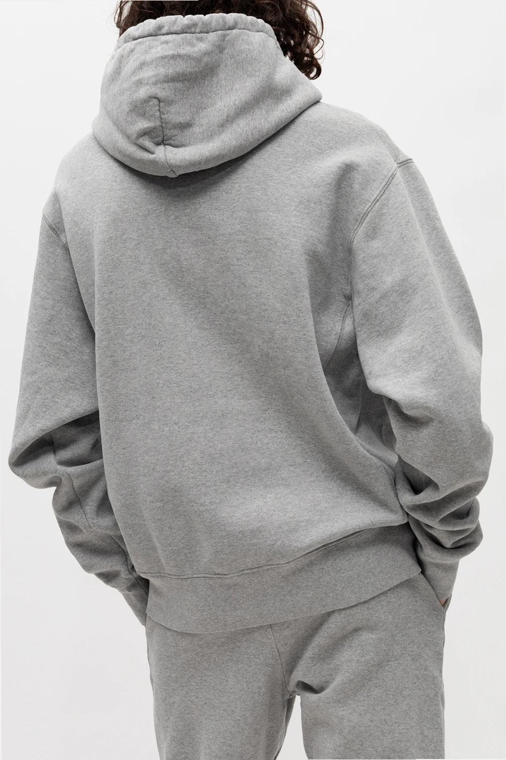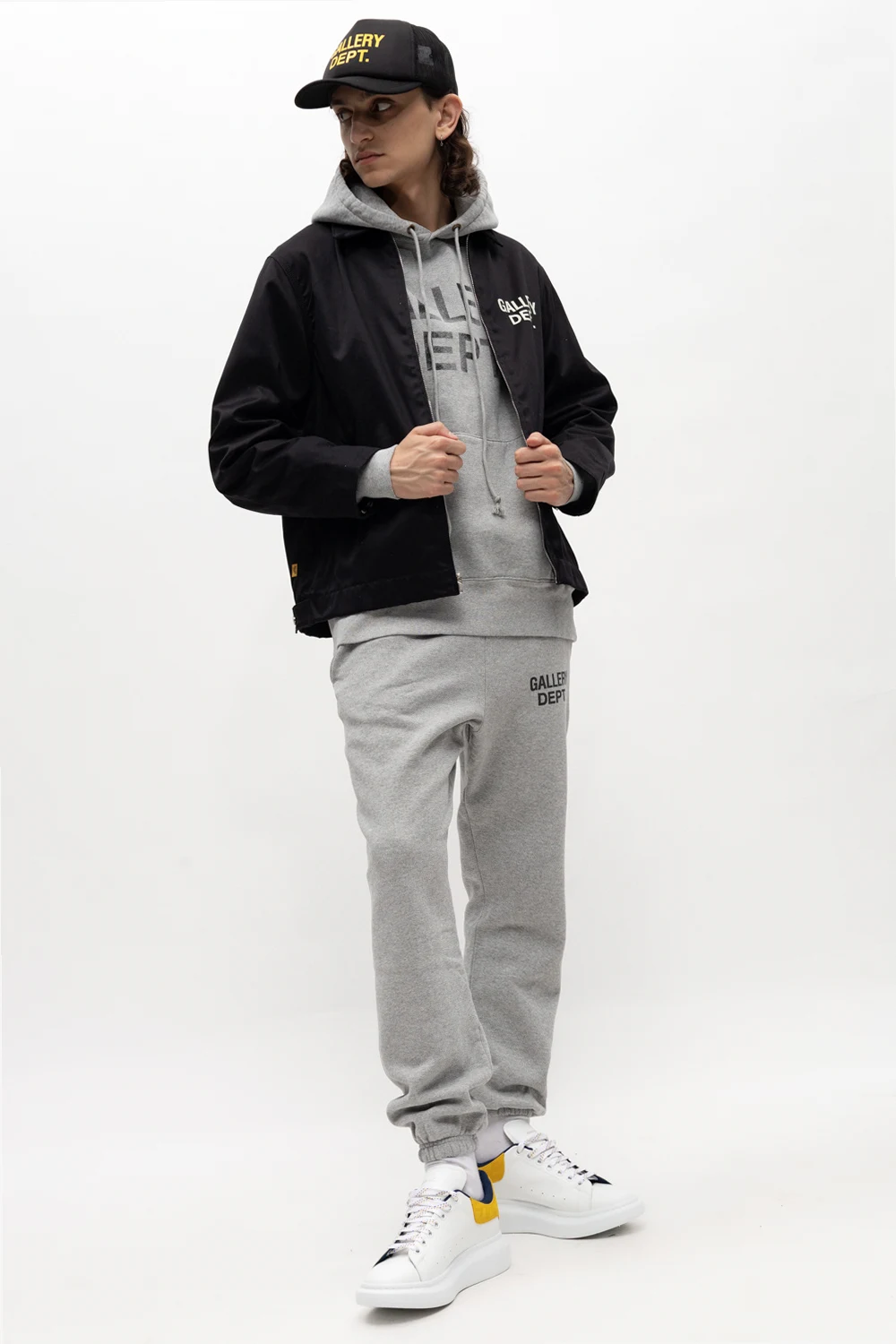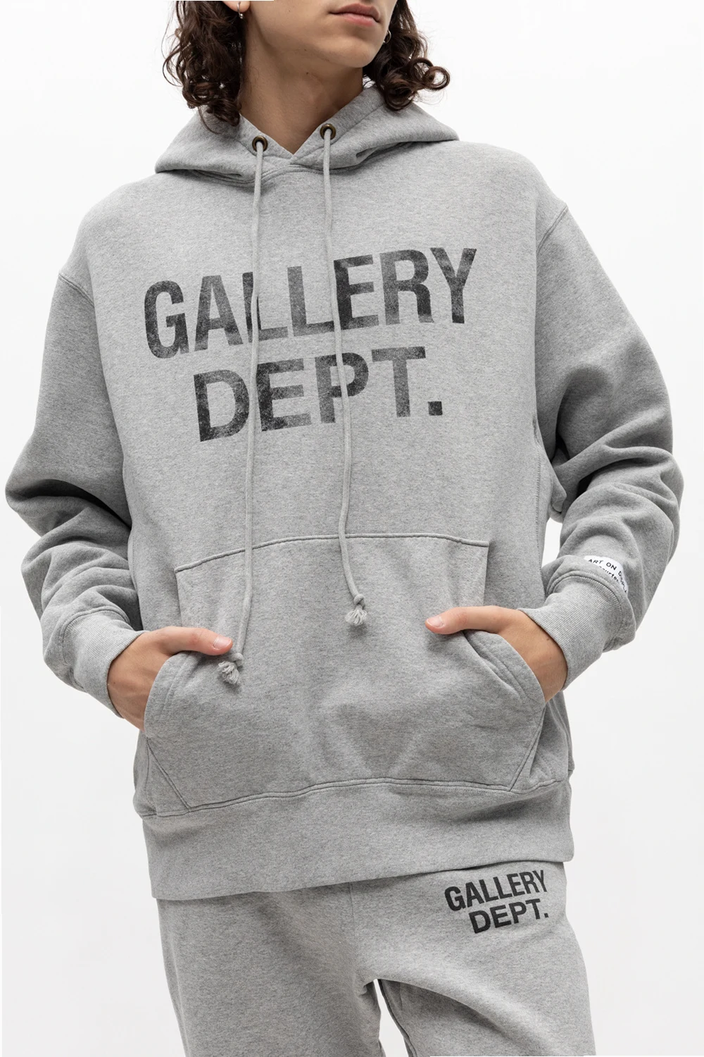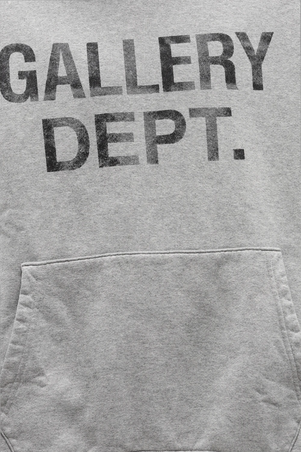 Szara bluza GALLERY DEPT. Wykonana z bawełny. Ozdobiona czarnym wzorem z logo. Wsuwana kieszeń. Kaptur ściągany trokami. Ozdobiona efektem znoszenia. Dół i długie rękawy wykończone ściągaczem.