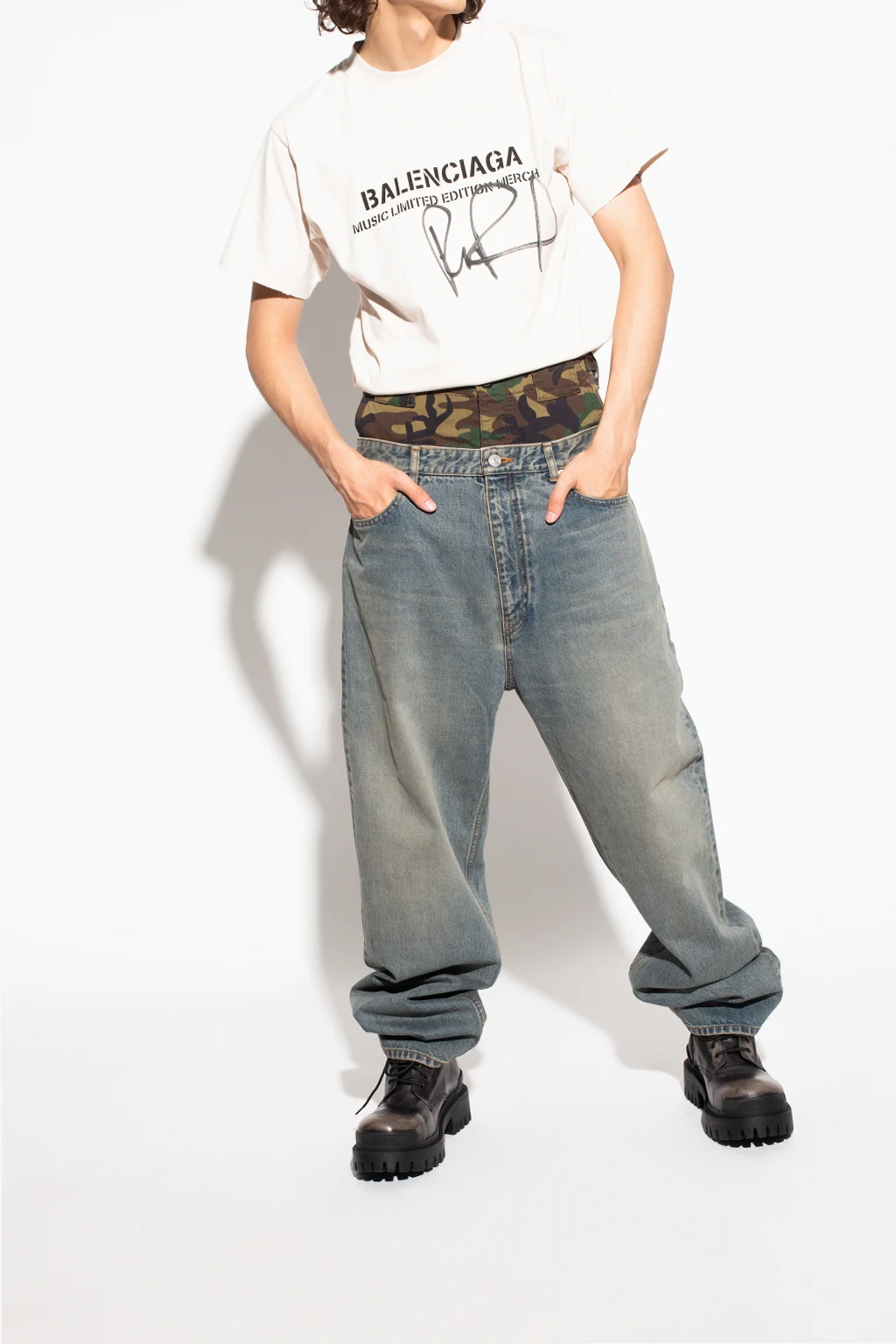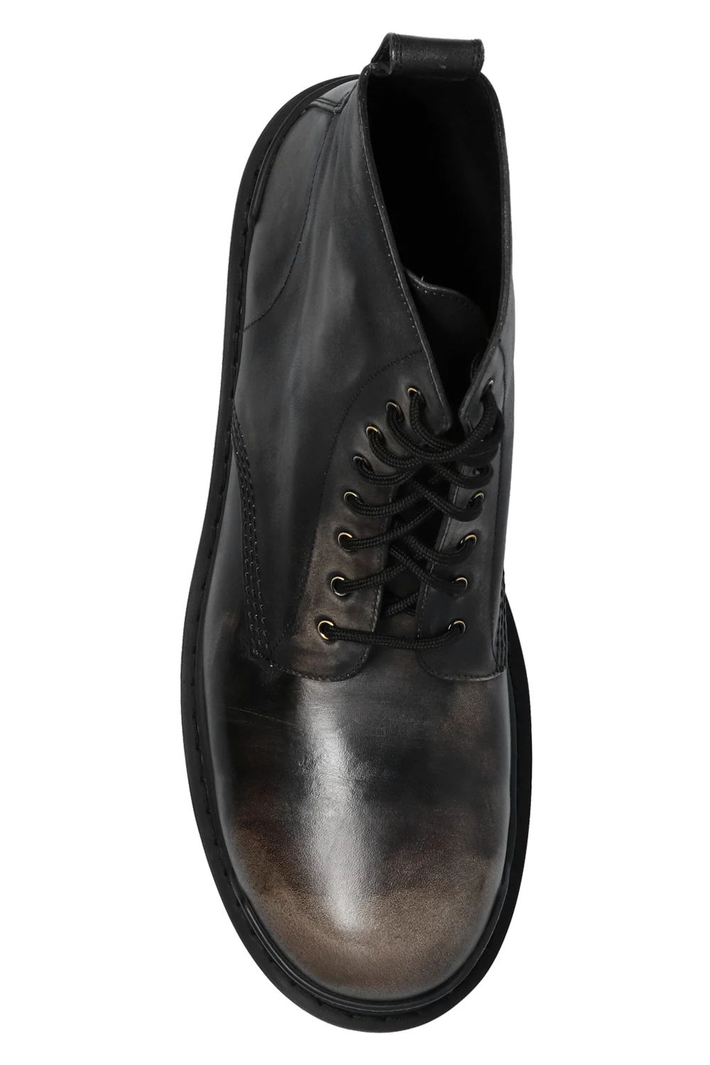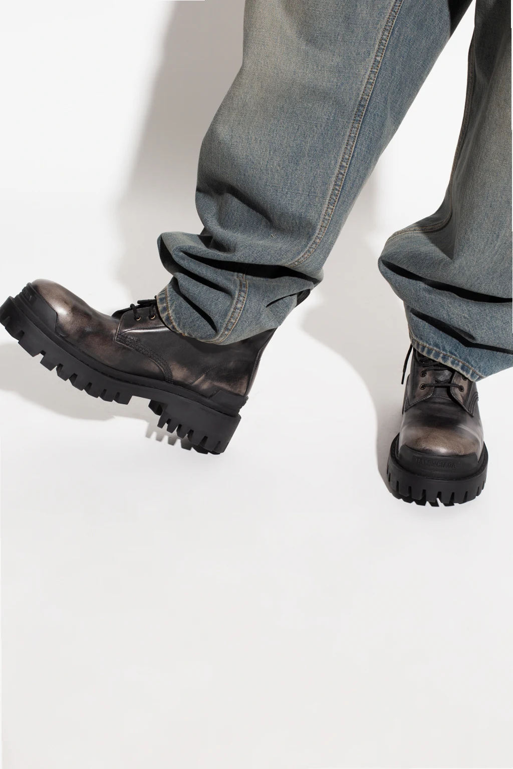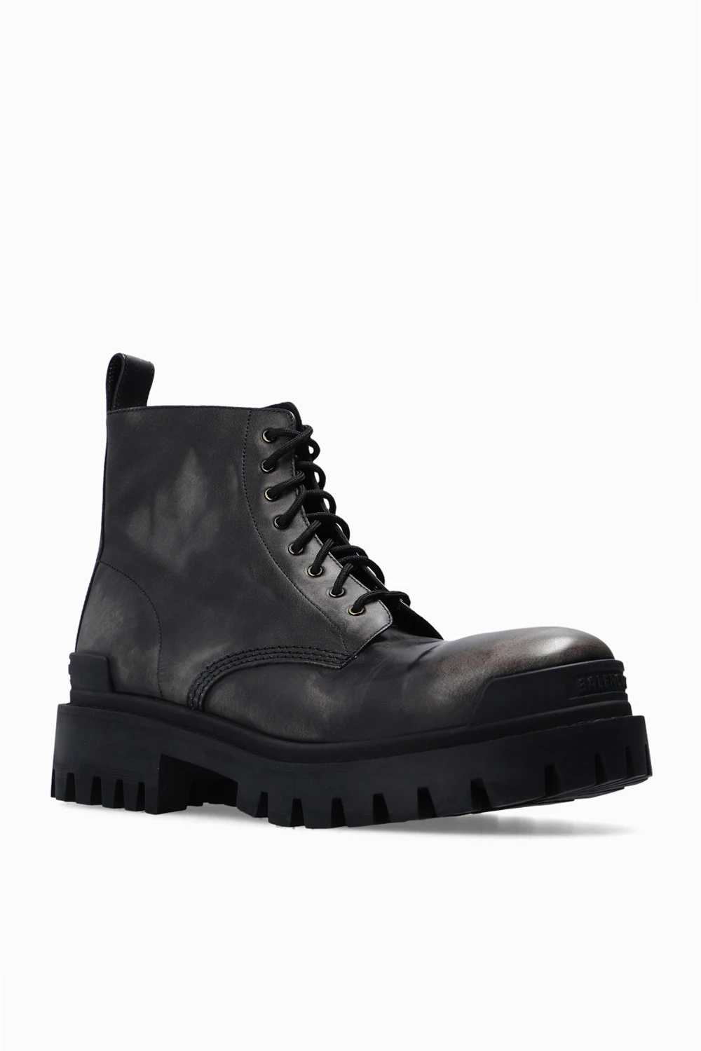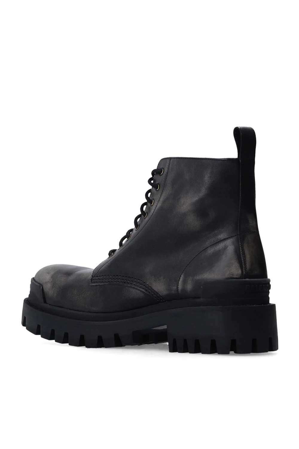 Czarne, sznurowane botki, model ‘Strike’ Balenciaga. Wykonane ze skóry z efektem znoszenia. Z tyłu i z przodu wypukła aplikacja z logo. Czarna, gumowa podeszwa