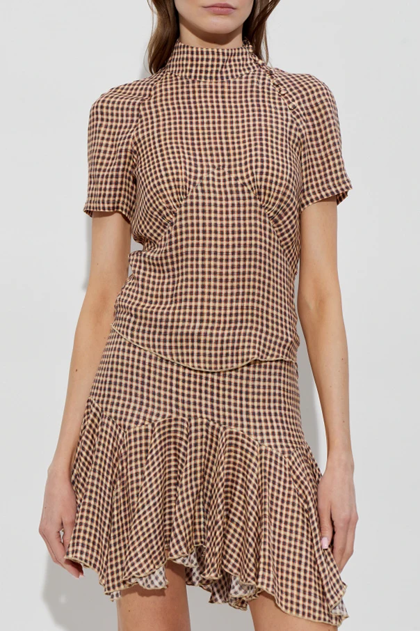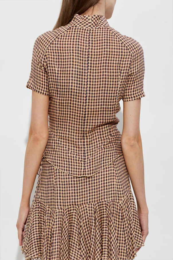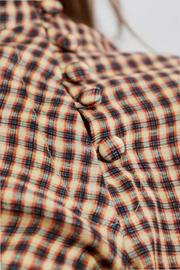 Brązowy top został wykonany z miękkiej, lekko zwiewnej wiskozy, której półprzezroczysta struktura zachwyca lekkością i przyjemnym wyglądem. Klasyczny wzór w drobną kratę vichy łączy tony brązu, beżu, czerni oraz wyważone akcenty czerwieni. Luksus podkreślają kunsztowne, oblekane tym samym materiałem guziki, umieszczone subtelnie przy stójce.