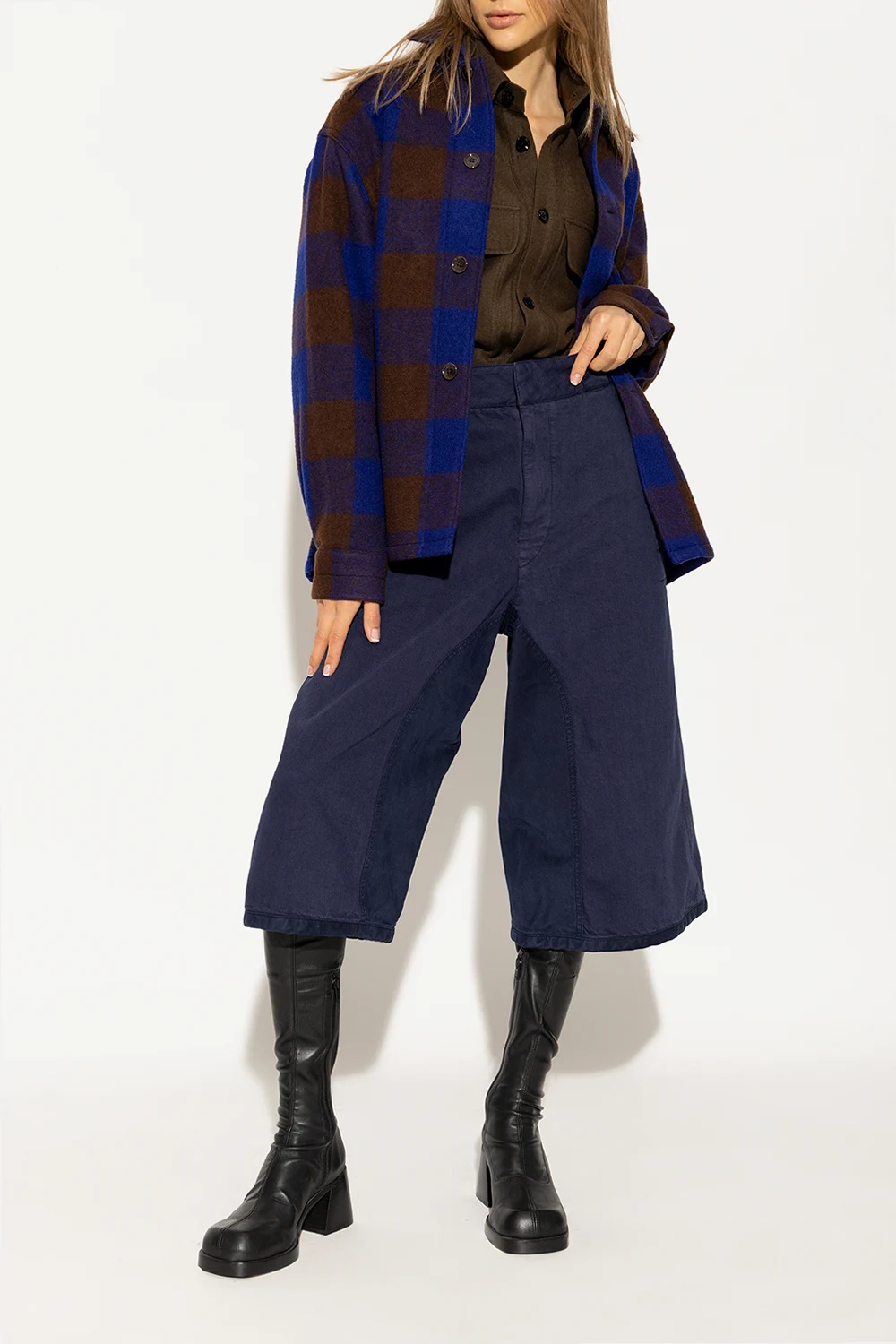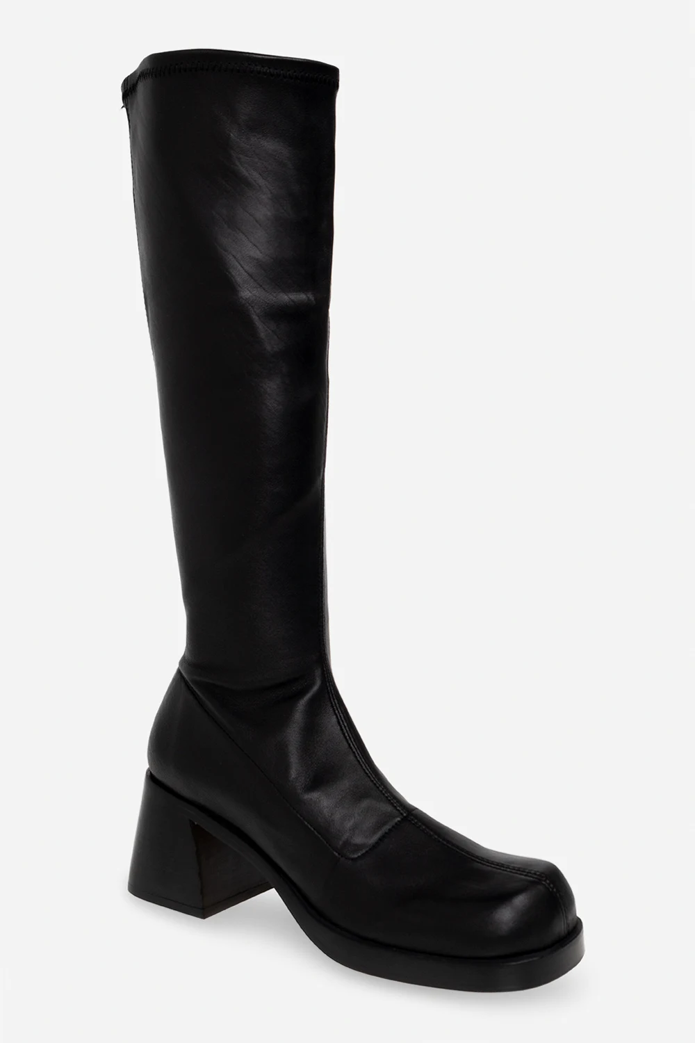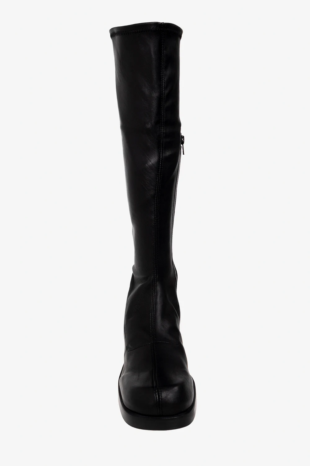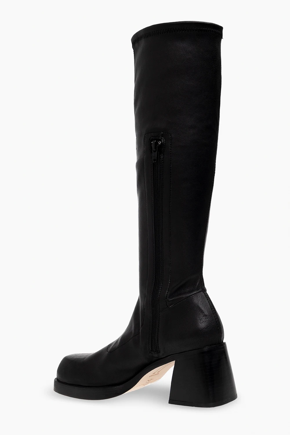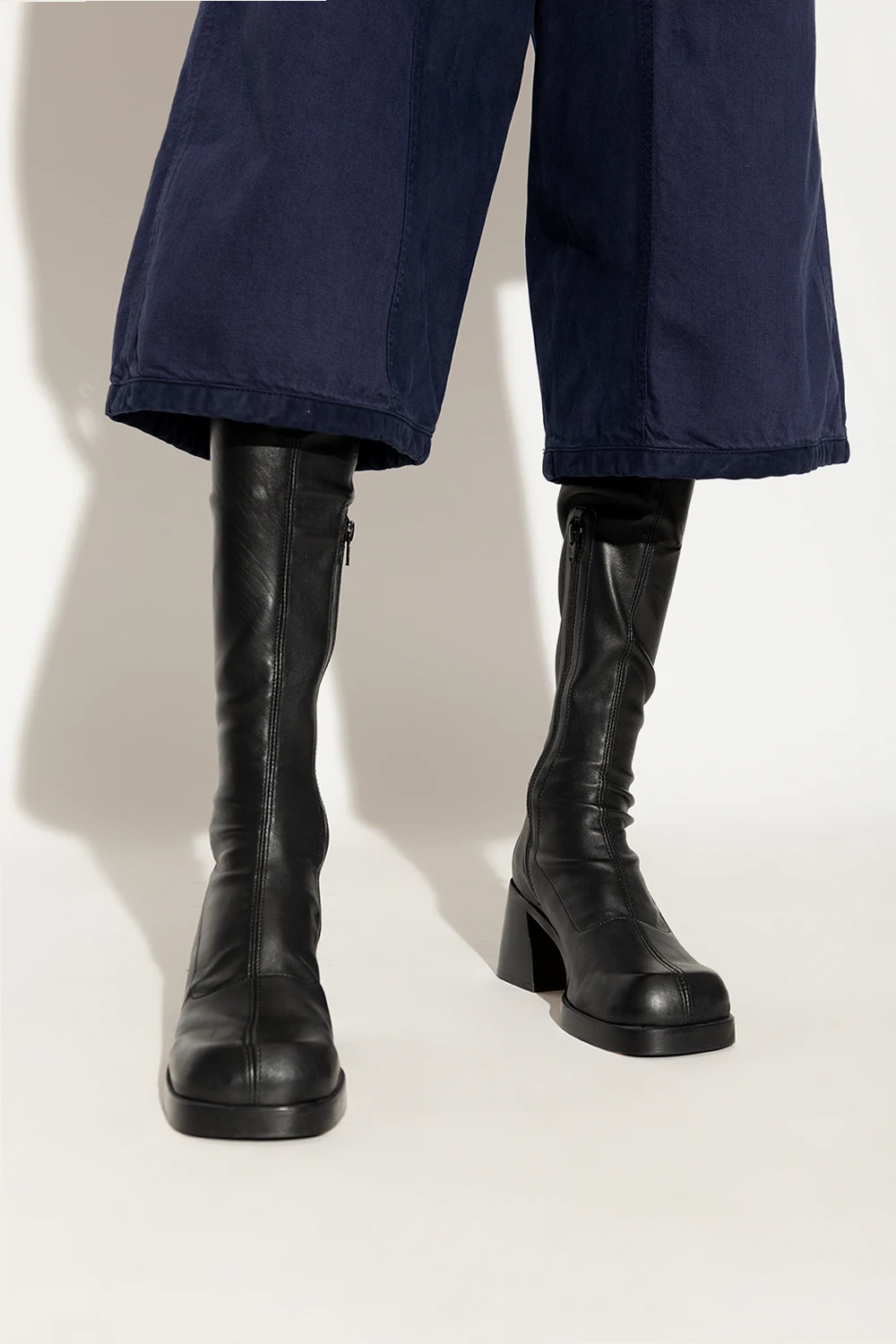 Czarne kozaki na obcasie, model ‘Hedy’ Miista. Wykonane ze skóry. Z boku zapinane na zamek. Kwadratowy, zaokrąglony nosek. Kremowa, skórzana podeszwa.