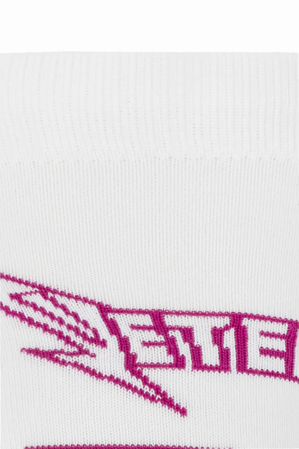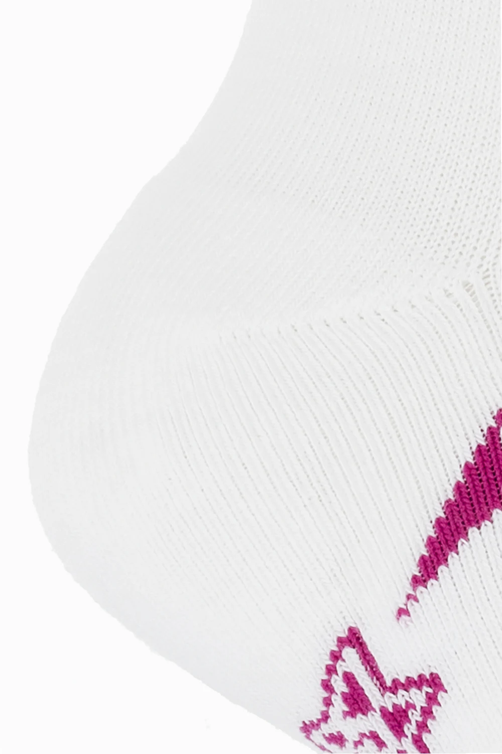 Białe, bawełniane skarpety VETEMENTS x Reebok. Ozdobione ciemnoróżowym wzorem z logo. Zakończone ściągaczem.