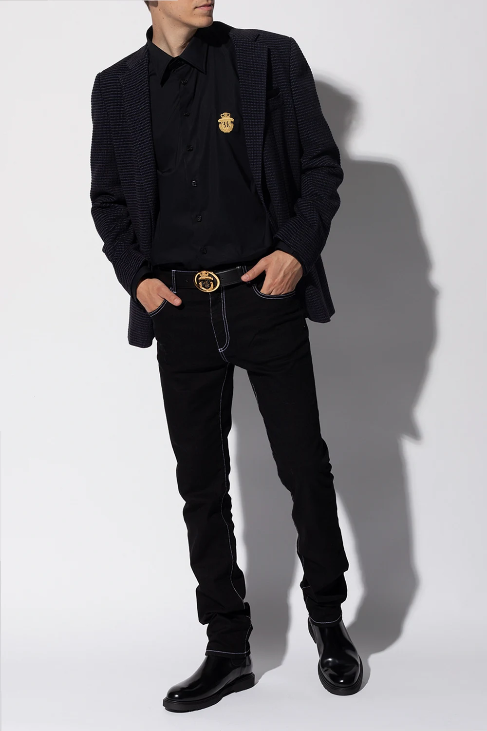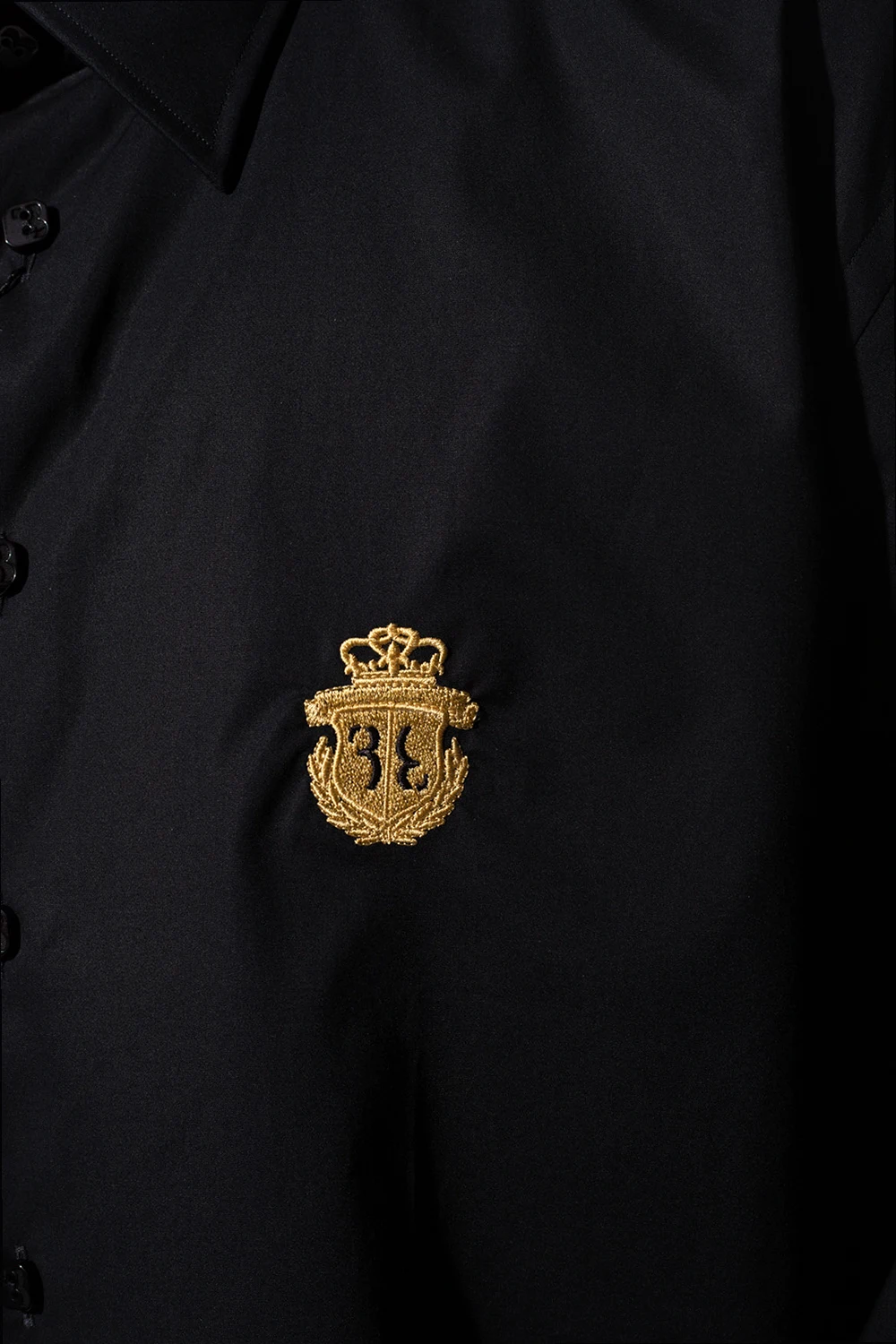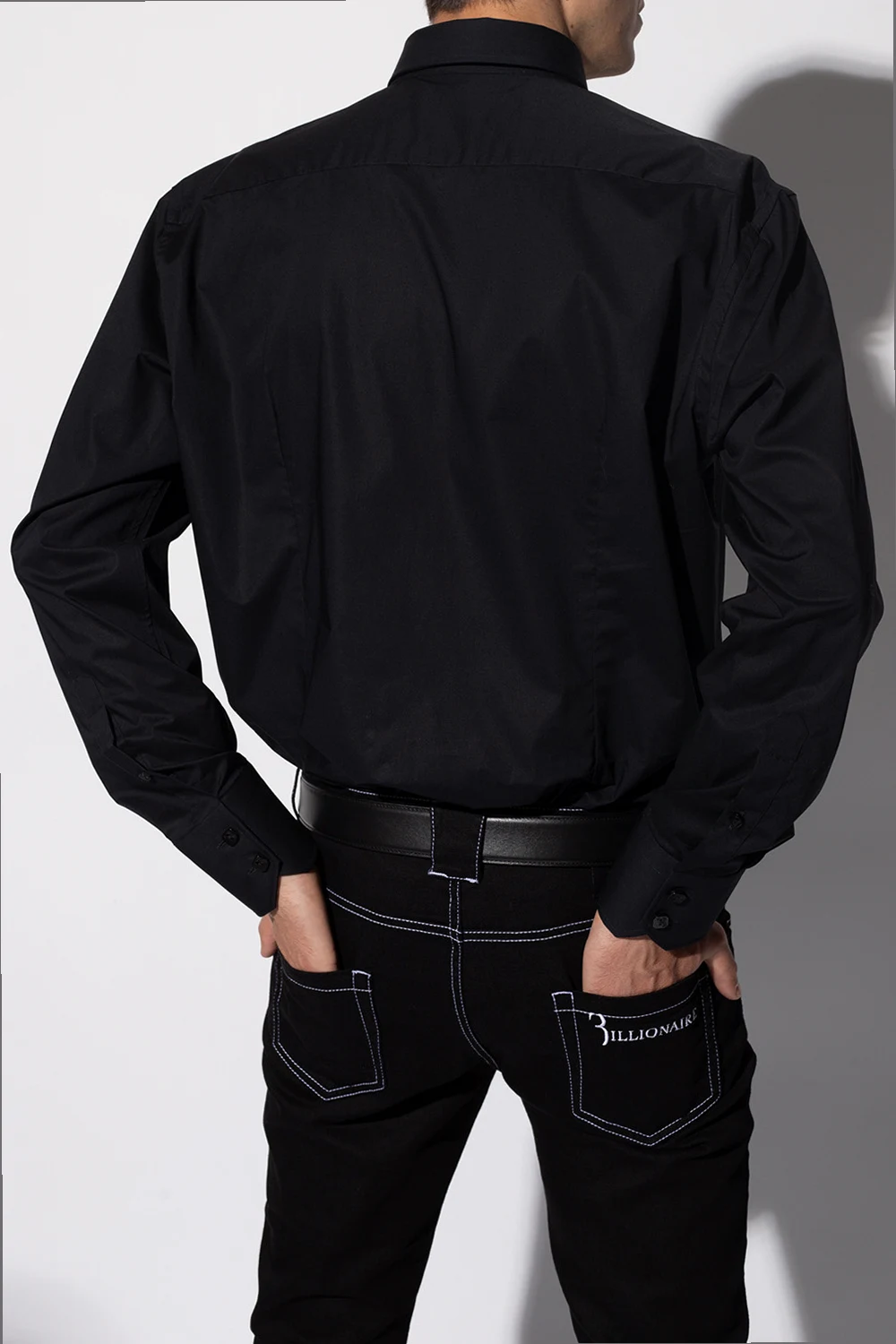 Czarna koszula Billionaire. Wykonana z bawełny. Zapinana na guziki. Ozdobiona wyszytym wzorem z logo w kolorze złotym. Długie rękawy zakończone mankietami z zapięciem na guziki.
