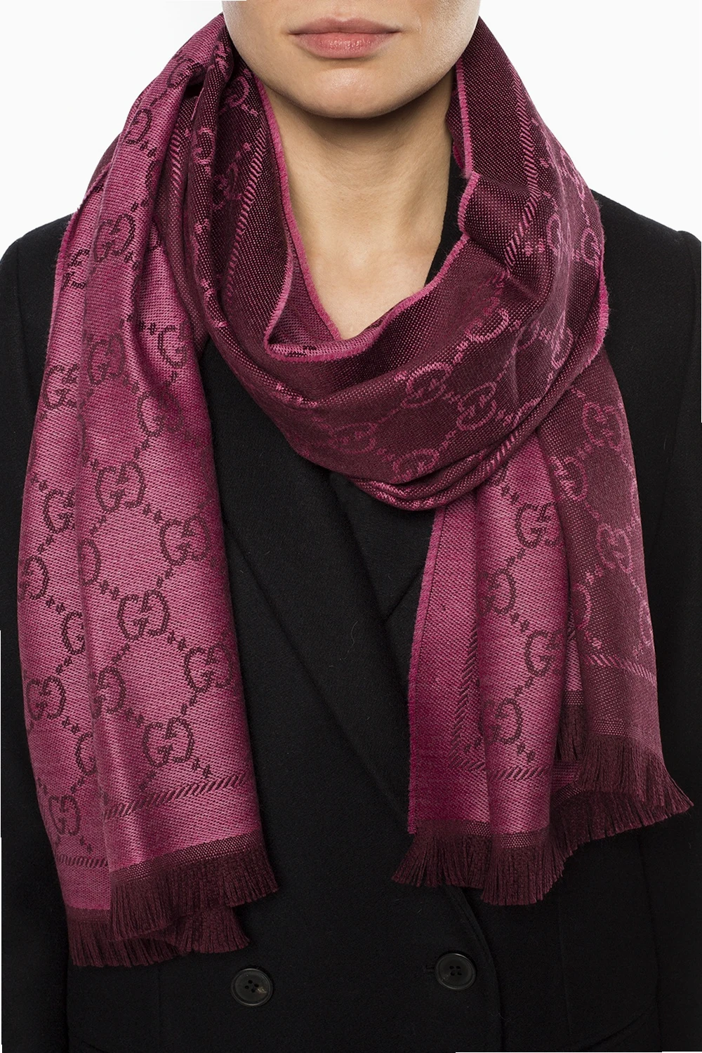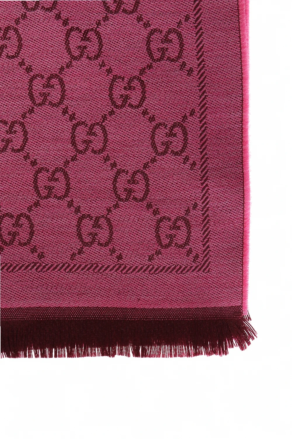 Różowo-bordowy, wełniany szal Gucci. Ozdobiony wyszytym wzorem 'GG Original'. Zakończony frędzlami.