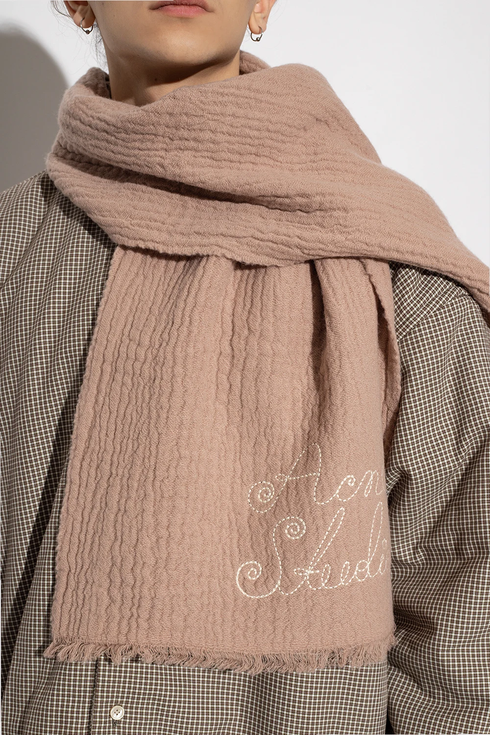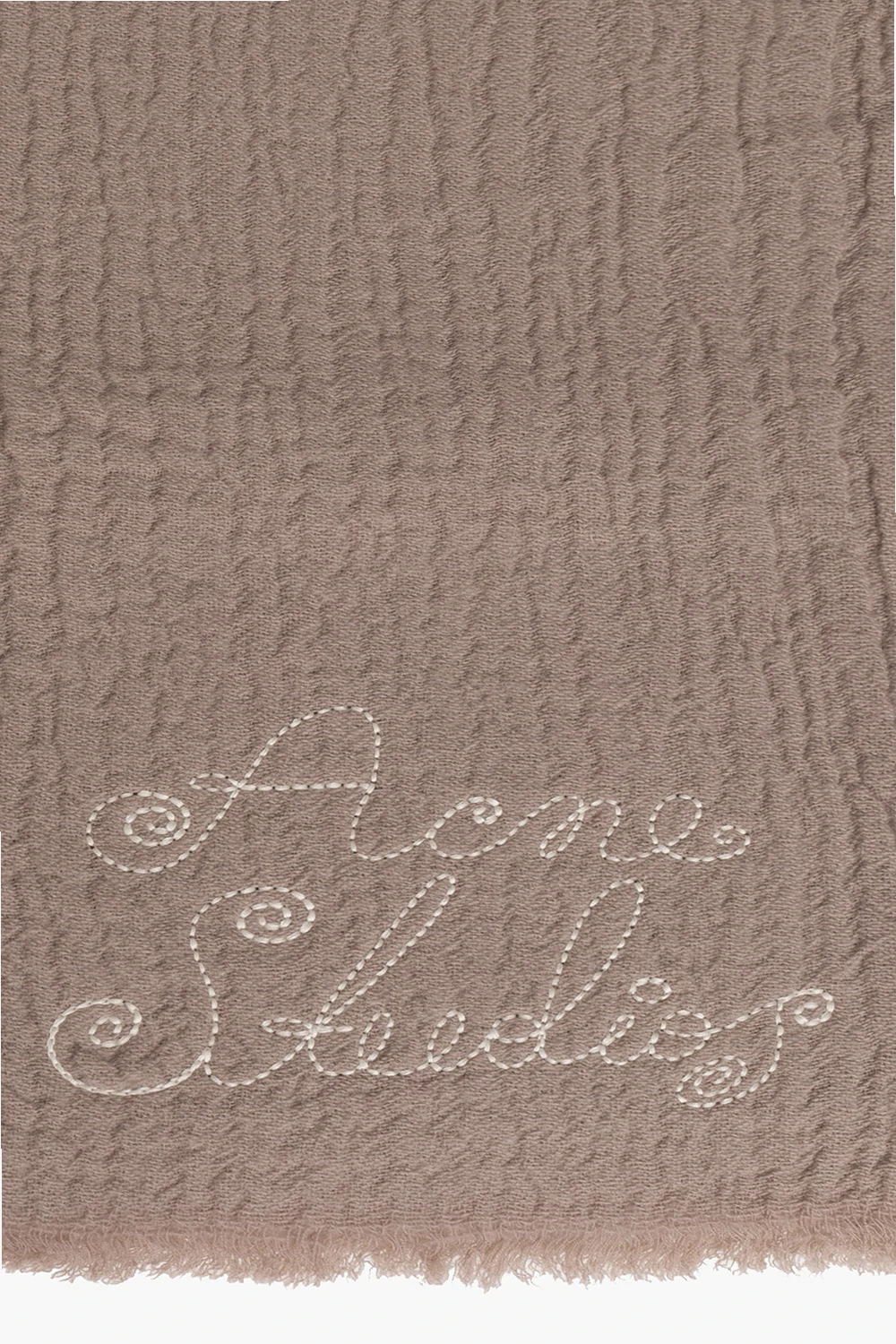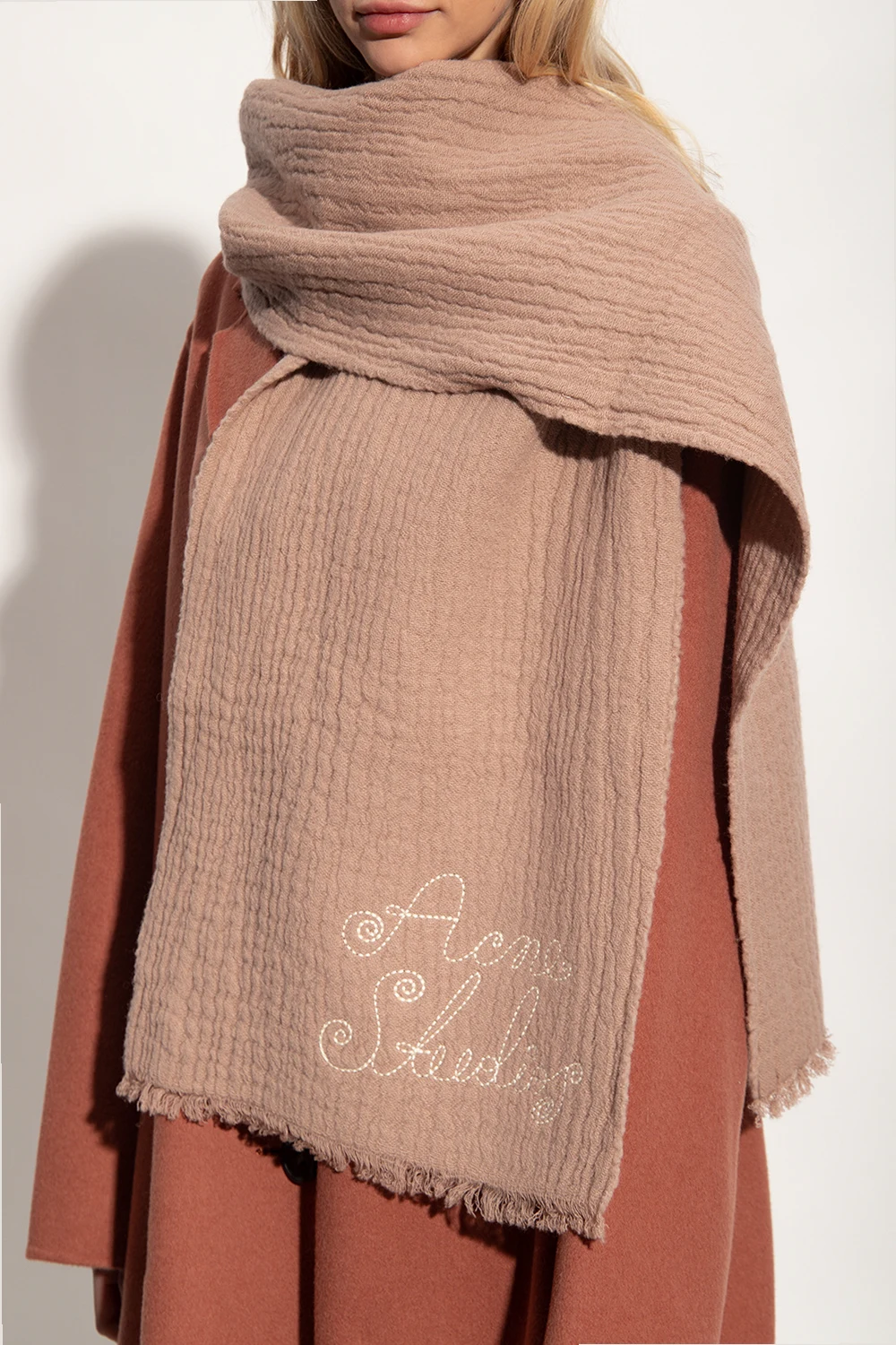 Pudroworóżowy szal Acne Studios. Wykonany z wełny o specjalnej fakturze. Ozdobiony wyszytym logo w kolorze kremowym. Brzegi z surowym wykończeniem.