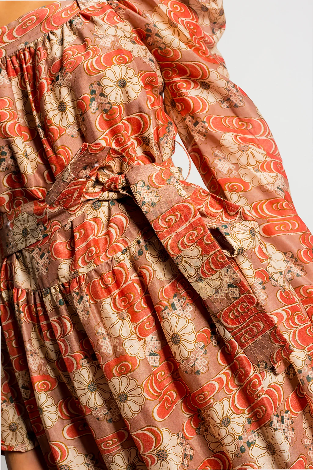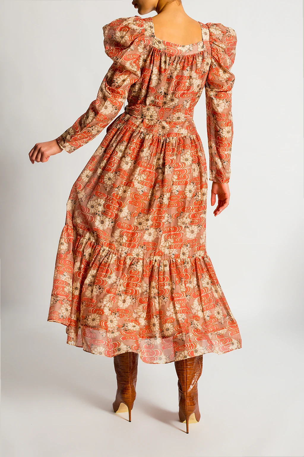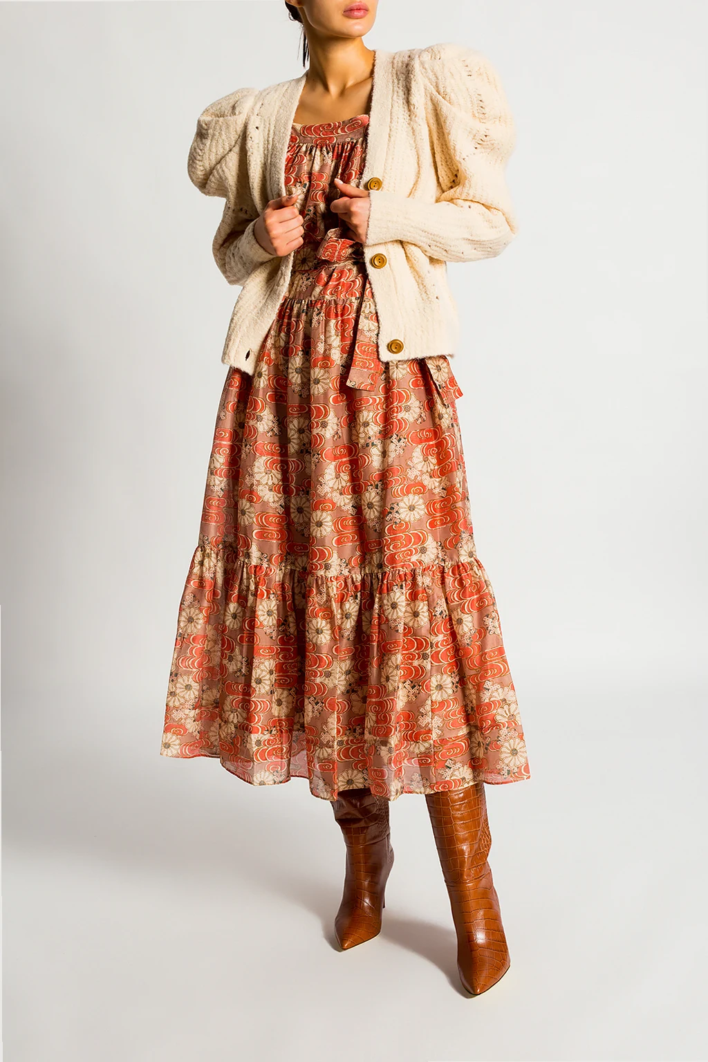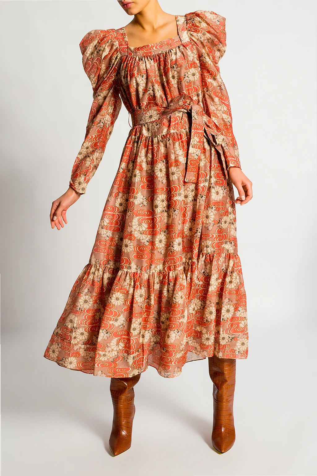 Kolorowa, wzorzysta sukienka z bufiastymi rękawami, model 'Jasmene' Ulla Johnson. Wykonana z bawełny i jedwabiu. W talii wiązana paskiem.