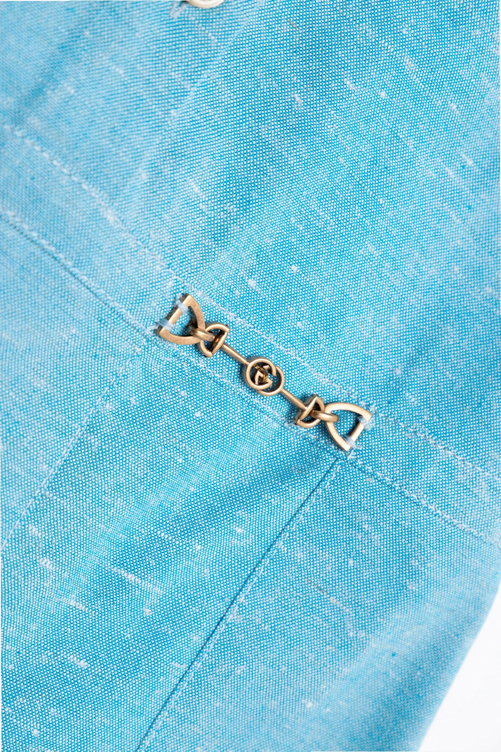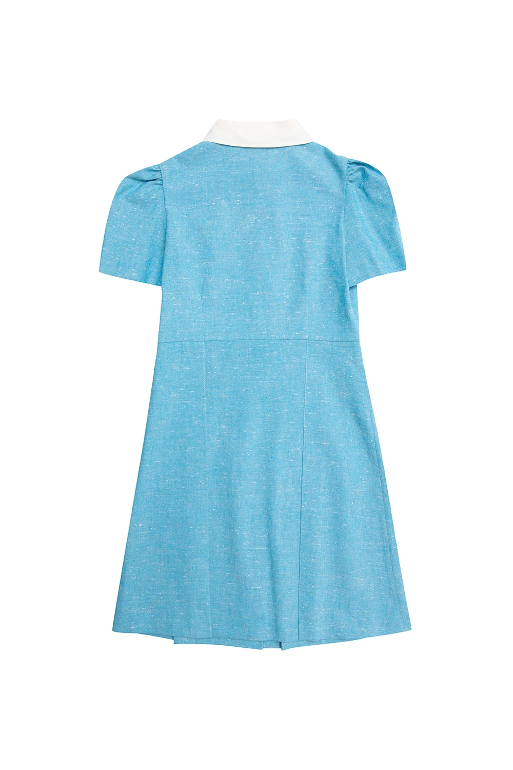 Niebieska sukienka z białym kołnierzem Gucci Kids. Zapinana na guziki oraz kryty zamek z boku. W pasie aplikacje z charakterystycznym dla marki wędzidłem w kolorze postarzanego złota. Krótkie, bufiaste rękawy. Dół wykończony zakładkami.
