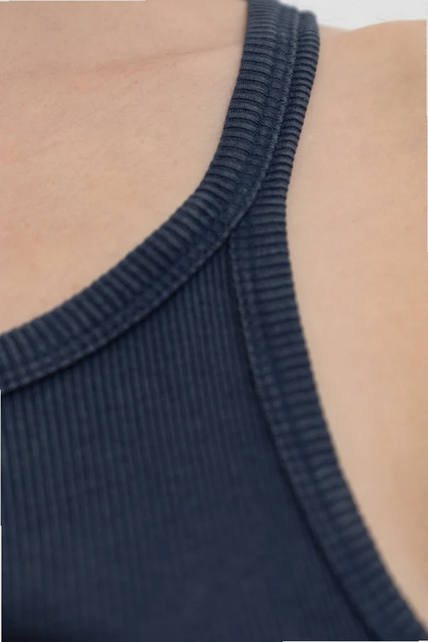 Drobny, prążkowany splot wraz z szeroką lamówką wokół dekoltu oraz pach gwarantują niepowtarzalny styl i trwałość produktu. Top w odcieniu granatowym nie posiada dużych, rzucających się w oczy nadruków, a jedynie subtelną metkę, co dodatkowo podkreśla jego ekskluzywność.