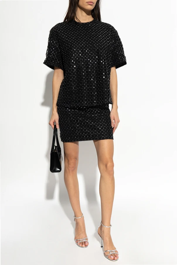Spódnica z cekinami to propozycja marki ROTATE, zachwycająca olśniewającym blaskiem i mistrzowskim wykonaniem. Ta czarna mini spódnica, utrzymana w klasycznym, lekko trapezowym kroju, emanuje szlachetną prostotą. Brak przeszyć czy zaszewek podkreśla minimalistyczną elegancję fasonu.