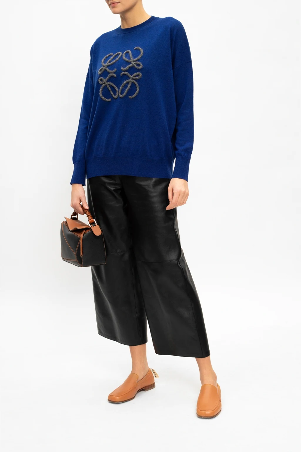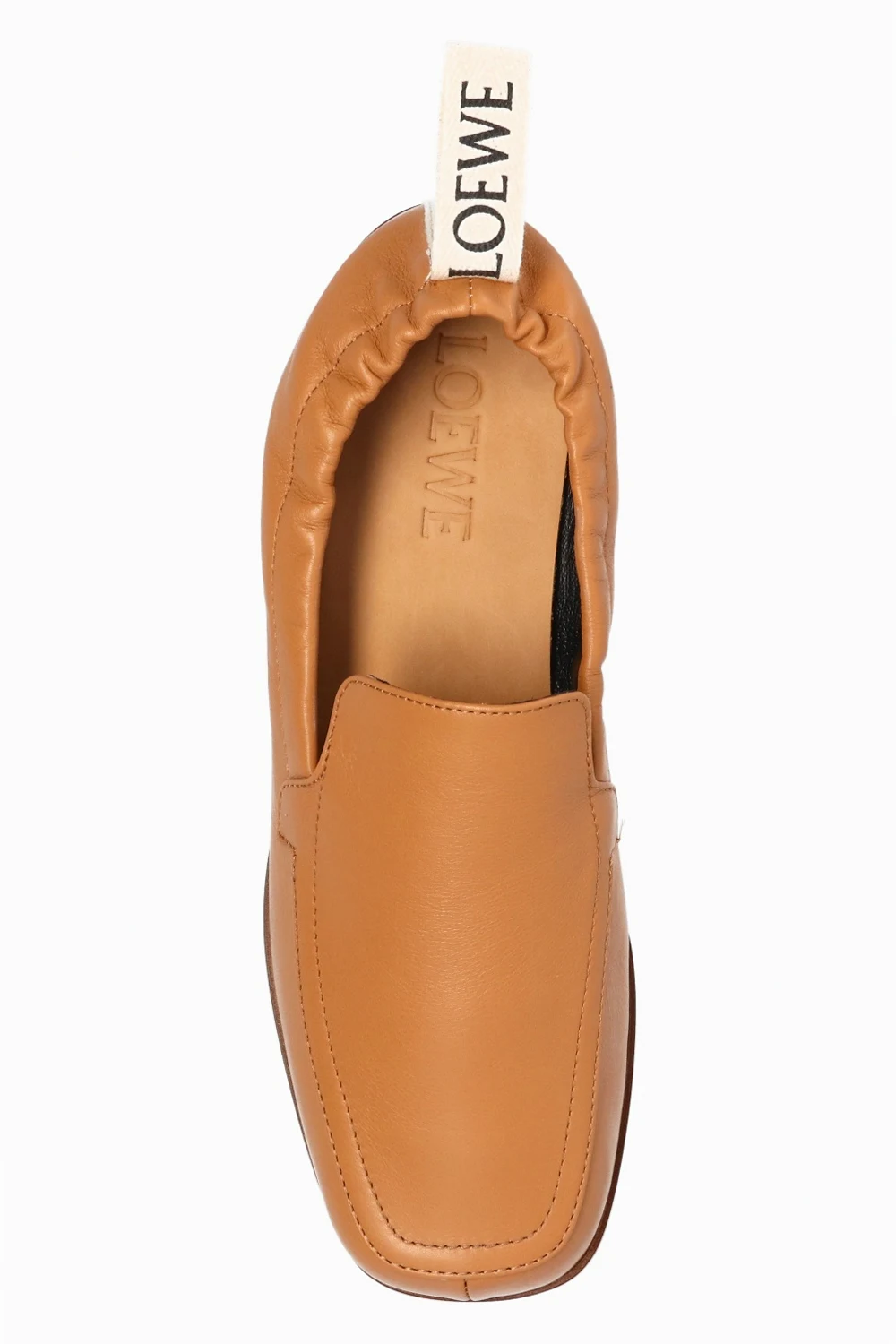 Brązowe, skórzane mokasyny Loewe. Kwadratowy nosek. Z tyłu wszyty ściągacz oraz biały pas z logo w kolorze czarnym. Brązowa, skórzana podeszwa.
