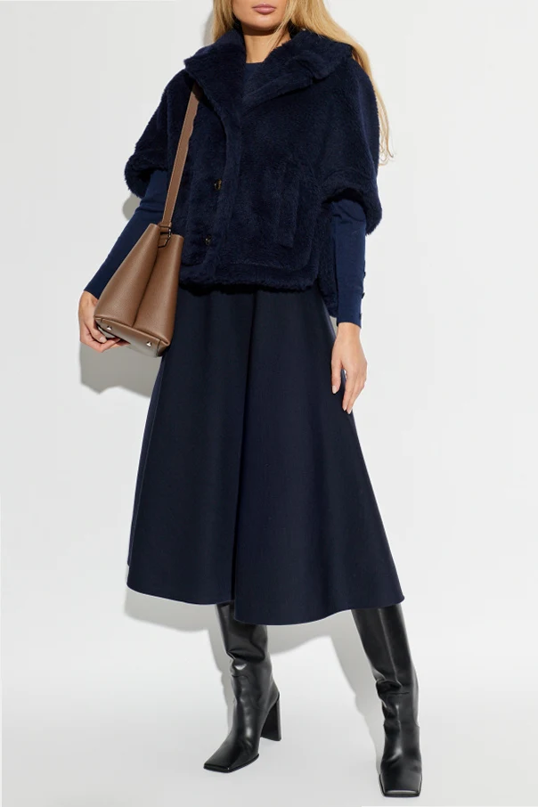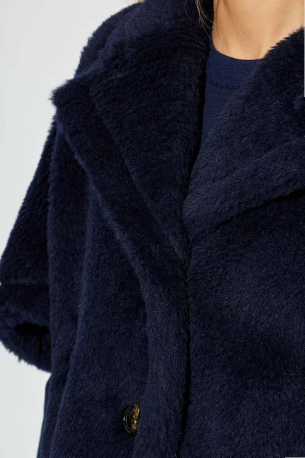 Subtelnie wszyte, boczne kieszenie niemal znikają w puszystej strukturze materiału, zaś dwa duże, granatowe guziki stanowią stylowe zapięcie. Dbałość o detal wieńczy umieszczone wewnątrz logo legendarnego domu mody Max Mara. Wnętrze w pełni wykończono miękką wiskozą dla maksymalnego komfortu noszenia.