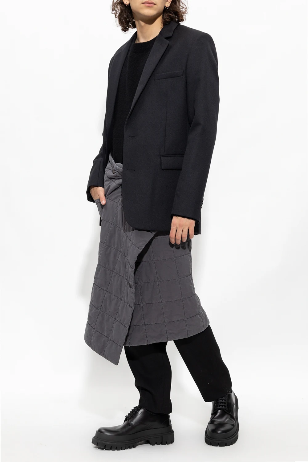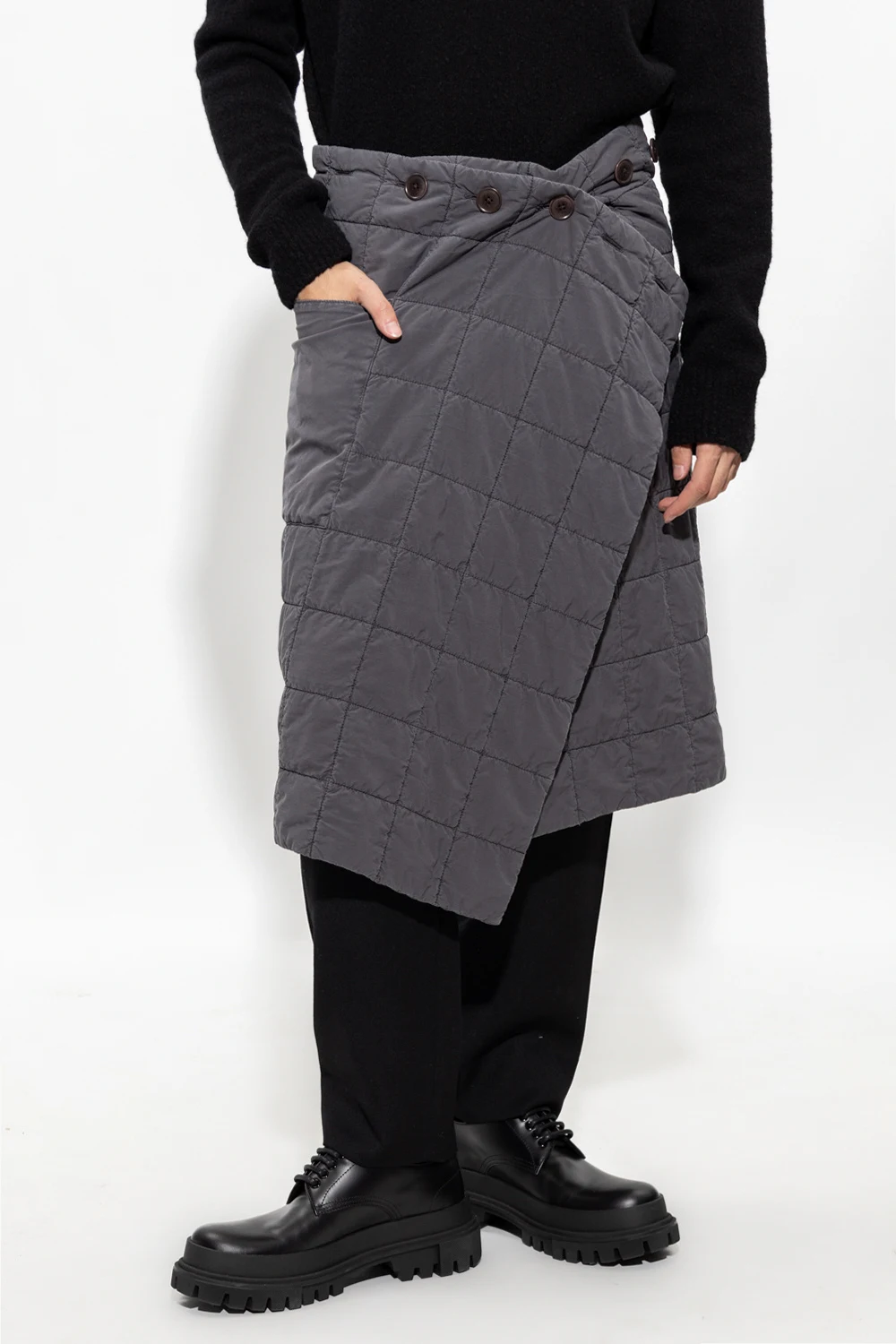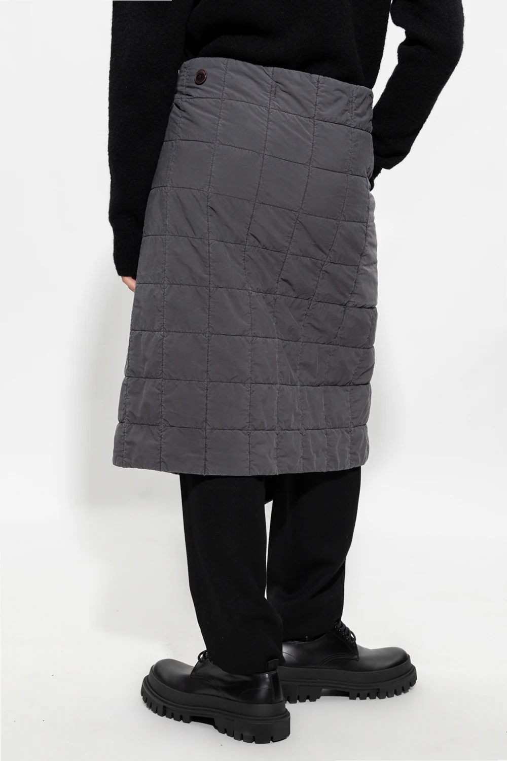 Szara, pikowana spódnica Lemaire. Wykonana z mieszanki bawełny. Zapinana na guziki. Wsuwana kieszeń. Możliwość noszenia na wiele sposobów.