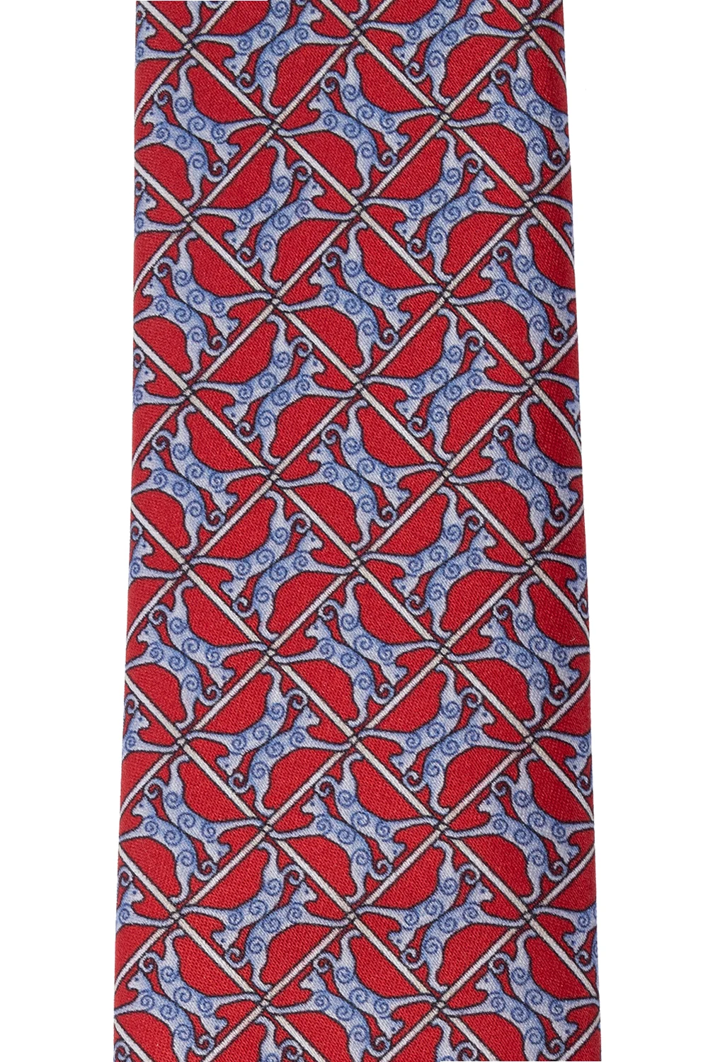 Czerwony krawat Lanvin. Wykonany z jedwabiu. Ozdobiony wzorem z motywem zwierzęcym w kolorze niebieskim.