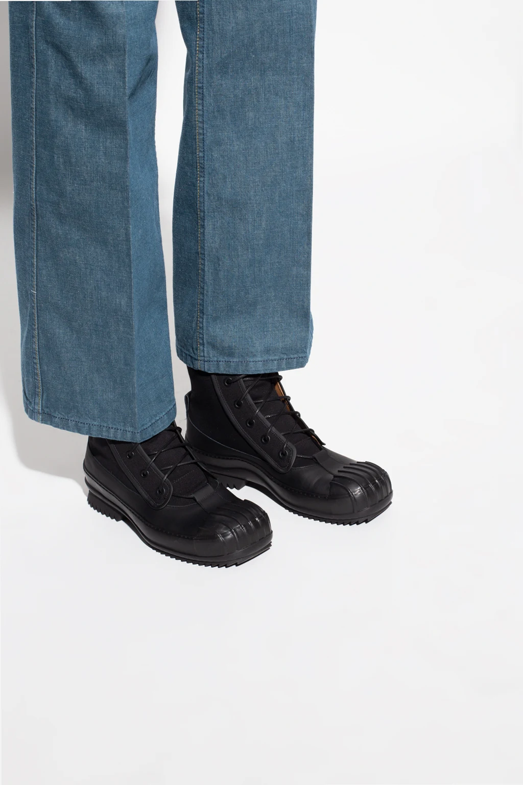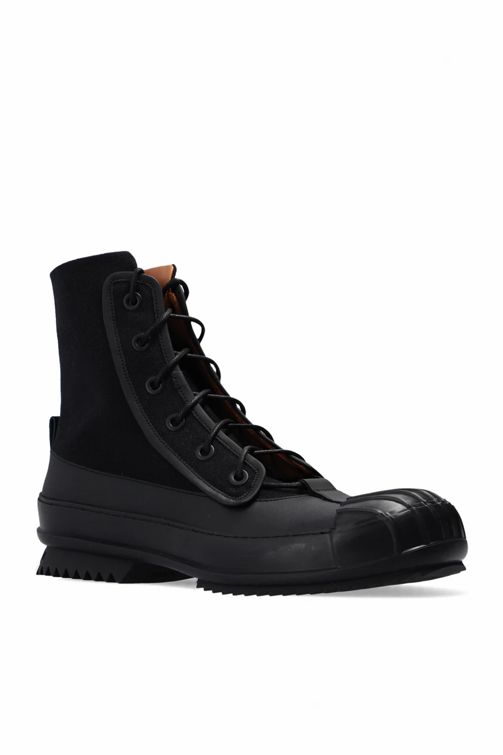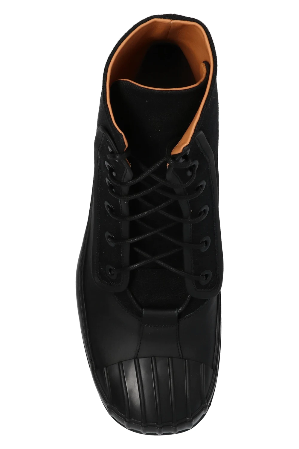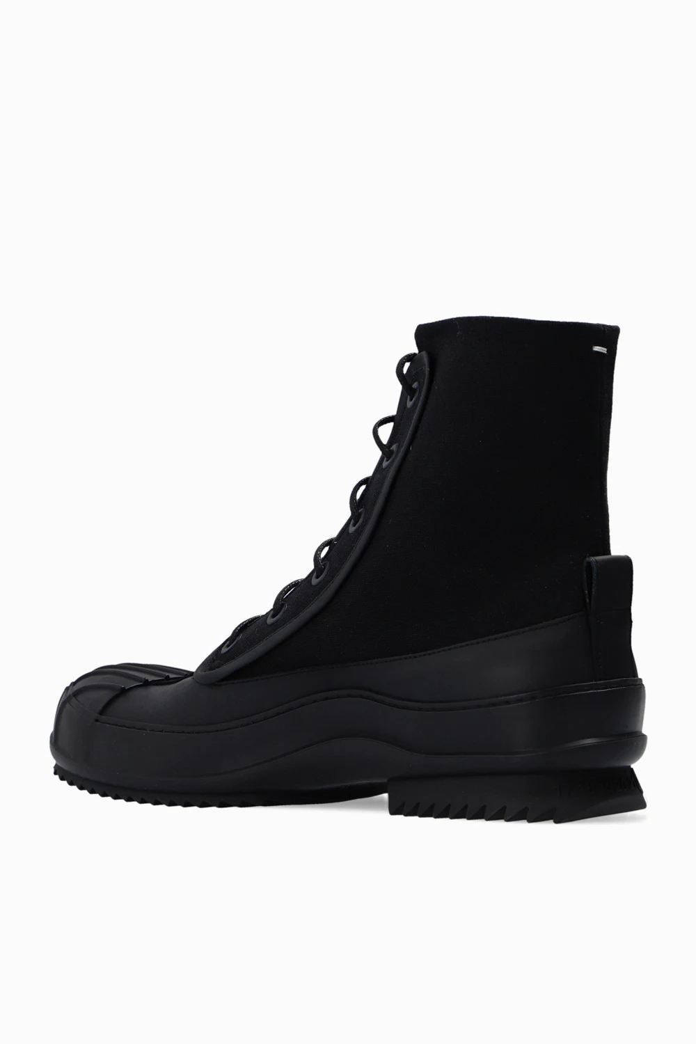 Czarne, sznurowane buty za kostkę Maison Margiela. Wykończone skórą. Czarna, gumowa podeszwa.