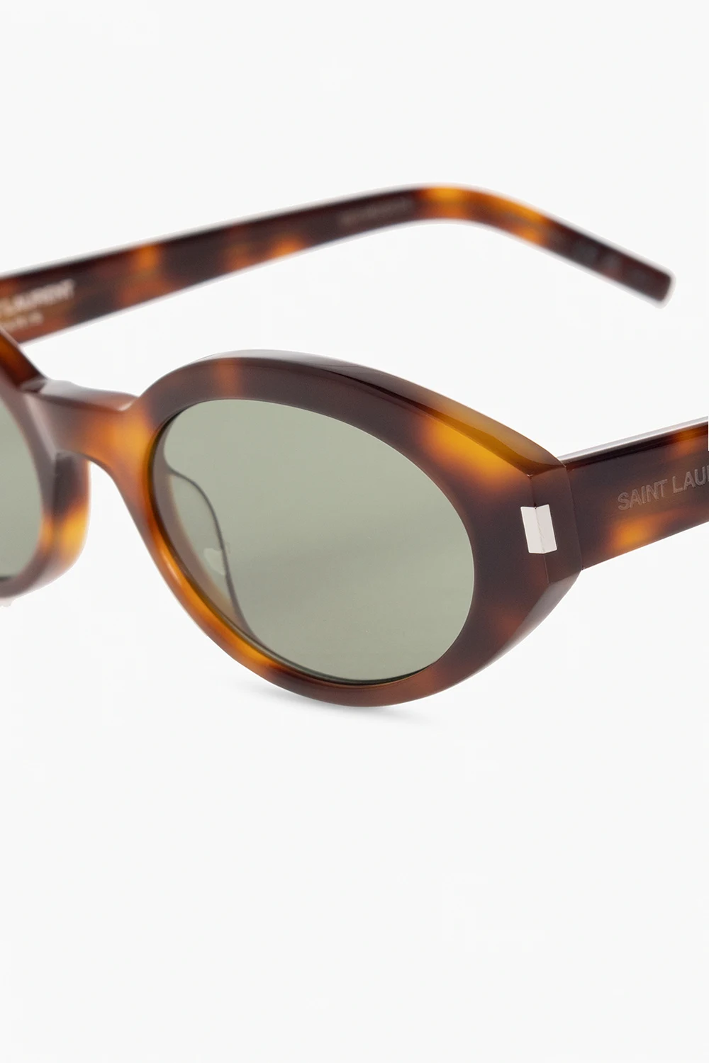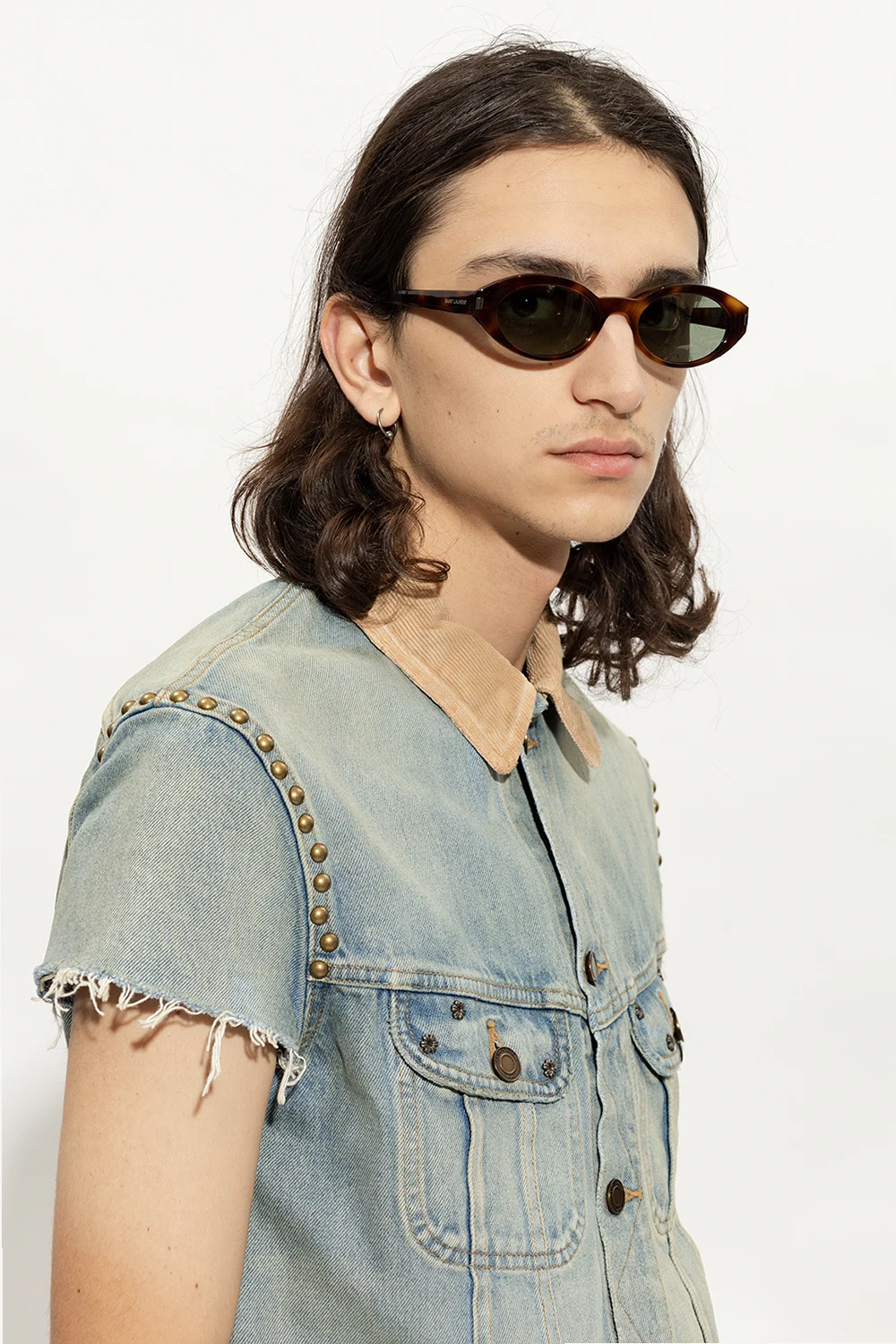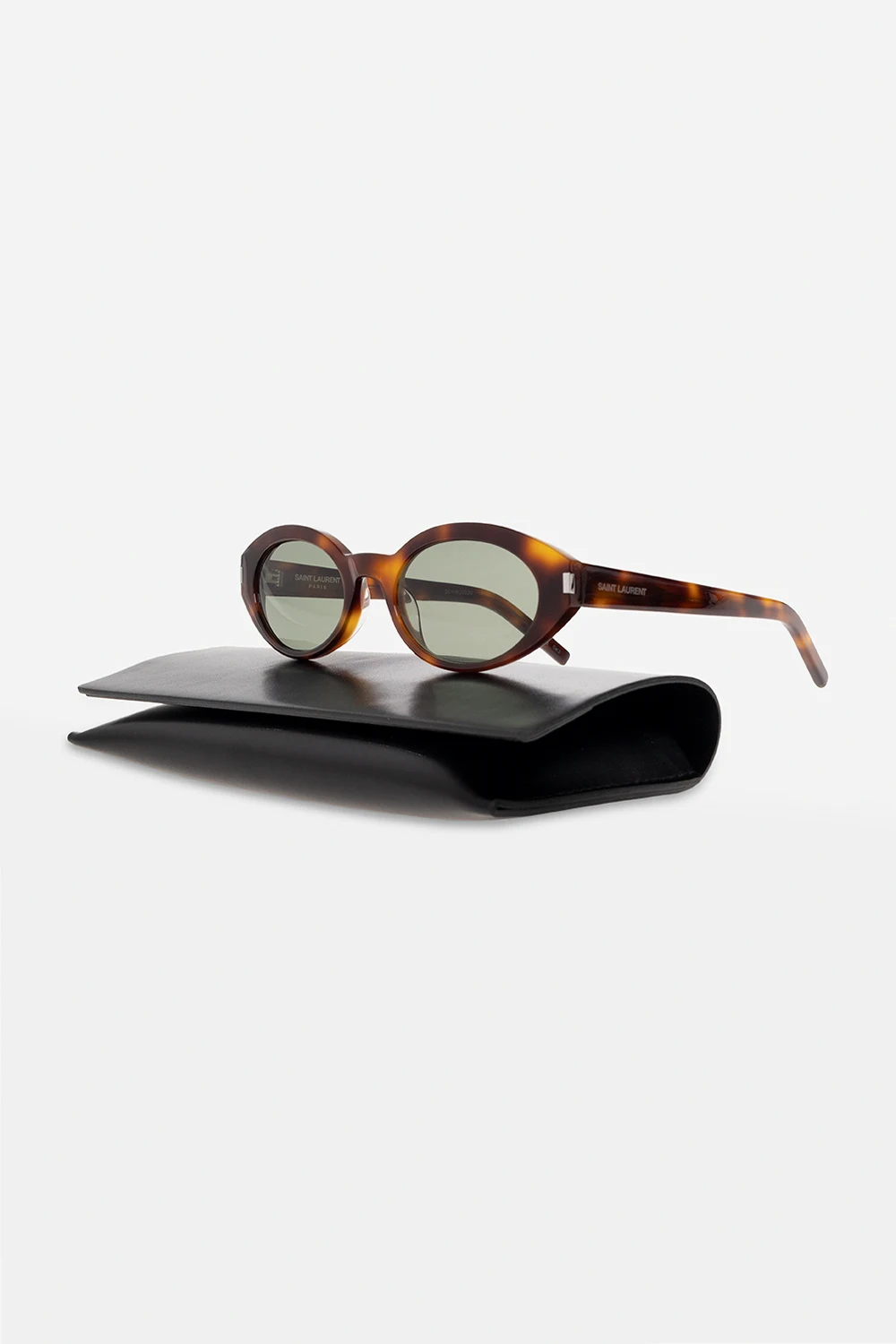 Brązowe, szylkretowe okulary przeciwsłoneczne, model ‘SL 567’ Saint Laurent. Zaokrąglone oprawki w kształcie kocich oczu. Zauszniki ozdobione logo. Zielone szkła ze 100% ochroną przed promieniowaniem UVA/UVB. Dołączone etui.