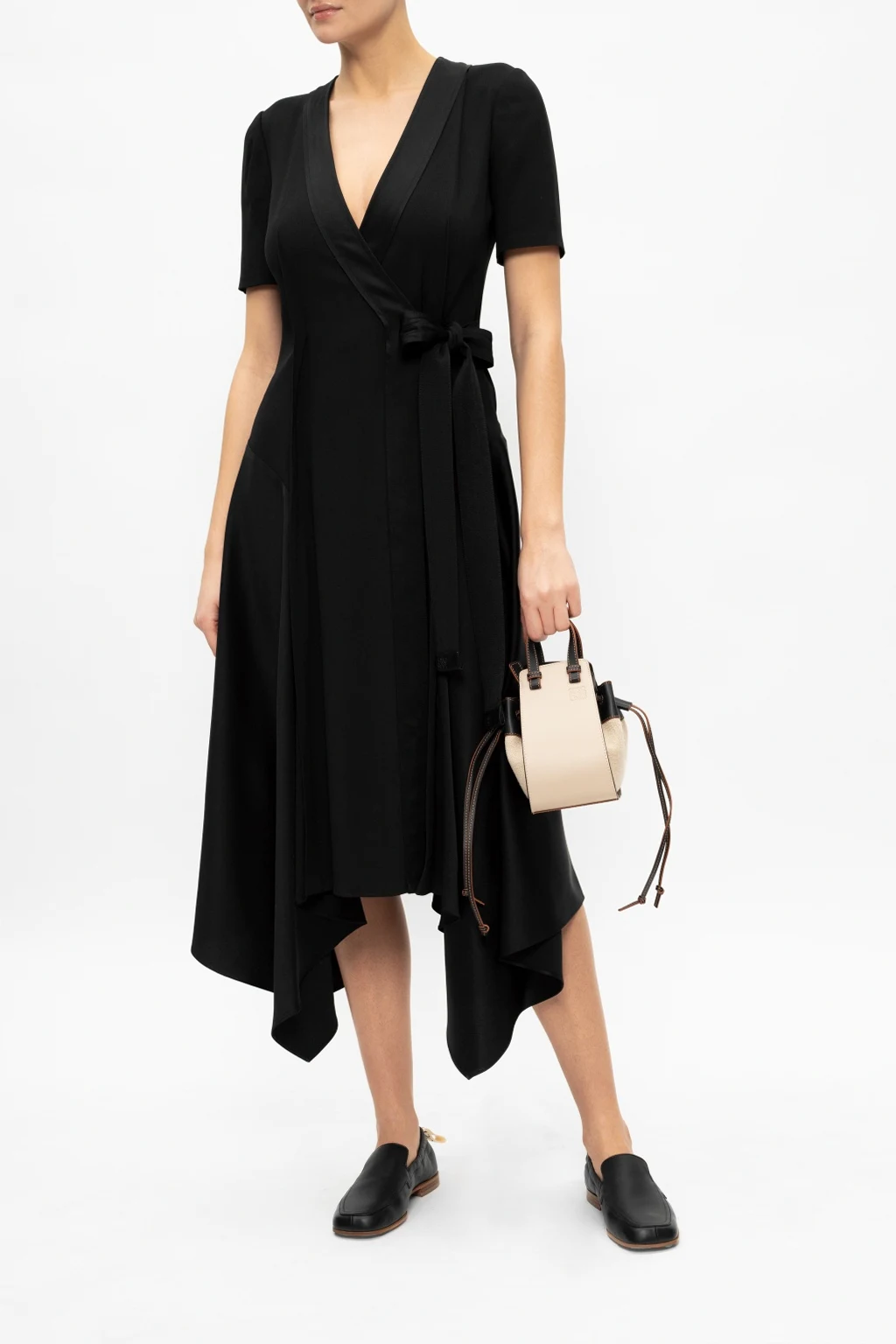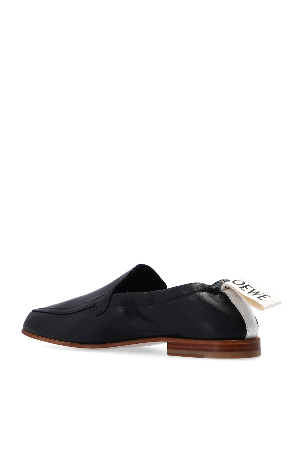 Czarne, skórzane mokasyny Loewe. Kwadratowy nosek. Z tyłu wszyty ściągacz oraz biały pas z logo w kolorze czarnym. Brązowa, skórzana podeszwa.