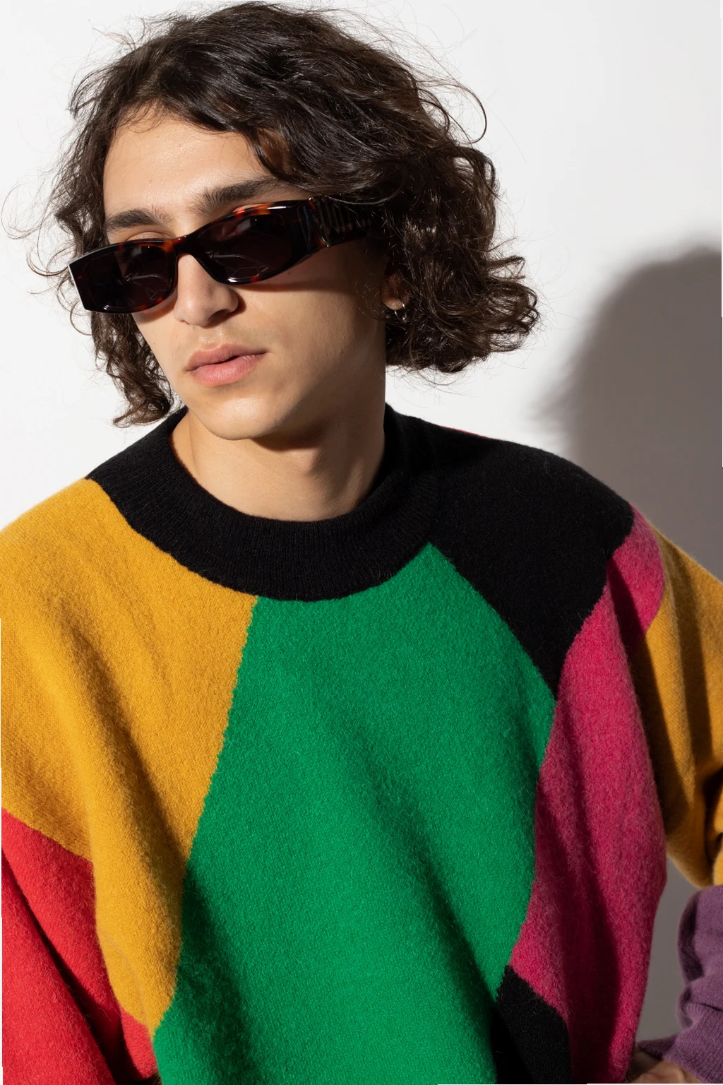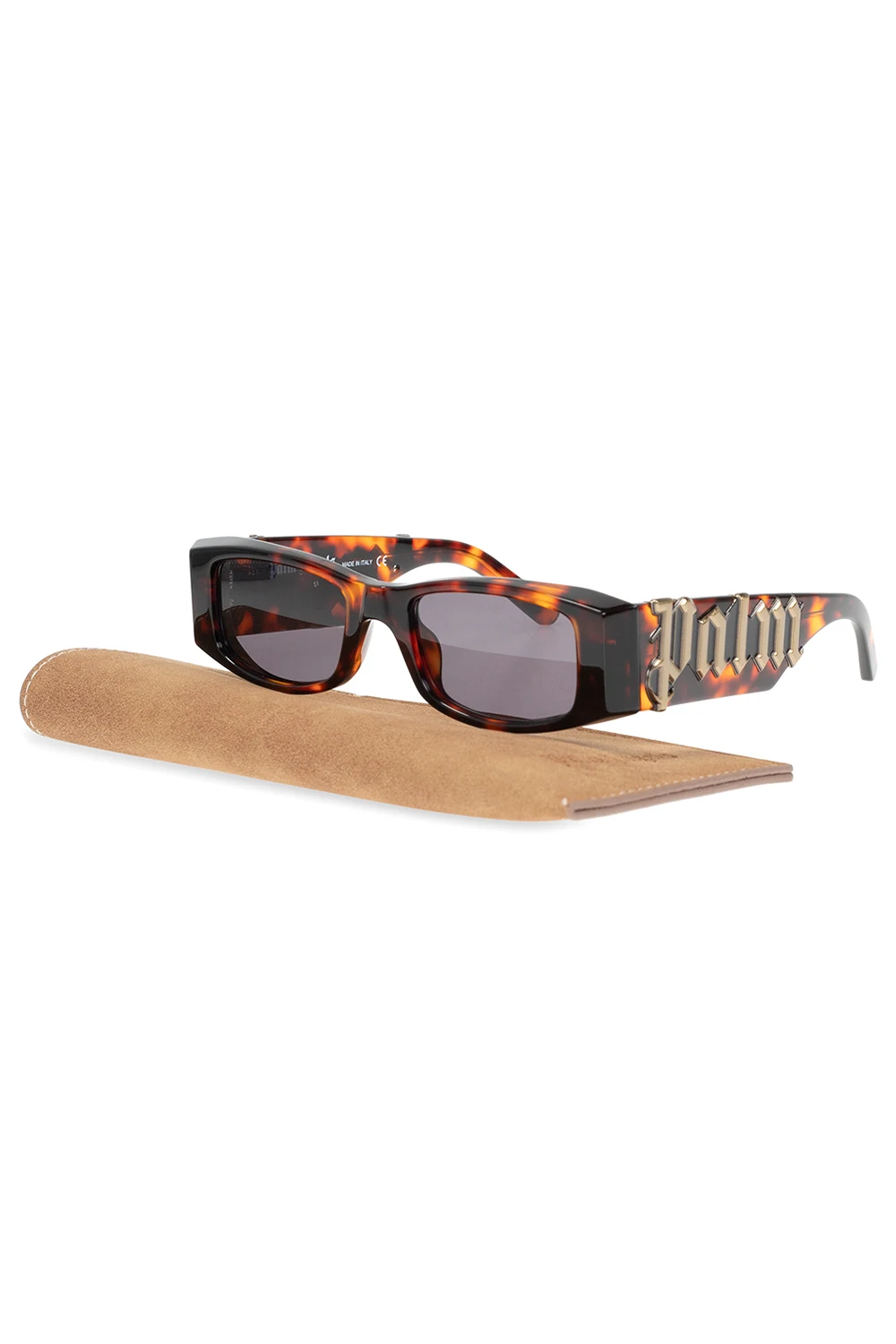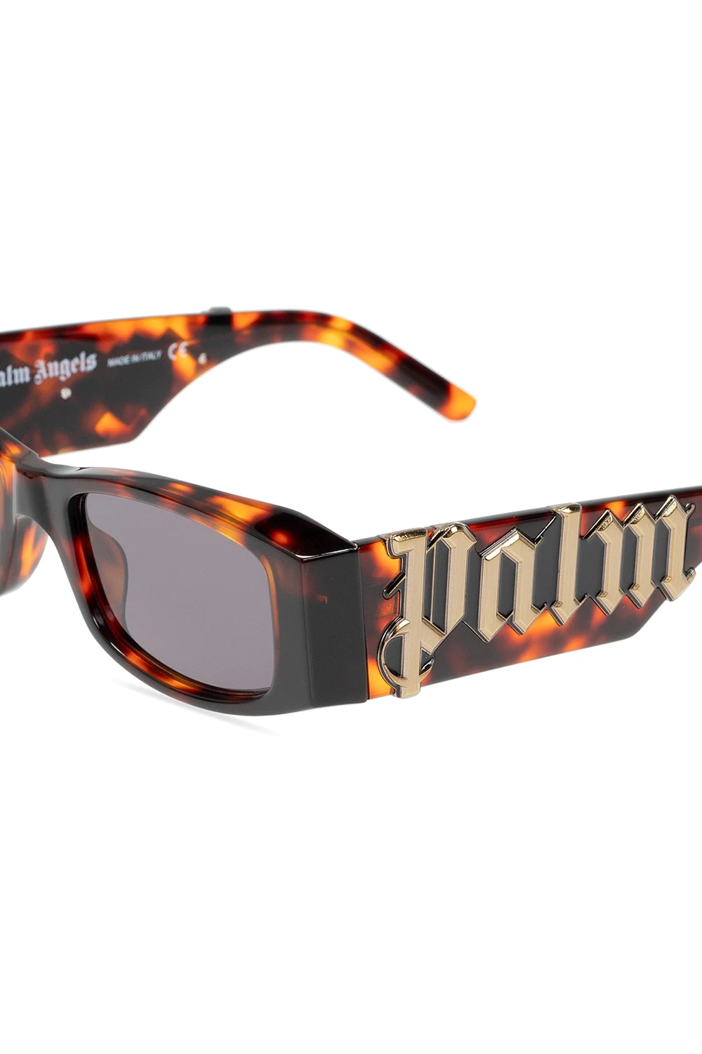 Brązowe okulary przeciwsłoneczne Palm Angels. Wypukłe logo w kolorze złotym. Czarne, certyfikowane soczewki UVA/UVB. Dołączone etui.