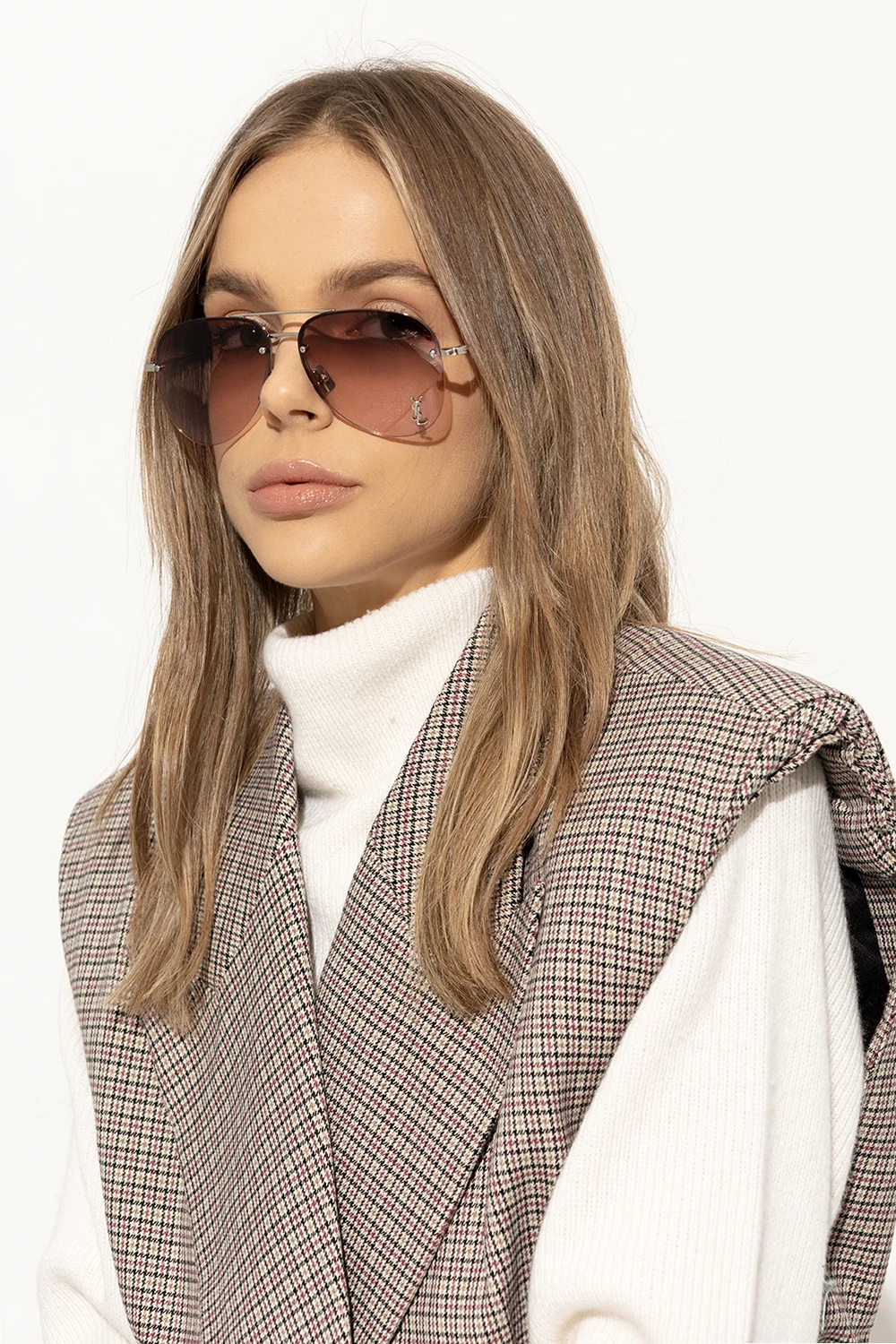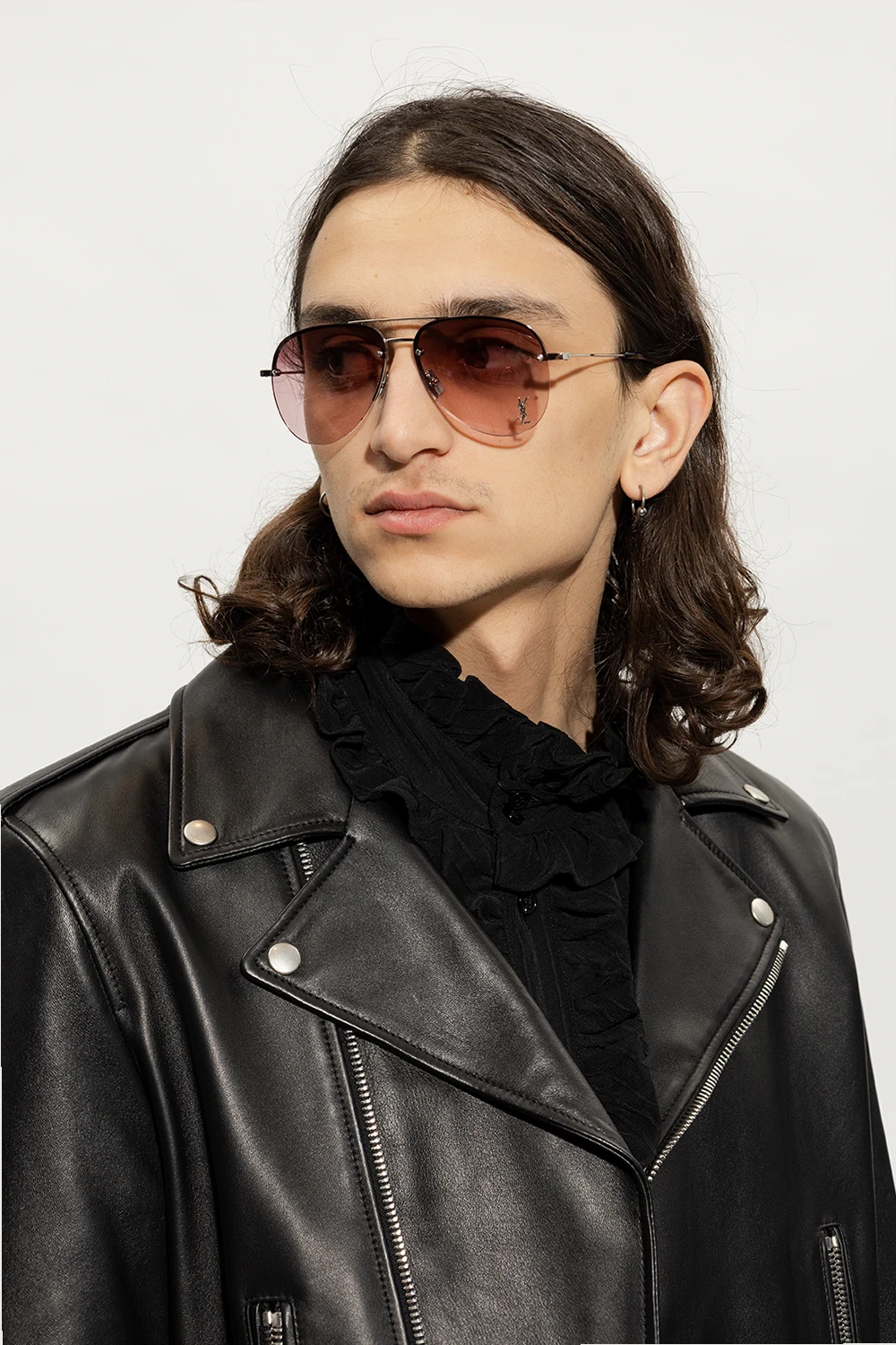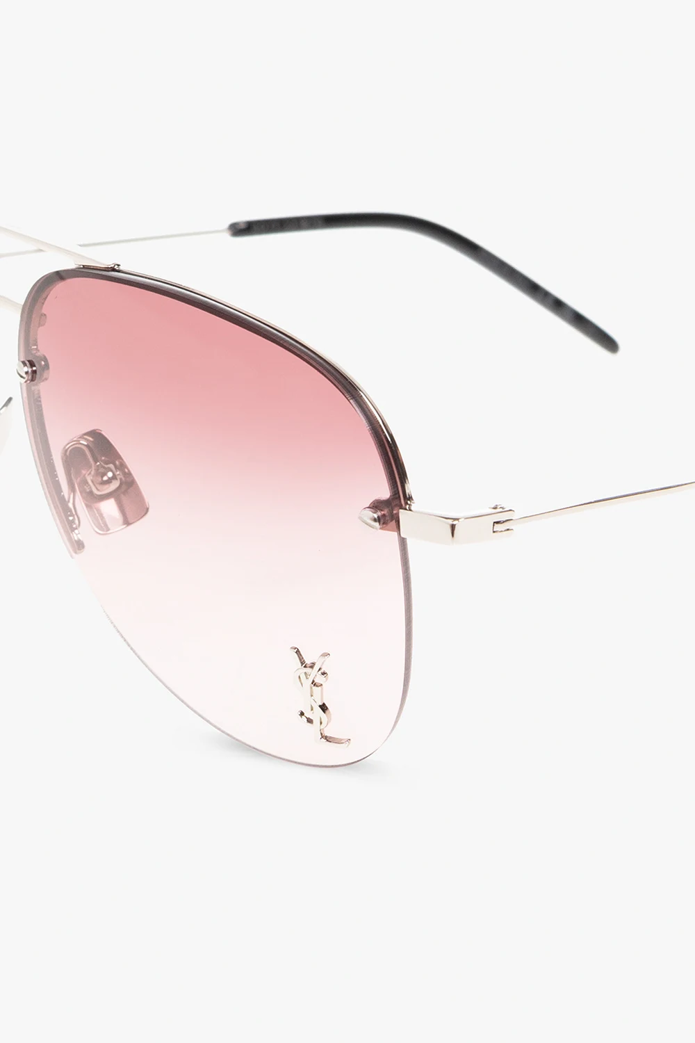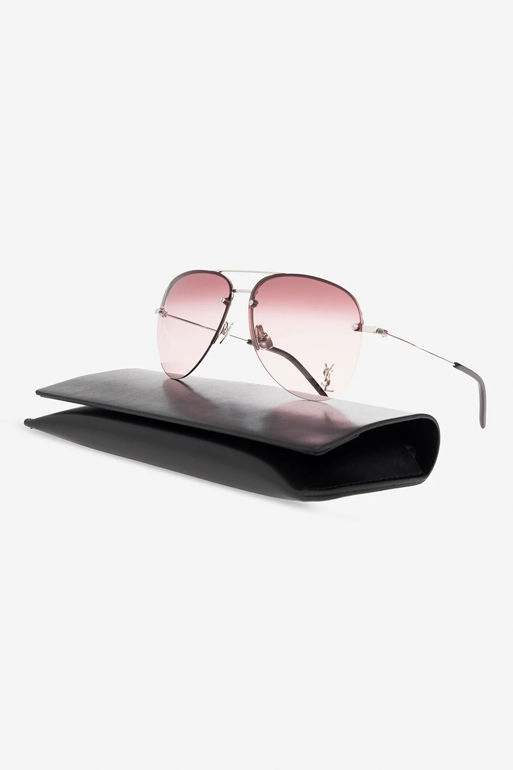Okulary przeciwsłoneczne w kolorze srebrnym, model ‘CLASSIC 11 M’ Saint Laurent. Oprawki typu ‘aviator’. Z przodu ozdobione metalową aplikacją w kształcie logo. Jasnofioletowe, gradientowe szkła ze 100% ochroną przed promieniowaniem UVA/UVB. Dołączone etui.