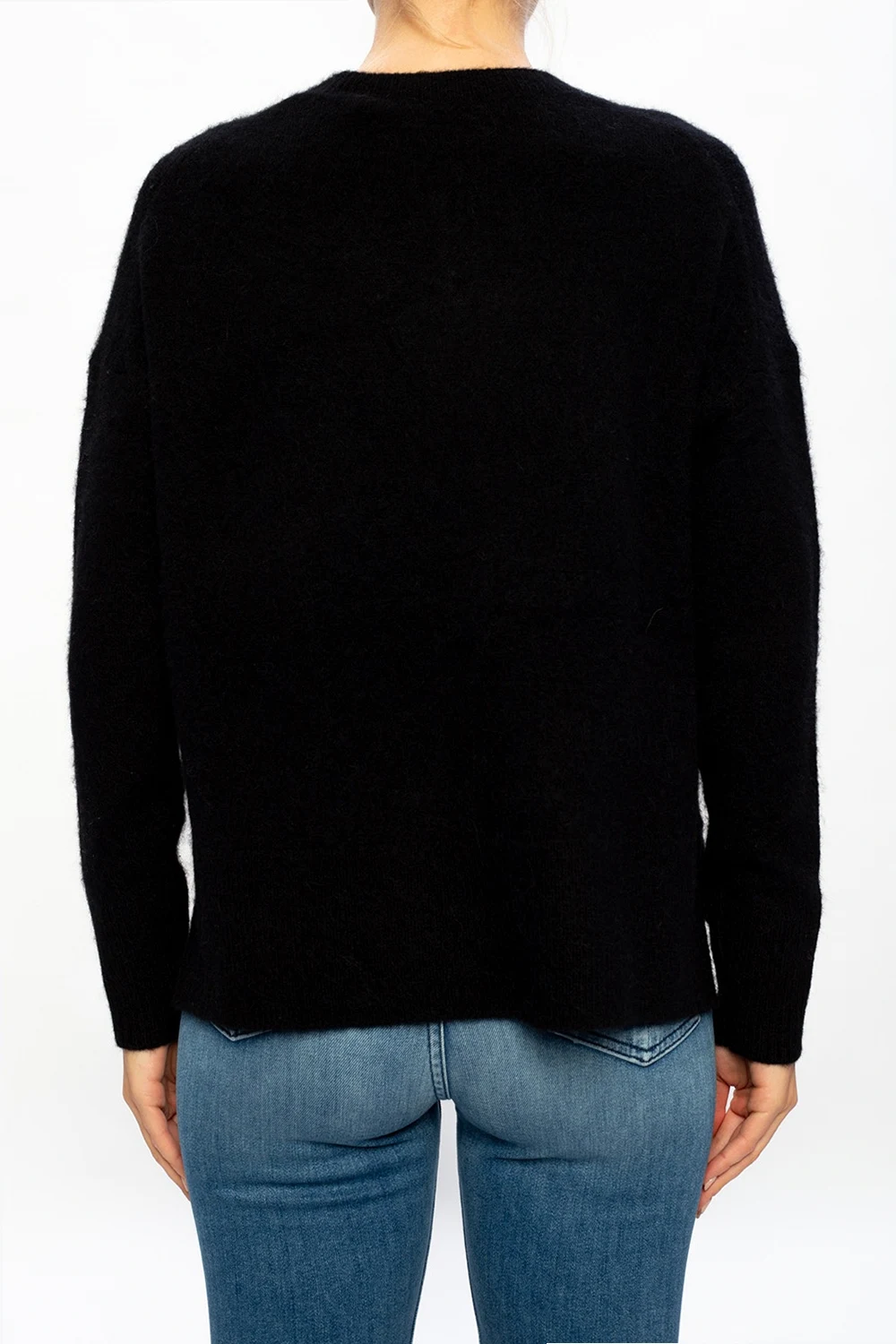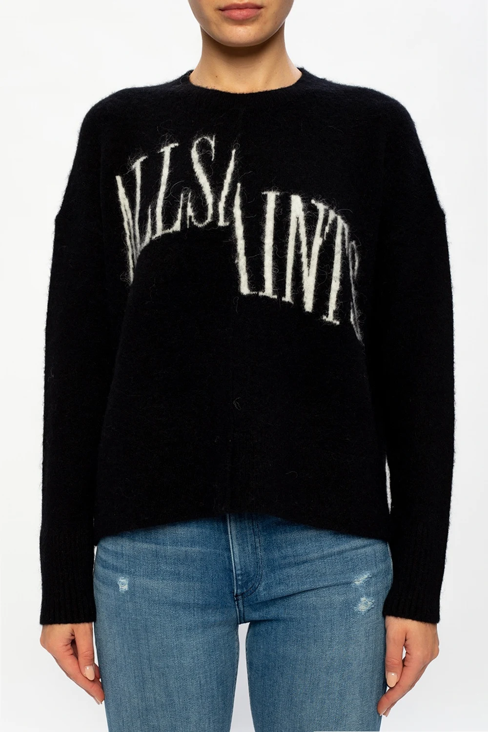 Czarny sweter, model 'Split' AllSaints. Ozdobiony wyszytym logo w kolorze białym. Okrągły dekolt. Dół oraz rękawy zakończone ściągaczami. Po bokach rozcięcia.