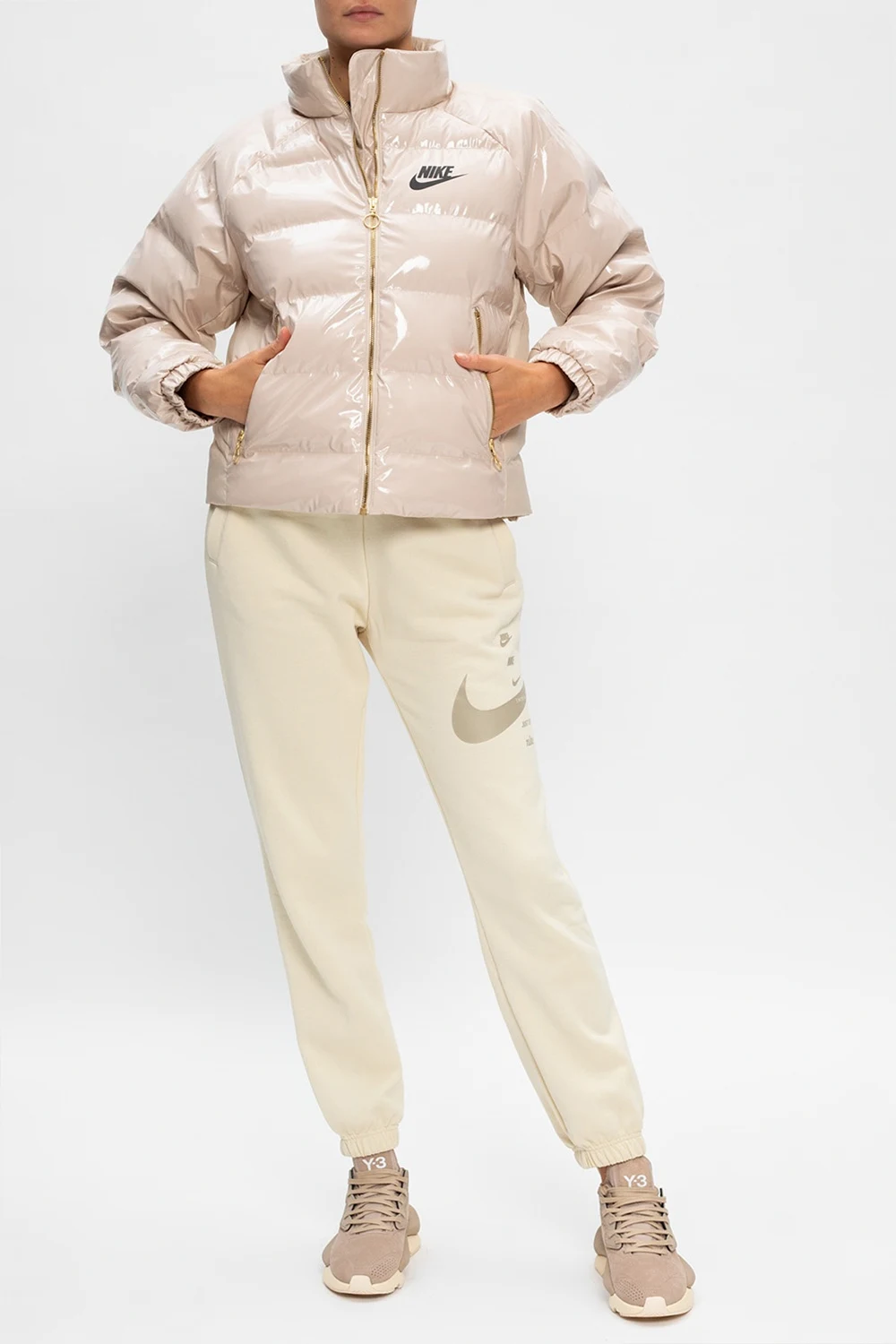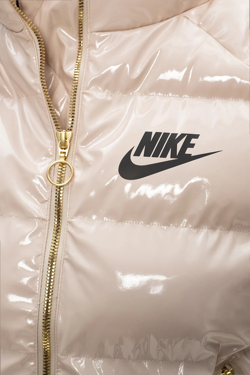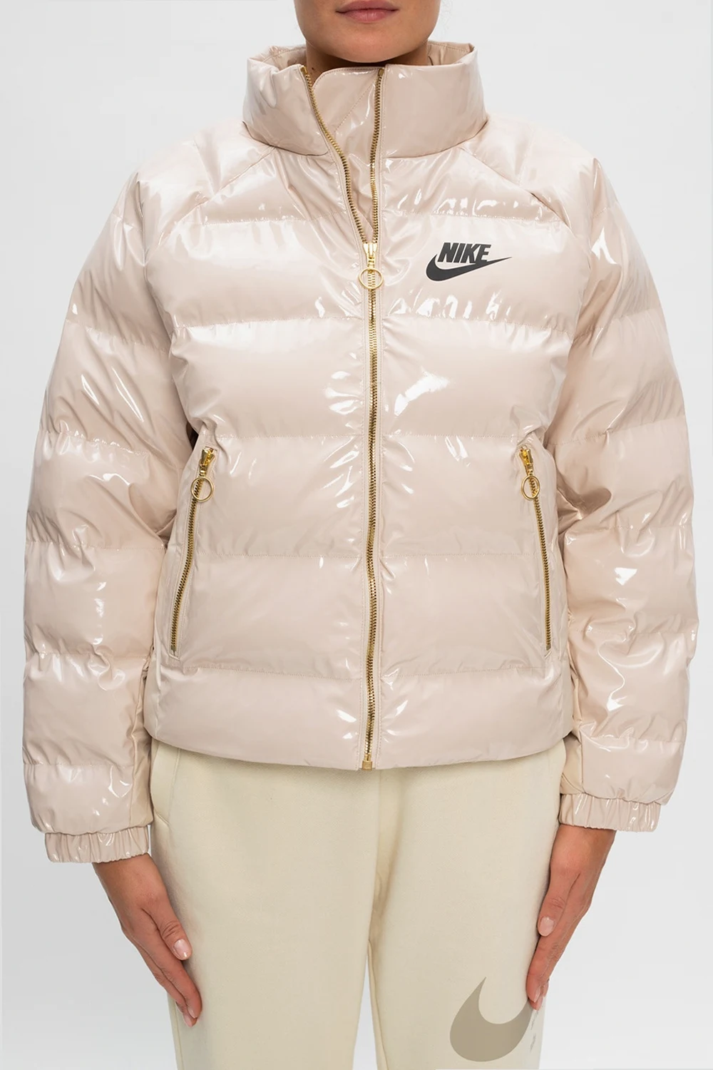 Beżowa, lakierowana kurtka Nike. Zapinana na zamek. Nadruk z logo w kolorze czarnym. Dwie kieszenie zapinane na zamki. Rękawy zakończone ściągaczami. Metalowe elementy w kolorze złotym.