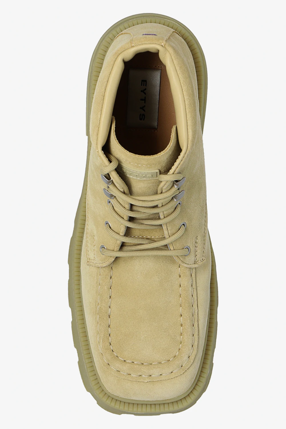 Jasnozielone, sznurowane buty za kostkę na platformie, model 'Tribeca' Eytys. Wykonane z zamszu. Język ozdobiony gumową naszywką z logo. Z przodu dekoracyjne przeszycia. Jasnozielona, gumowa podeszwa z wytłoczonymi prążkowaniami.