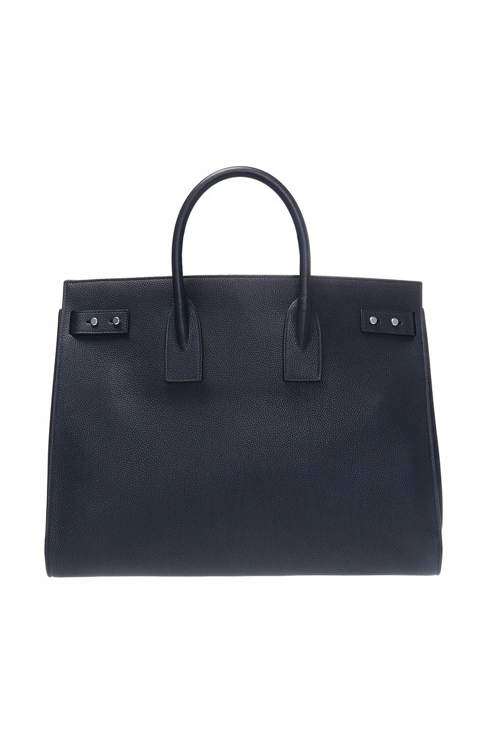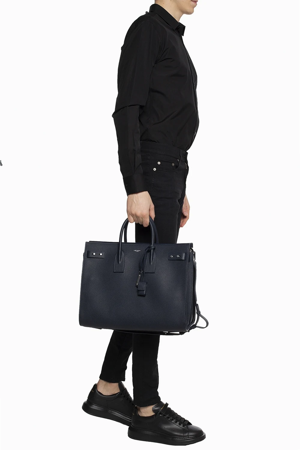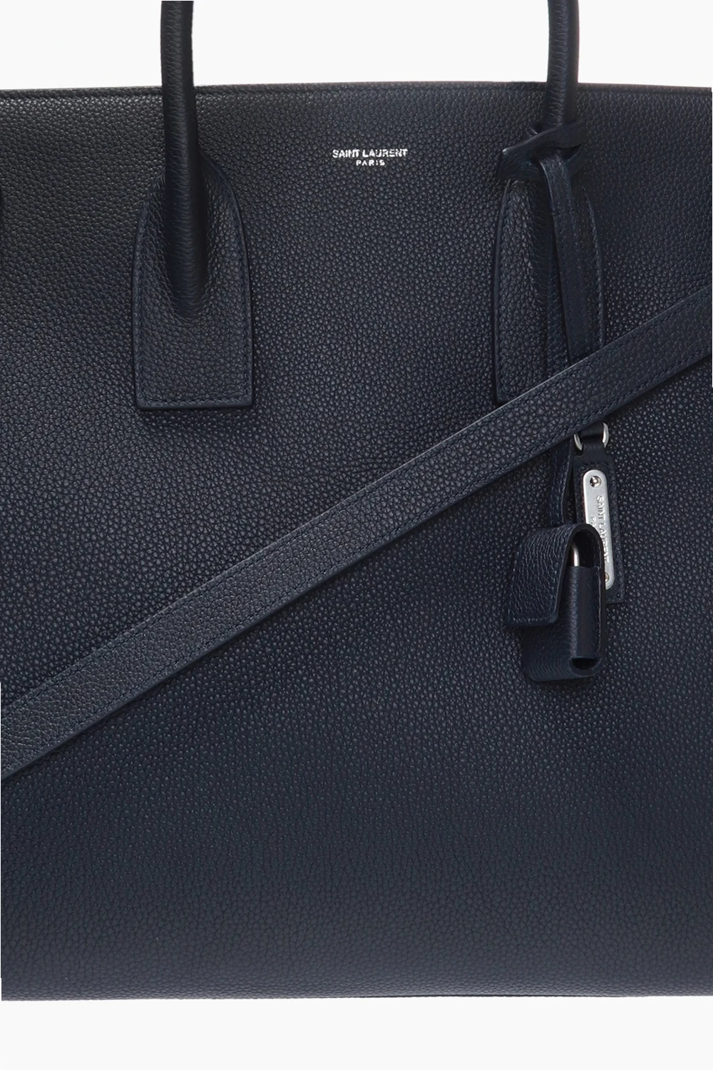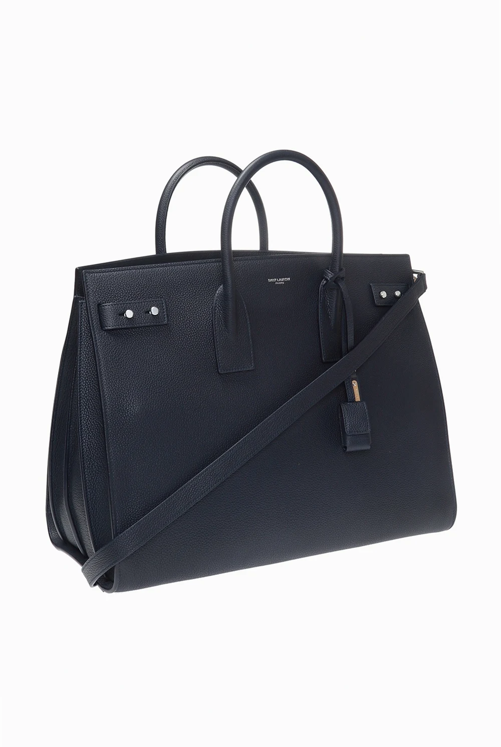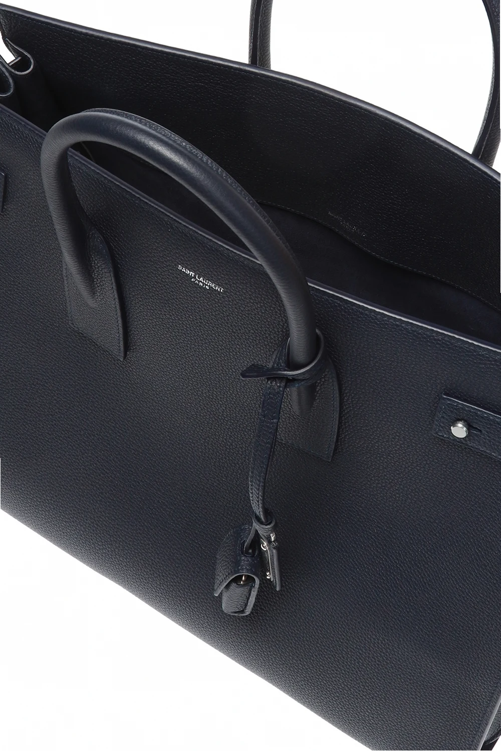Granatowa torba na ramię, model 'Sac de Jour' Saint Laurent, rozmiar 'large'. Wykonana ze skóry cielęcej o specjalnej fakturze. Z przodu nadruk z logo w kolorze srebrnym. Odpinany, regulowany pasek na ramię. Dwie półokrągłe rączki. Wewnątrz dwie przegrody oraz kieszeń zamykana na zamek. Dołączona zawieszka z logo oraz kłódką.