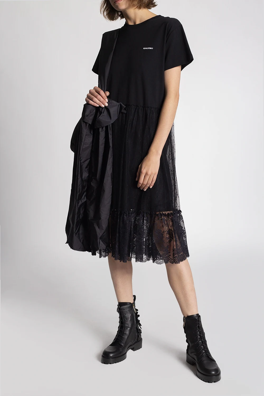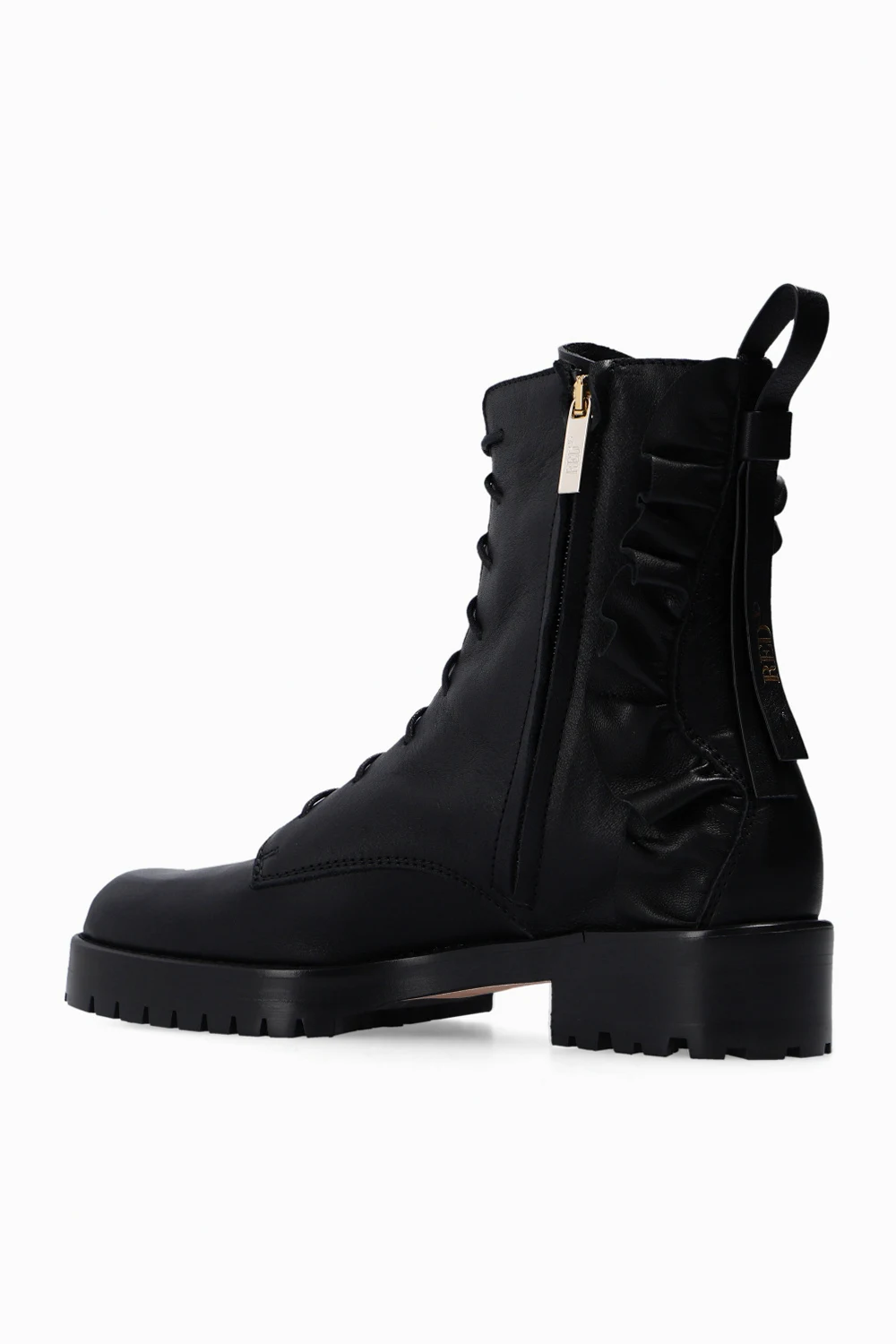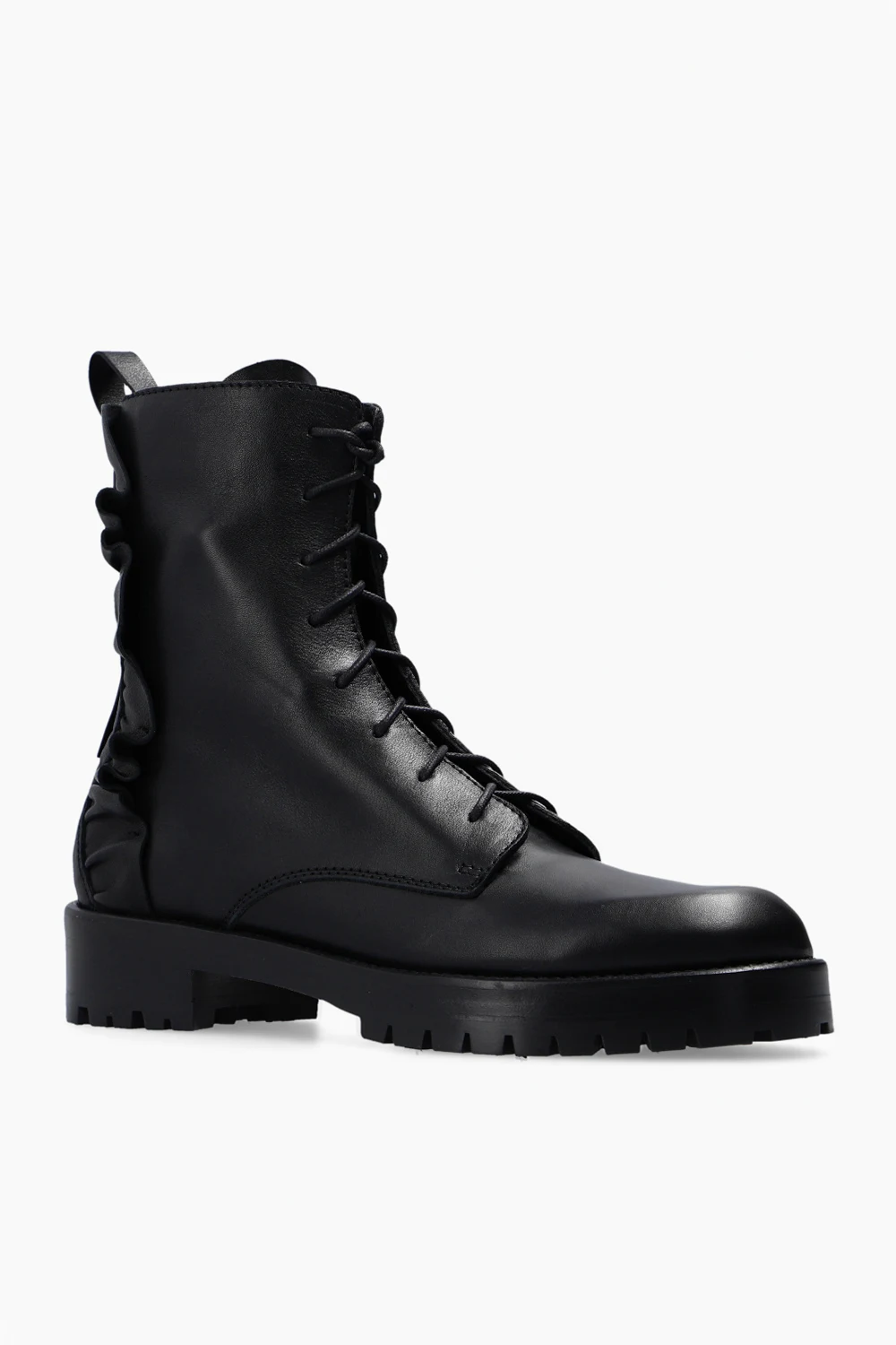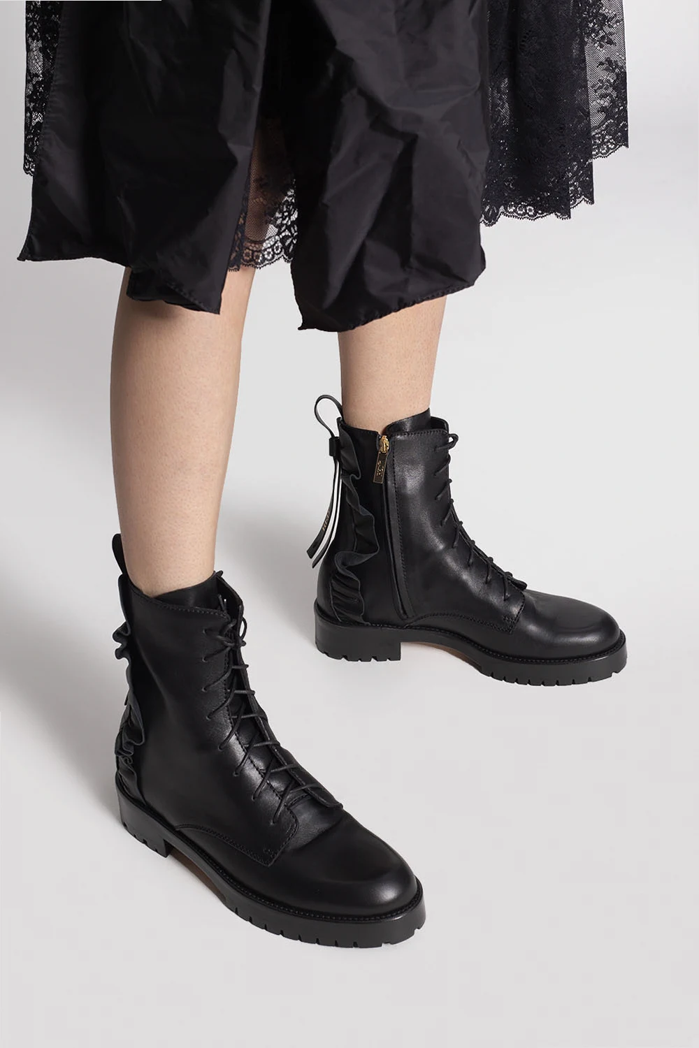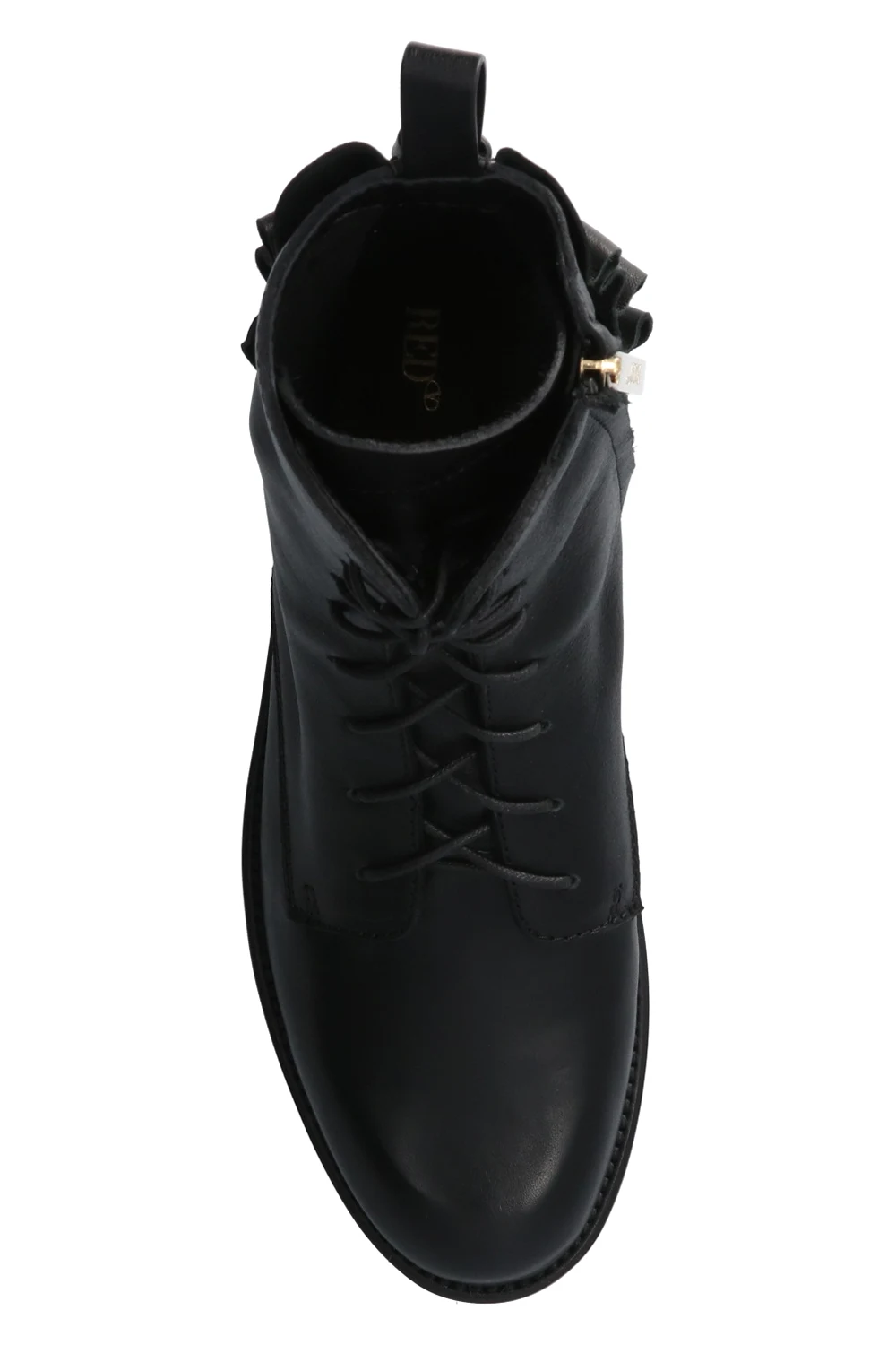 Czarne, sznurowane botki Red Valentino. Wykonane ze skóry. Z boku zapięcie na zamek. Po bokach ozdobione falbaną. Z tyłu dekoracyjne troki z logo w kolorze złotym. Beżowo-czarna podeszwa wykonana ze skóry oraz gumy.