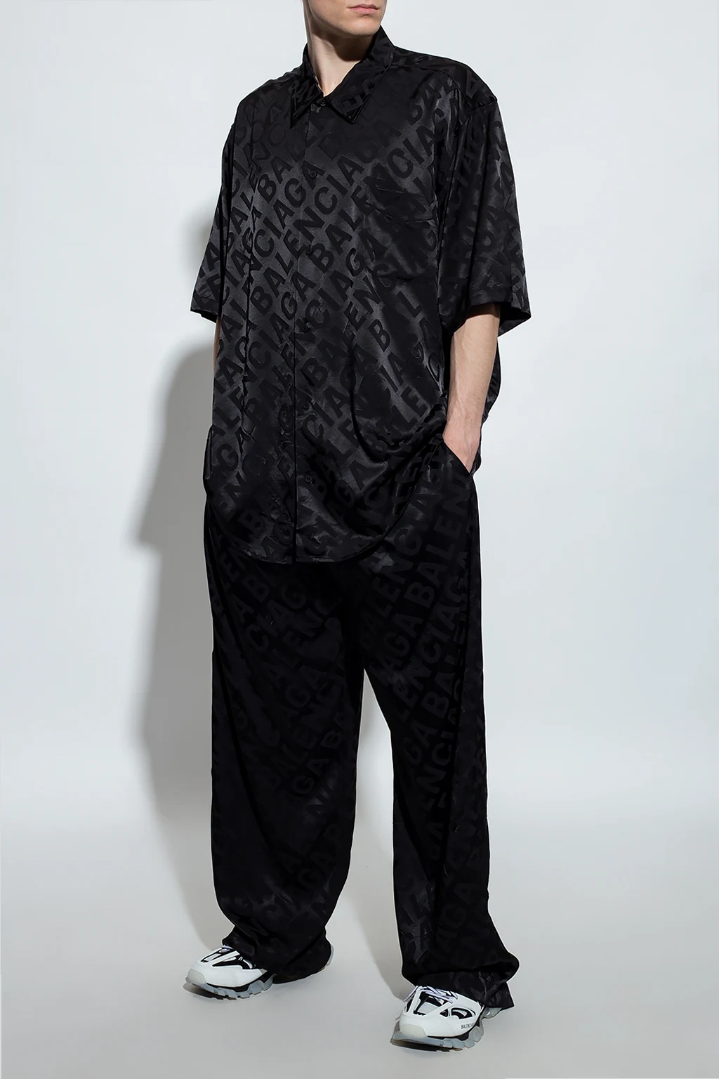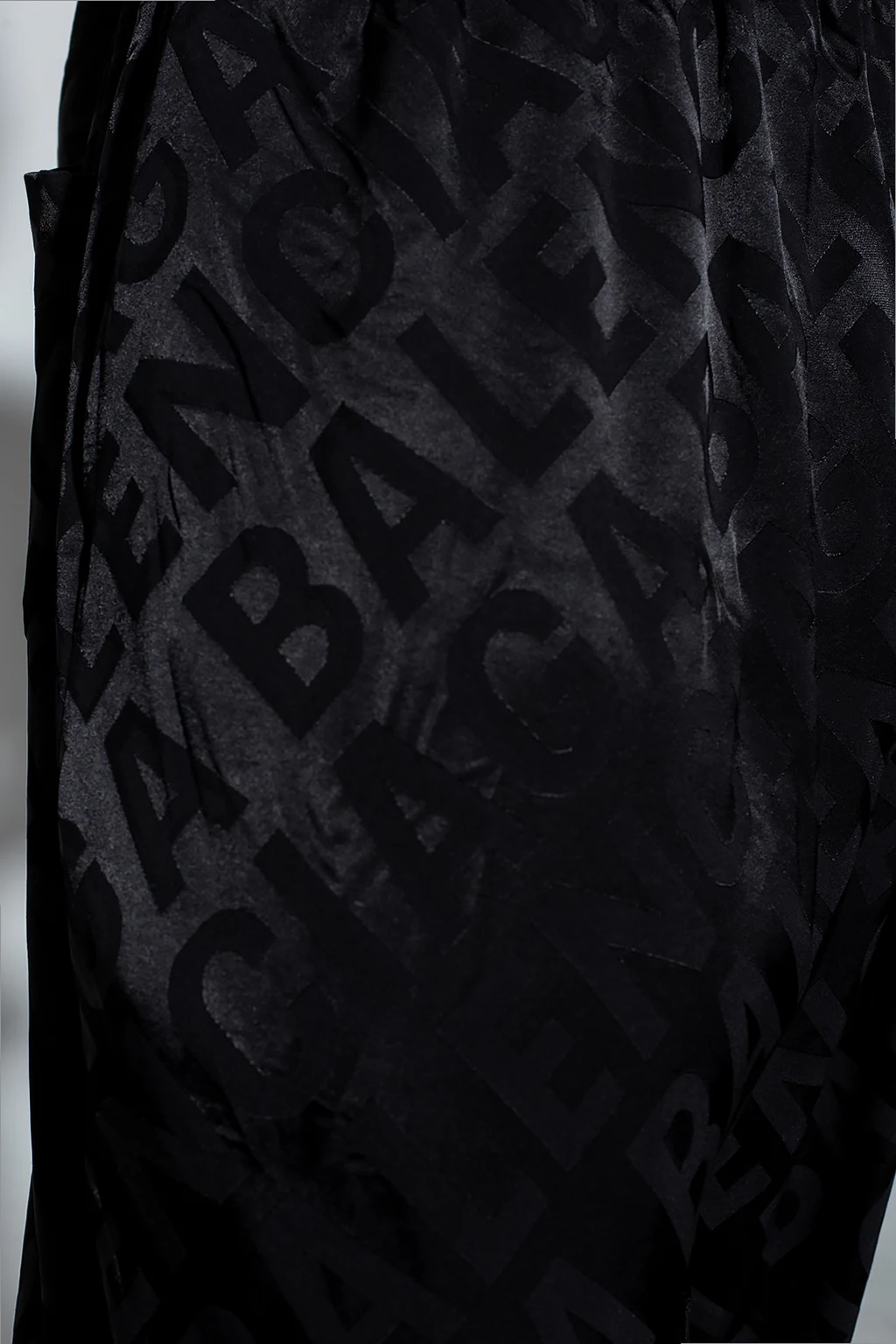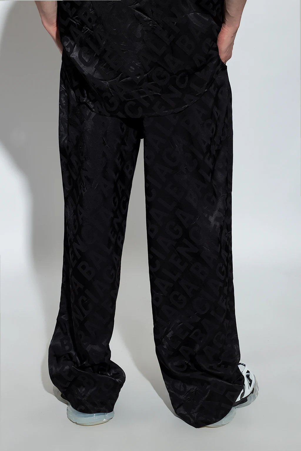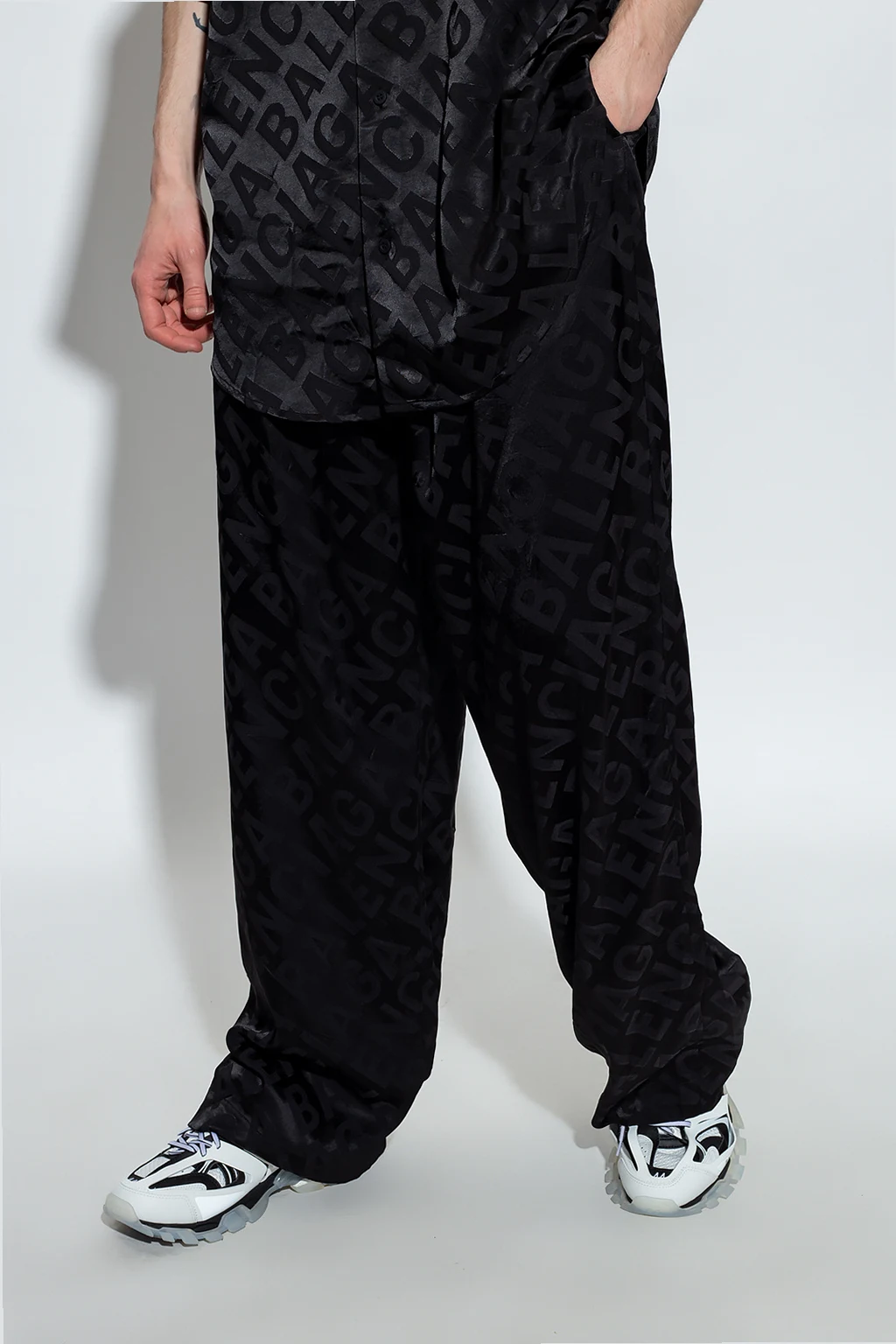 Czarne spodnie Balenciaga. W pasie wszyta guma ściągana trokami. Ozdobione wyszytym wzorem z motywem logo. Z przodu naszyte logo. Dwie wsuwane kieszenie. Szerokie nogawki.