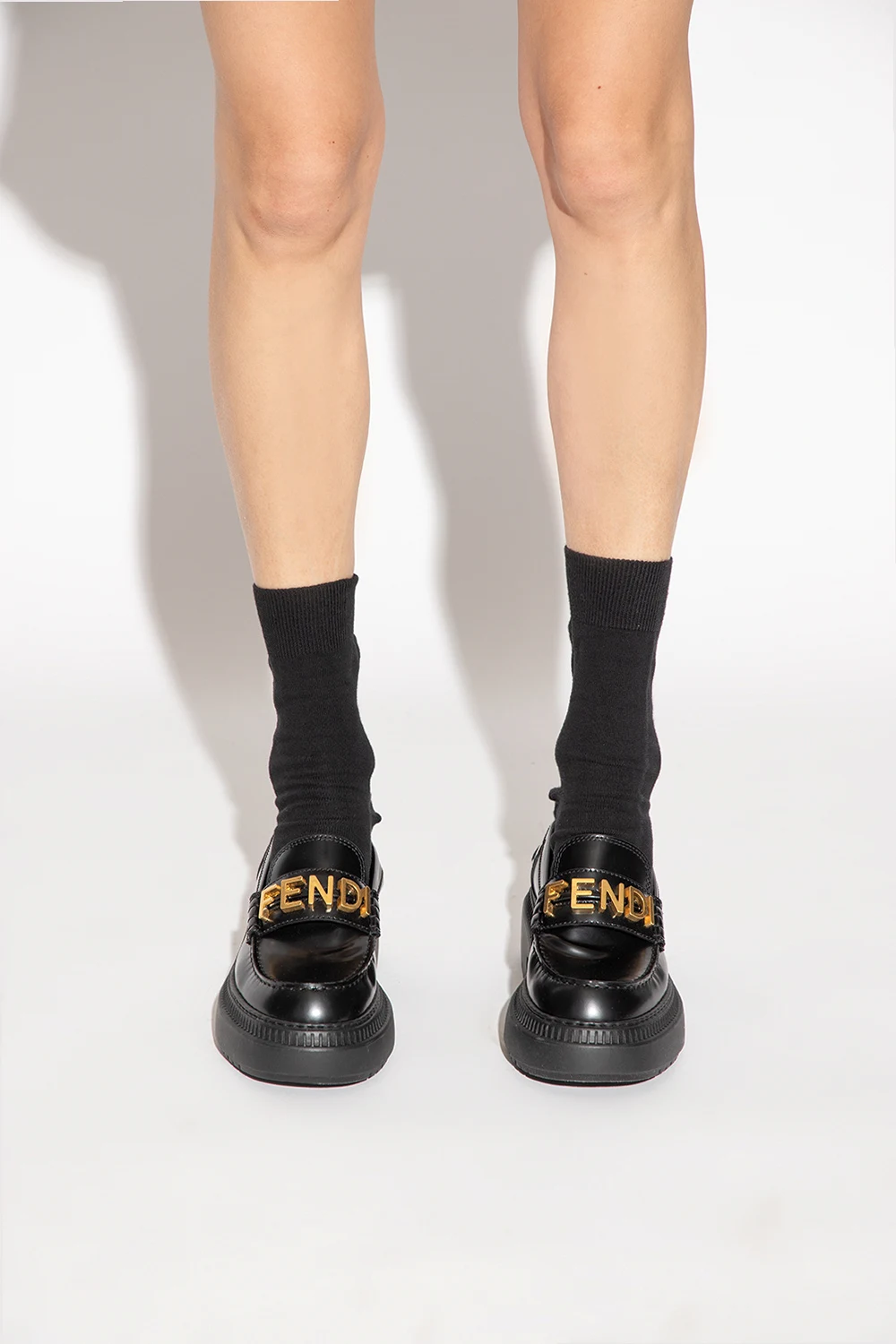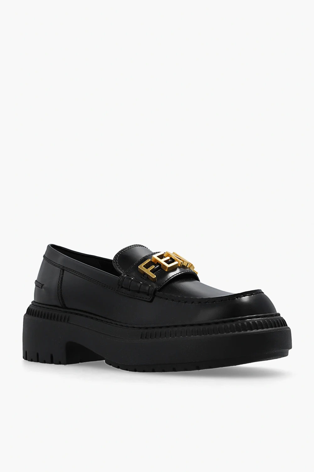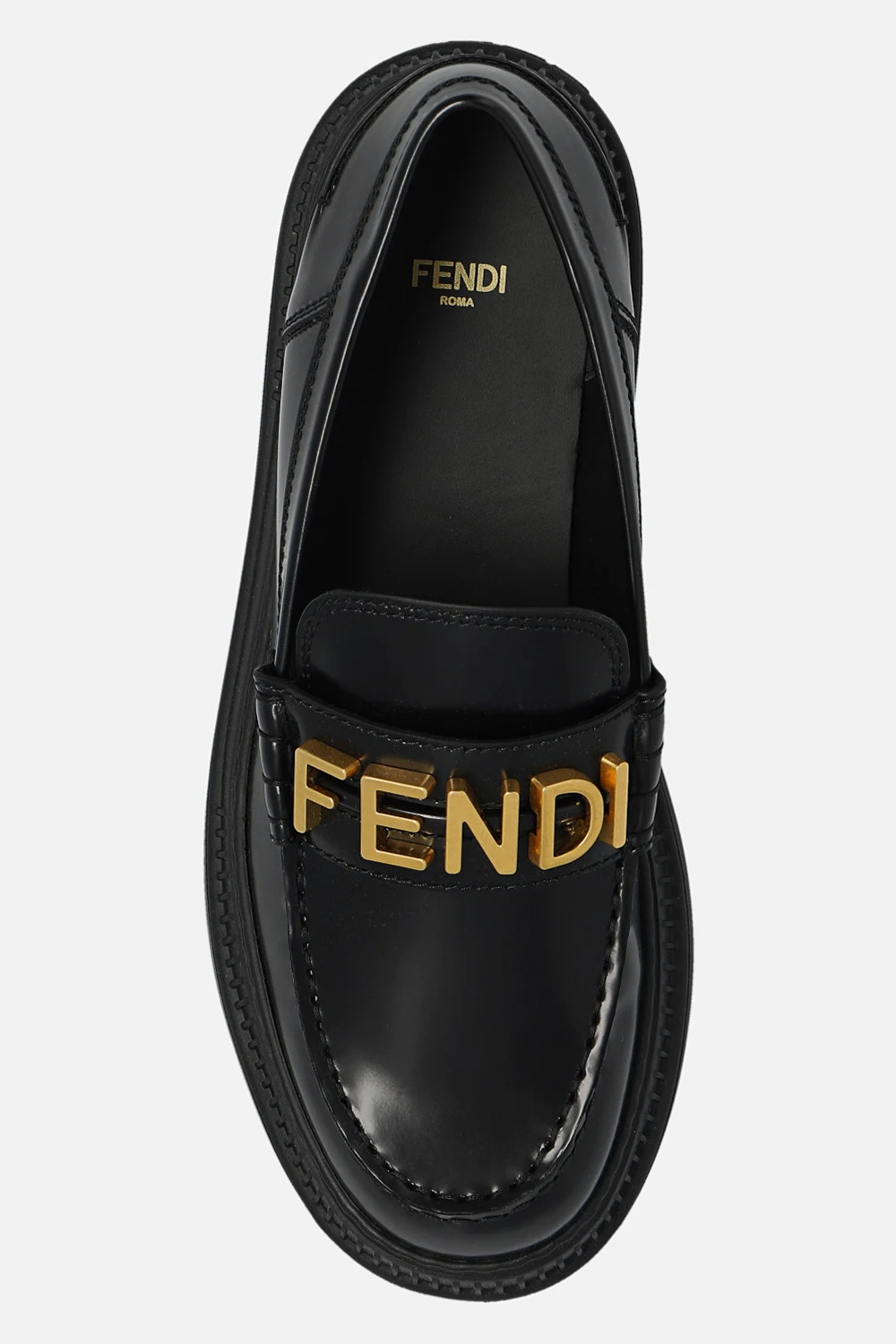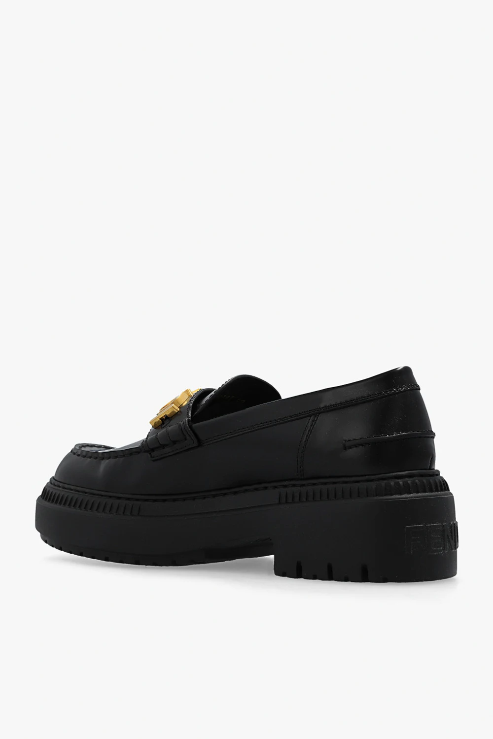 Czarne mokasyny Fendi. Wykonane ze skóry cielęcej. Z przodu metalowa aplikacja w kształcie logo w kolorze złotym. Czarna, gumowa podeszwa.